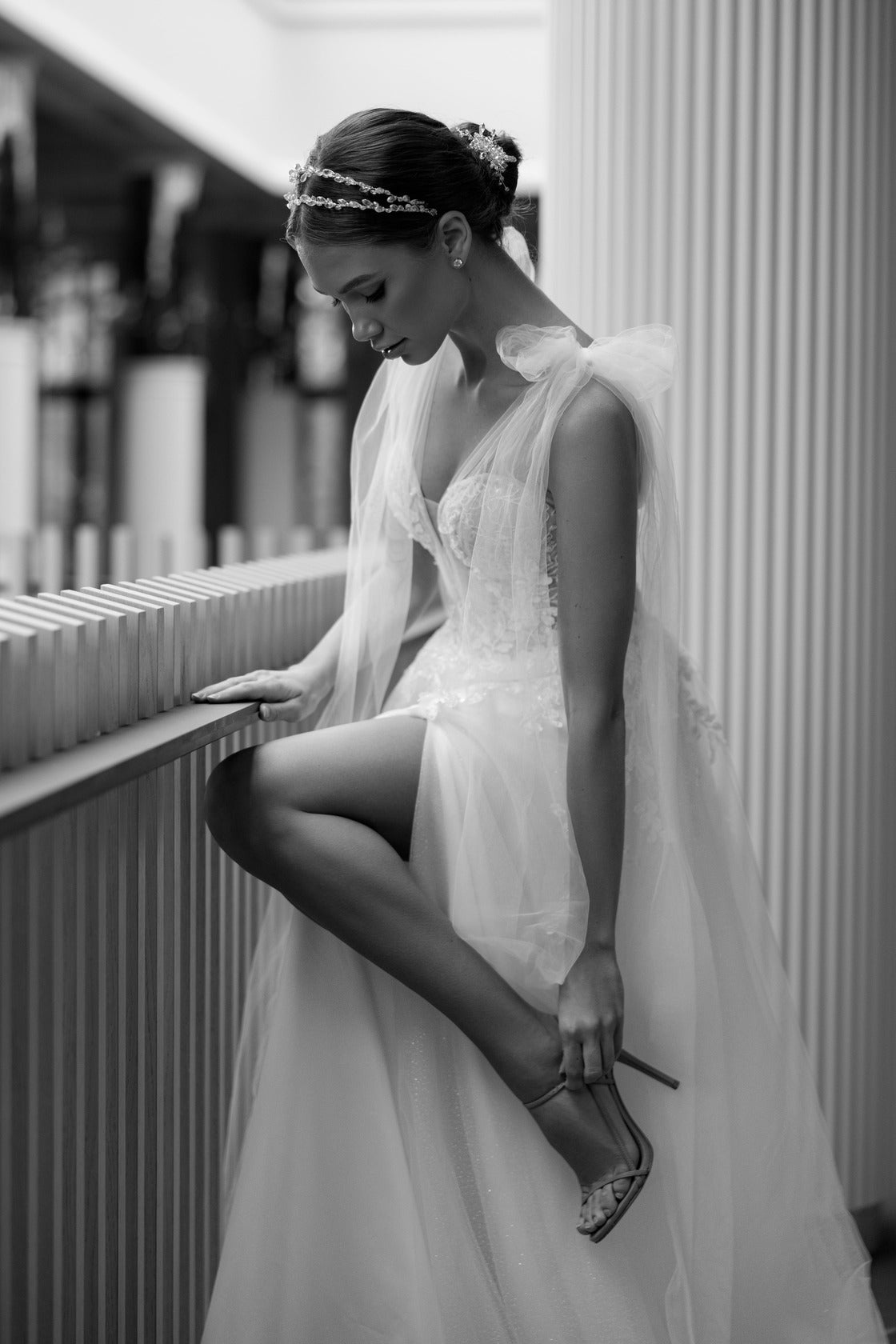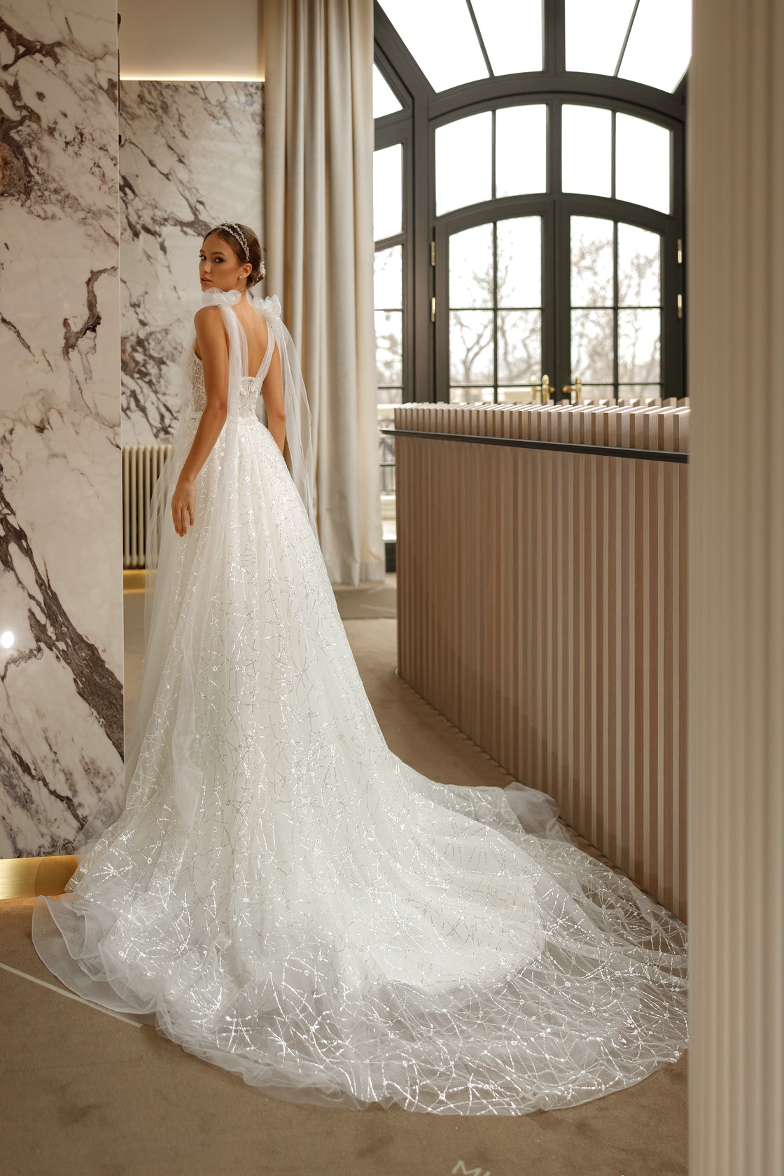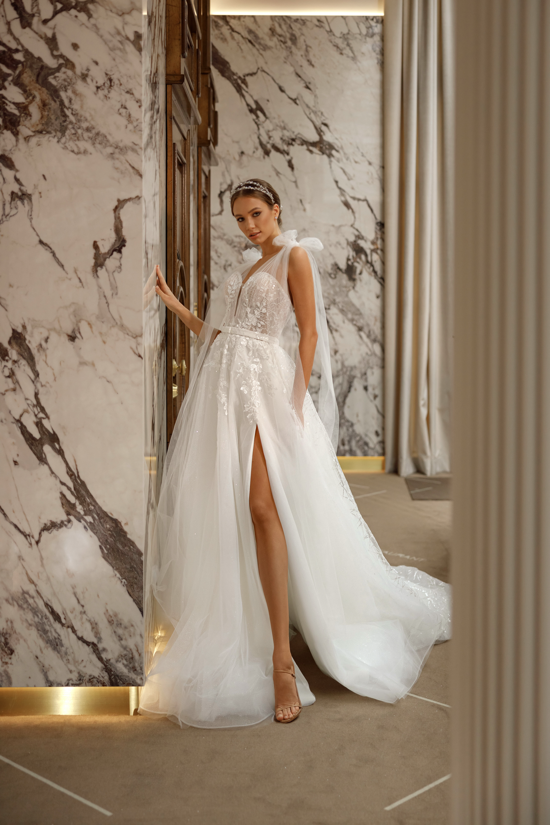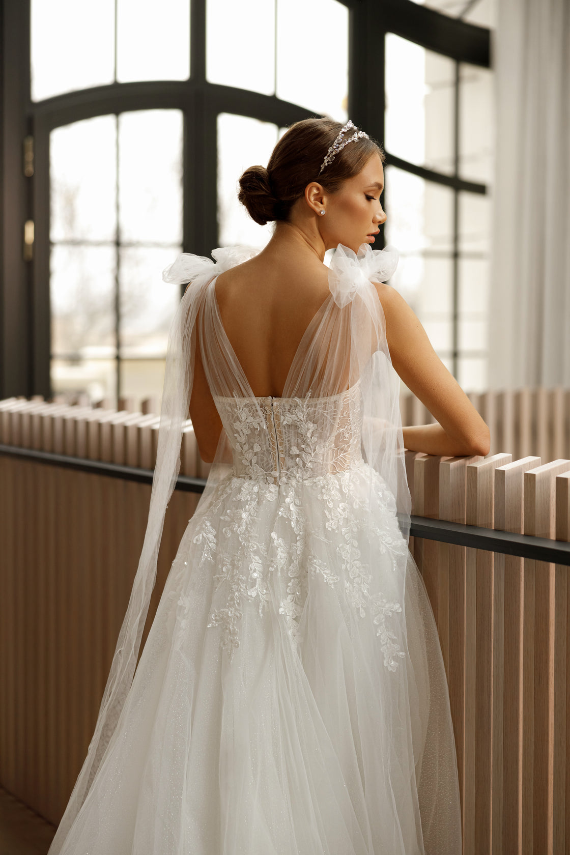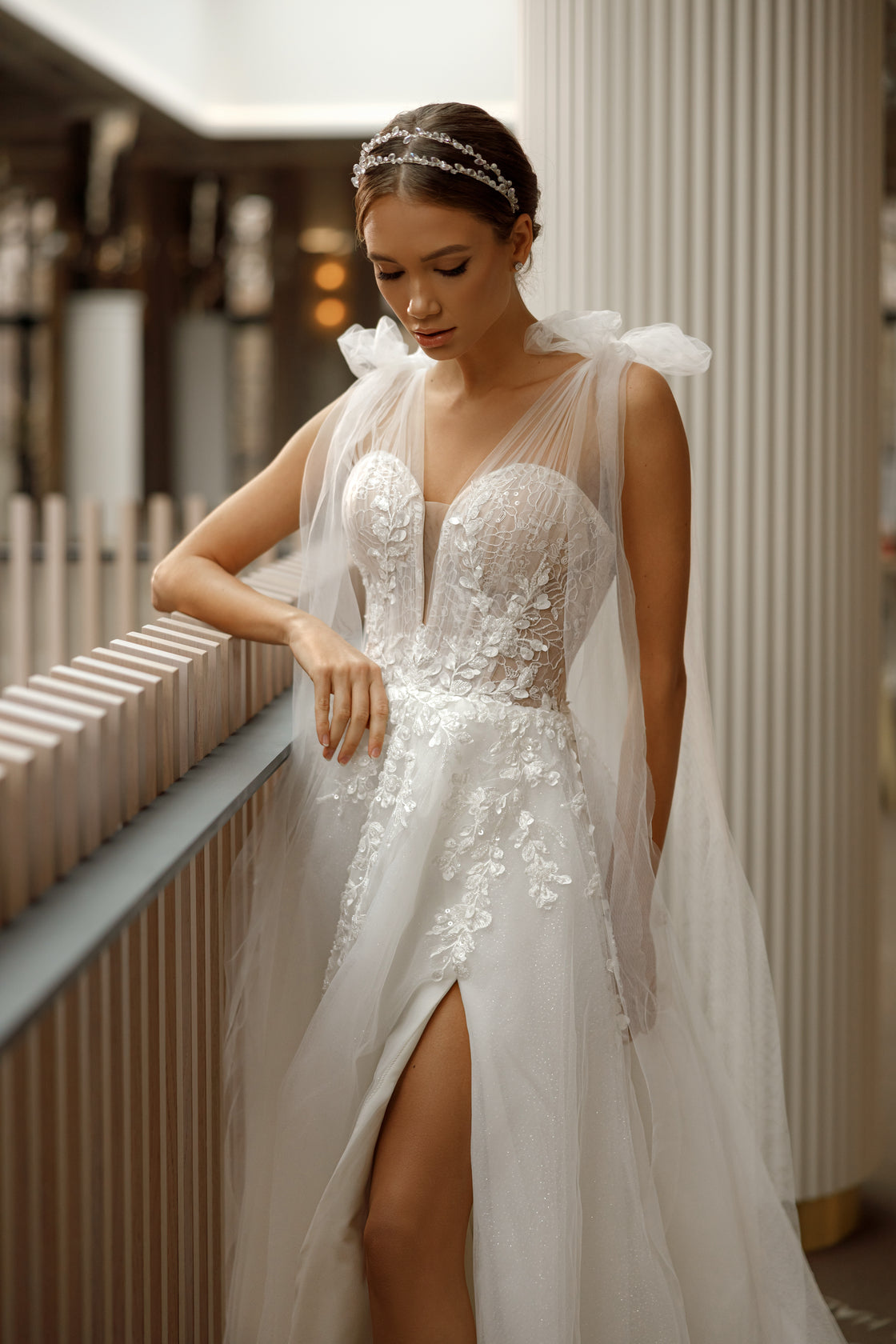 Color and materials: translucent corset in nude color, covered with chantilly and decorated with an original tulle drapery, which goes into the shoulder strap and long bows on the shoulders. The skirt in ivory tulle and glitter with front slit. The dress is decorated with lace, which is embroidered with beads and sequins