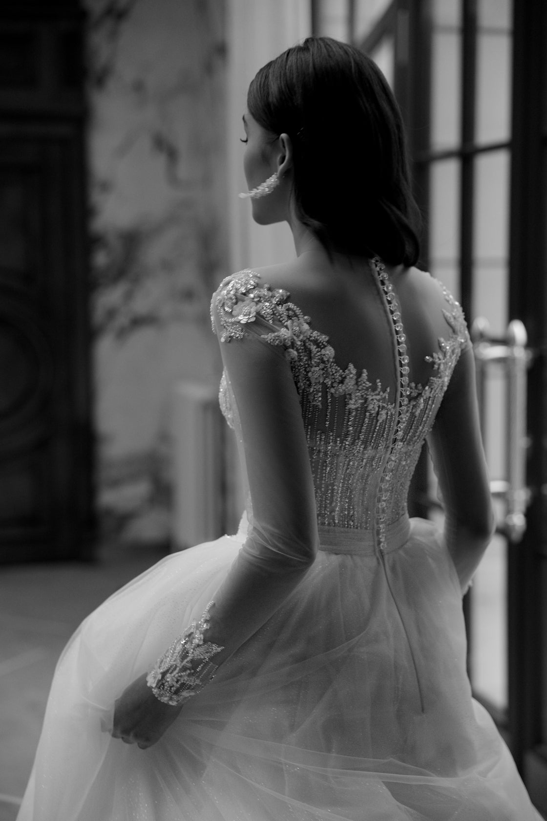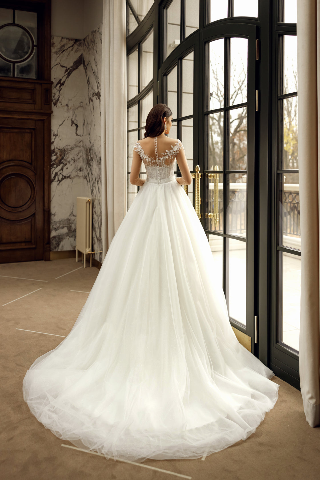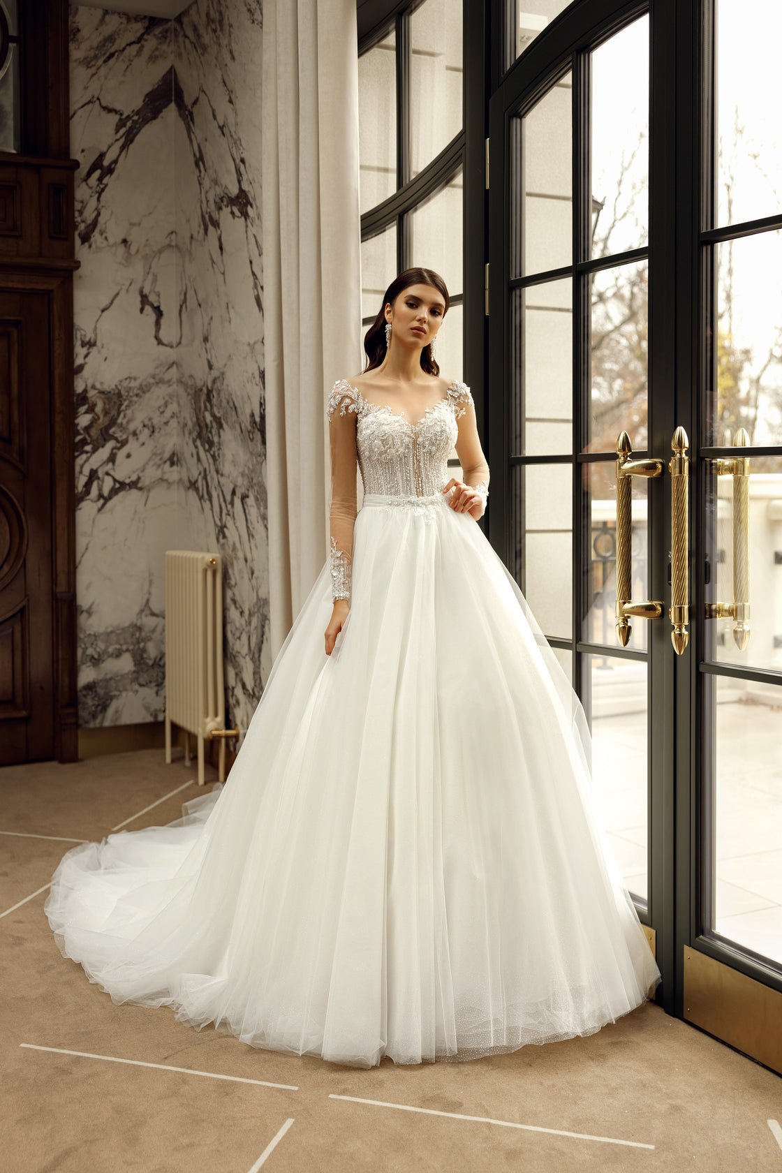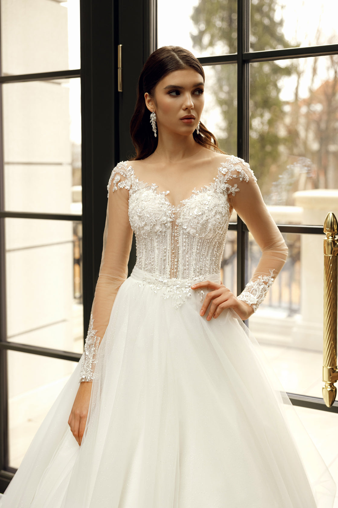 Type of wedding dress: puffy princess style dress with long sleeves.