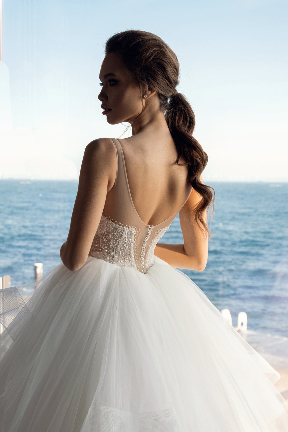 Color and materials: dress has nude transparent corset, which is embroidered with crystals, beeds and stones by our masters, ivory tulle skirt