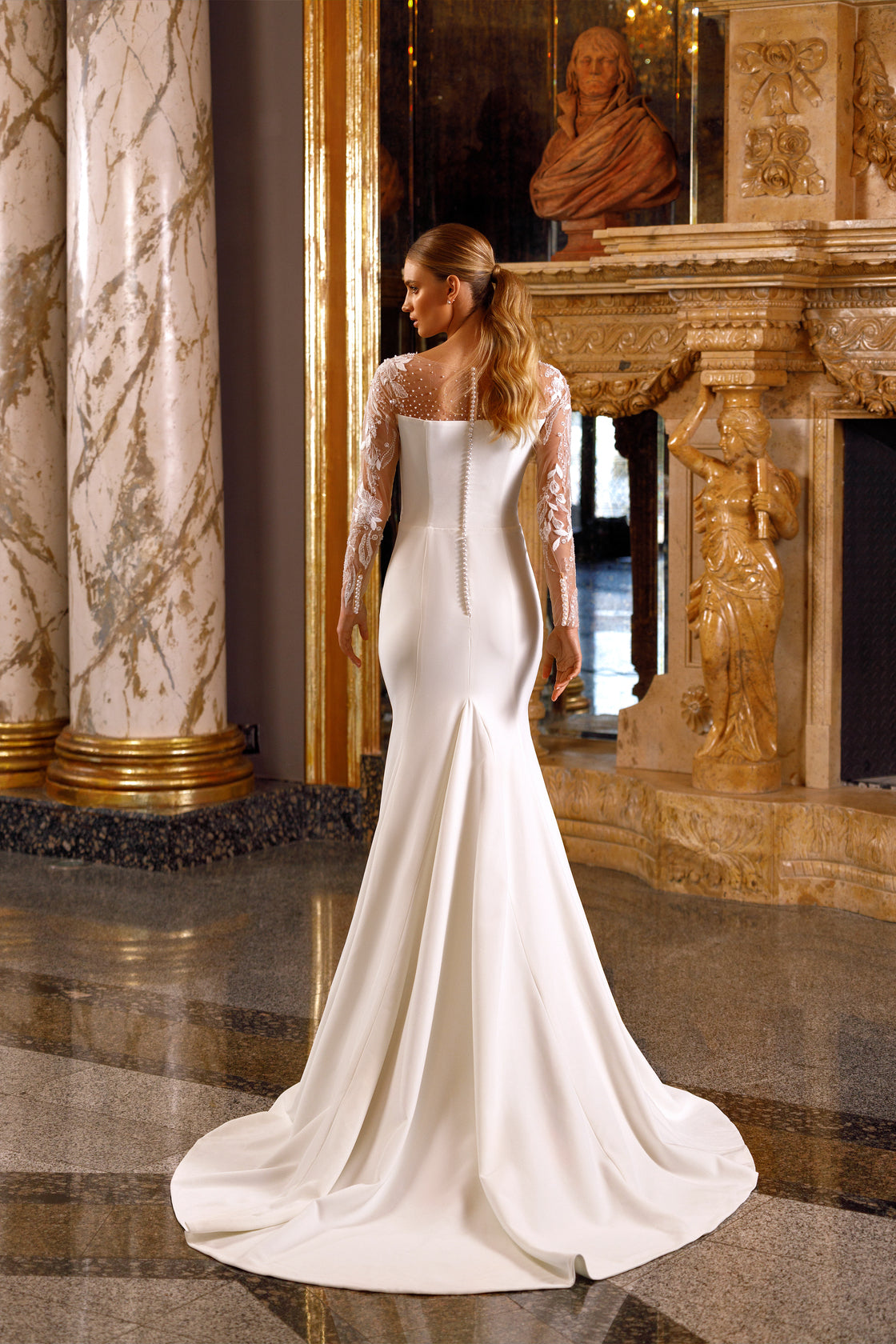 Type of wedding dress: mermaid dress with long sleeves.