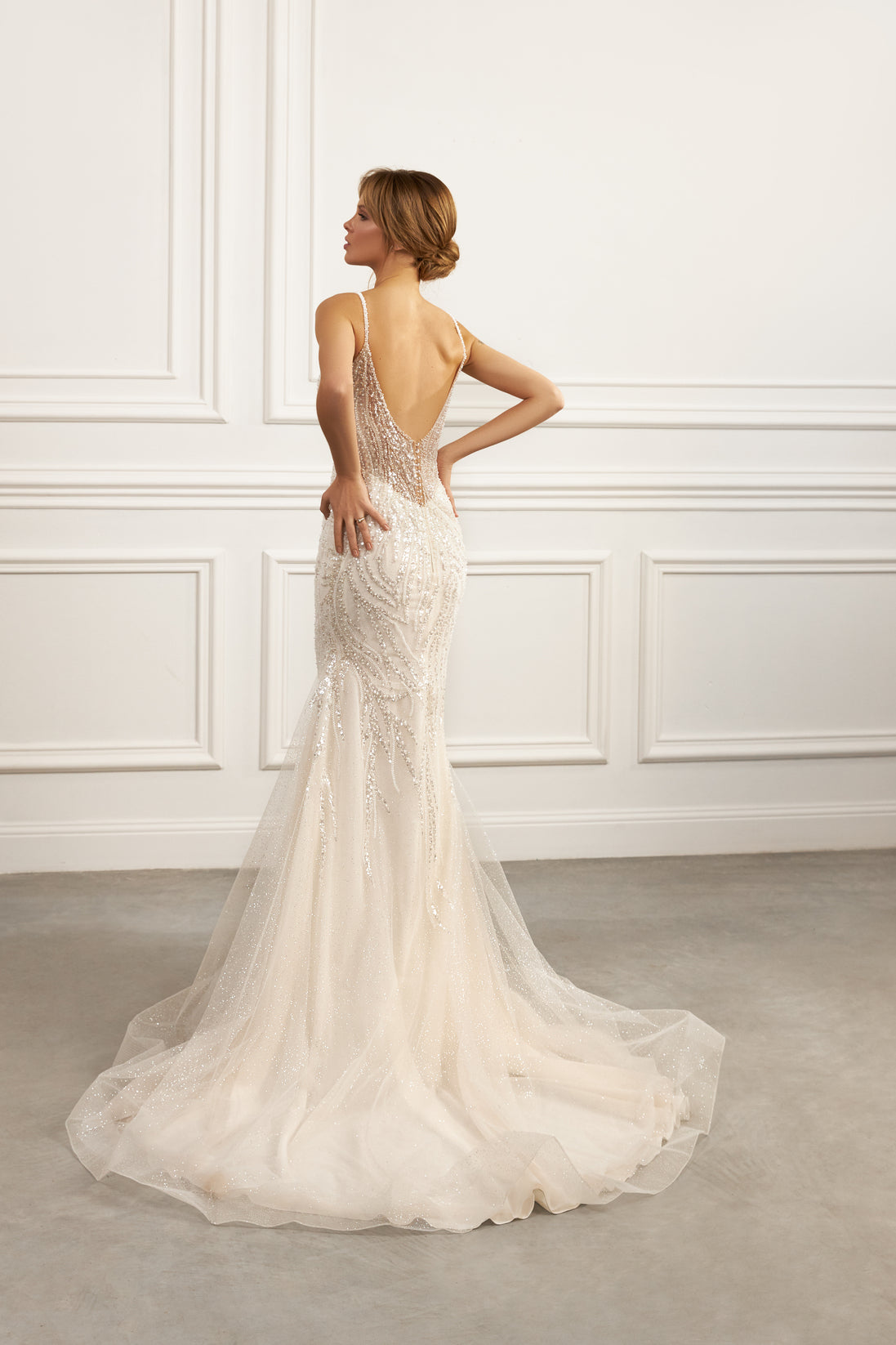 Shine with elegance in this stunning sleeveless mermaid gown, featuring a plunging V-neckline and intricate beadwork that creates a dazzling effect. The dress showcases a fitted silhouette that enhances your curves and a flowing tulle skirt that adds a touch of grandeur. Ideal for brides who want to make a memorable statement, this dress combines modern sophistication with timeless beauty.