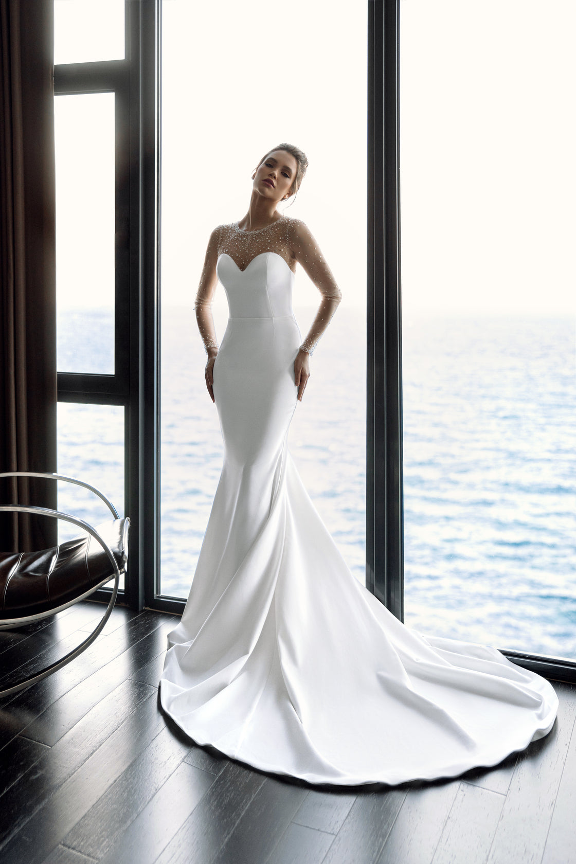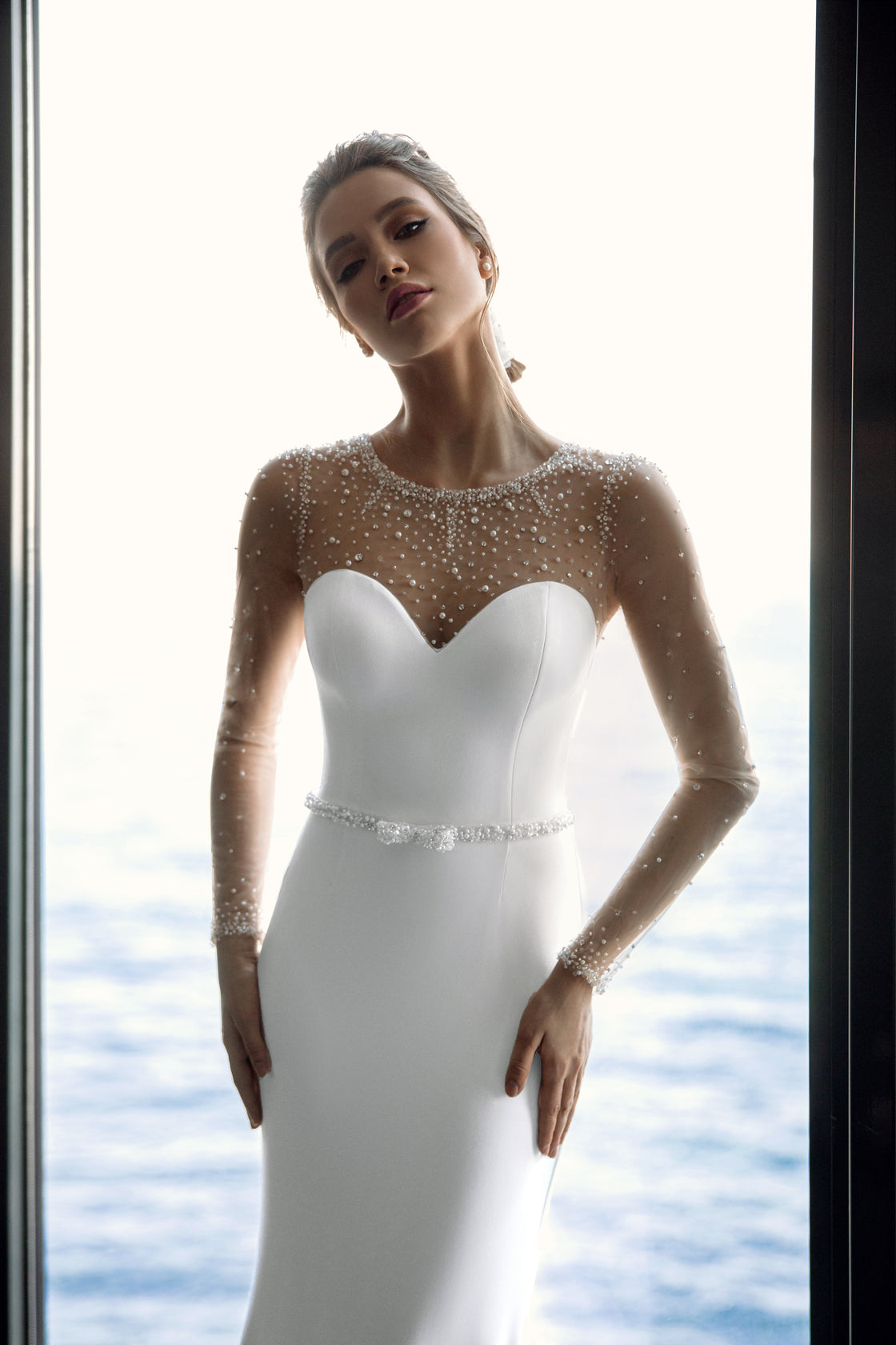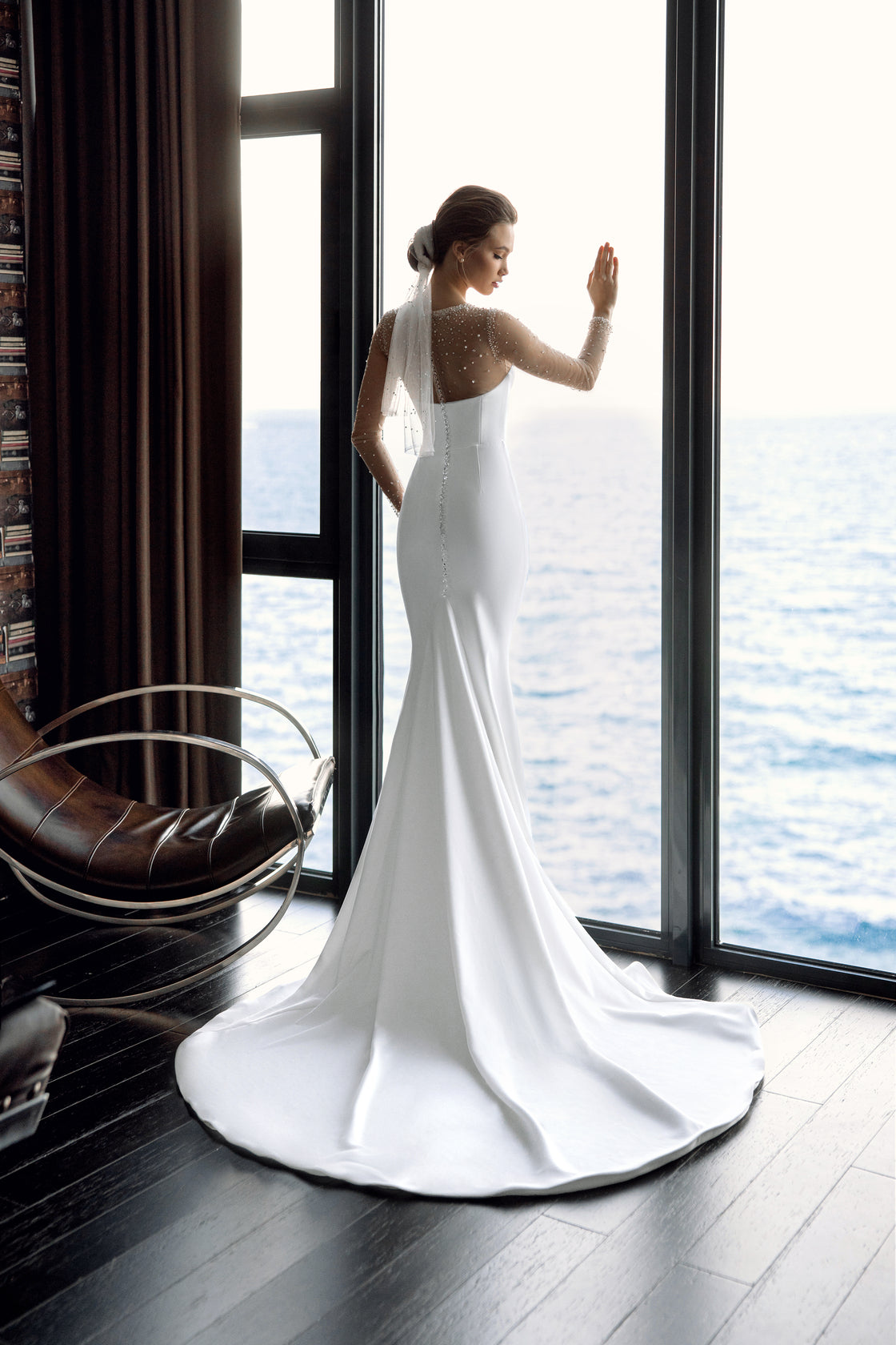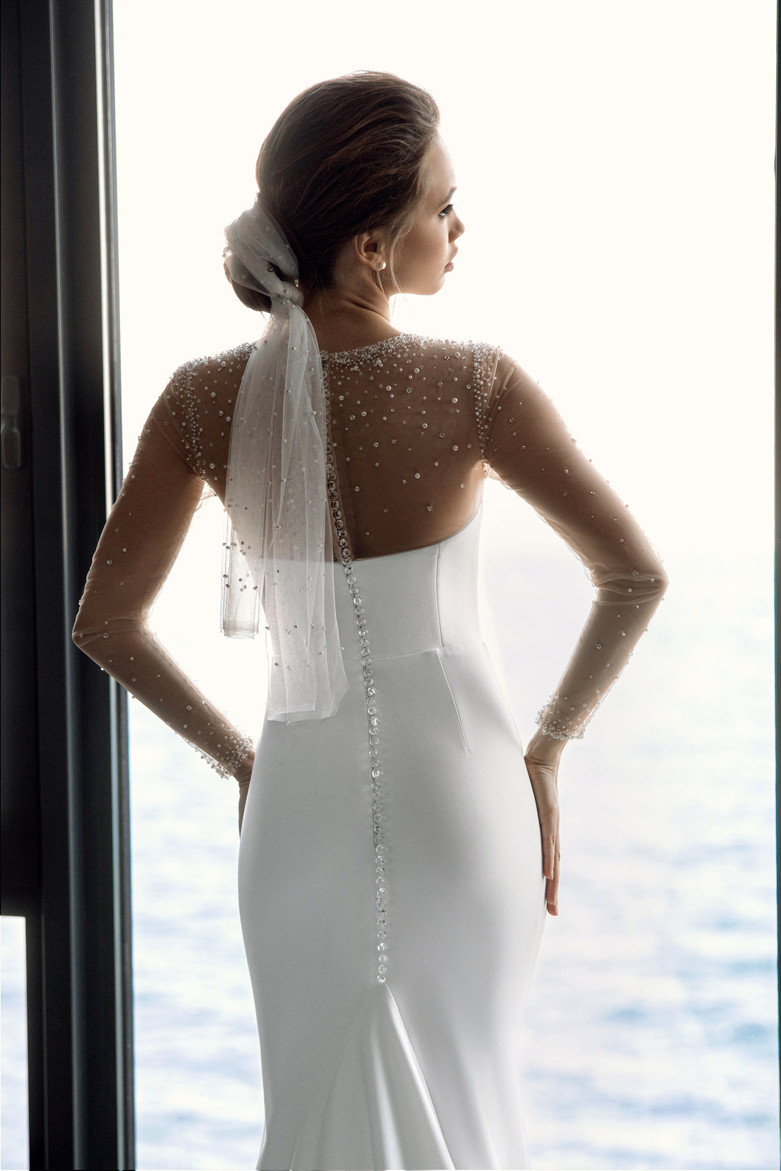 Color and materials: ivory dress made from stretch satin with nude net over the corset, which is embroidered with crystals, beeds and stones by our masters