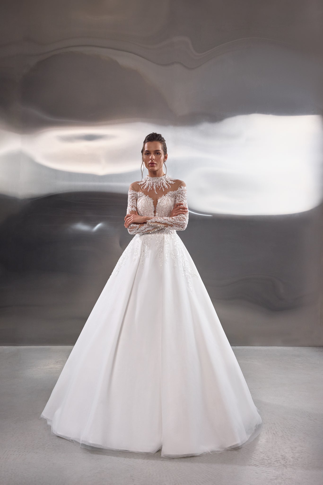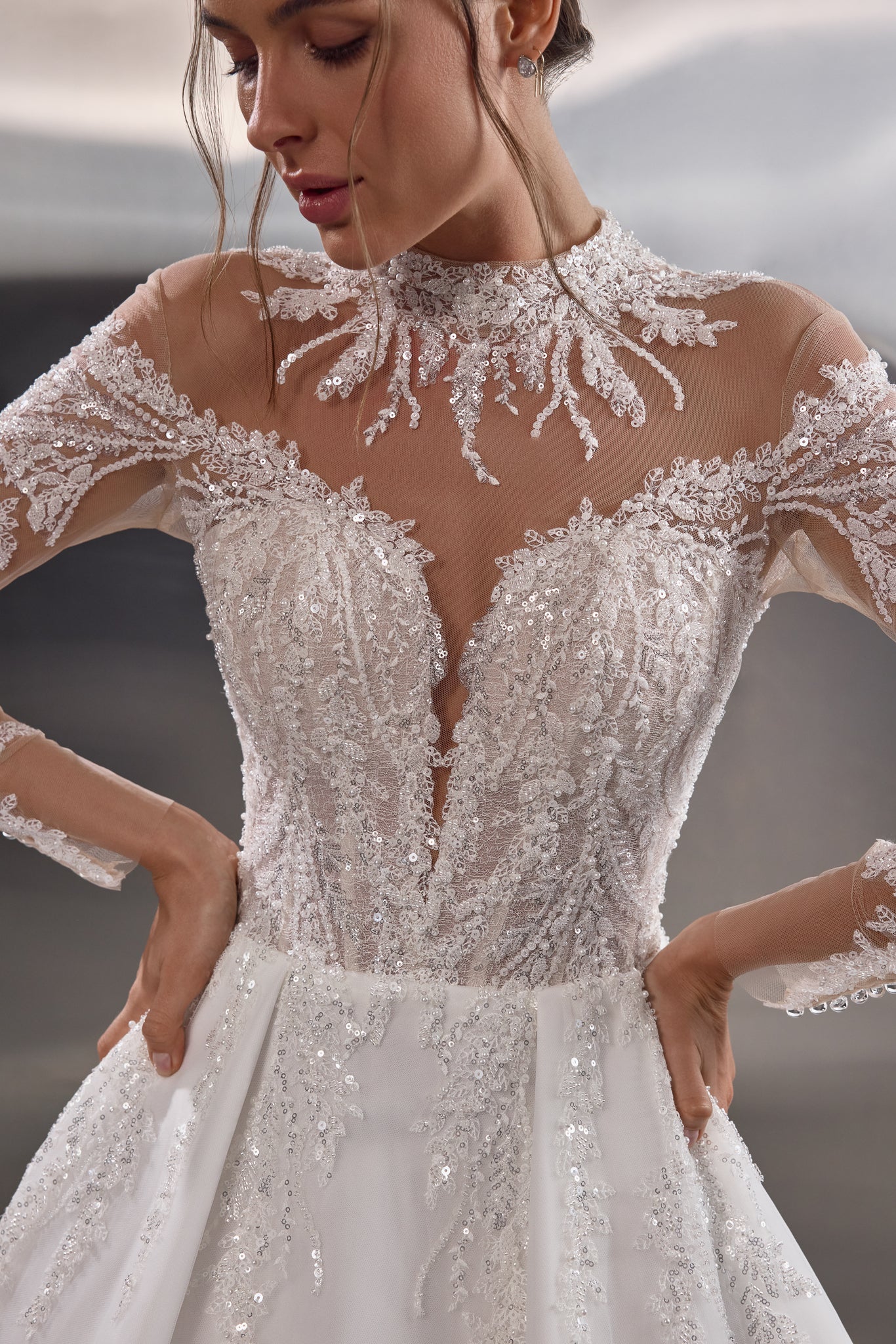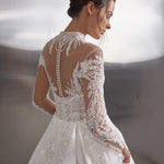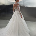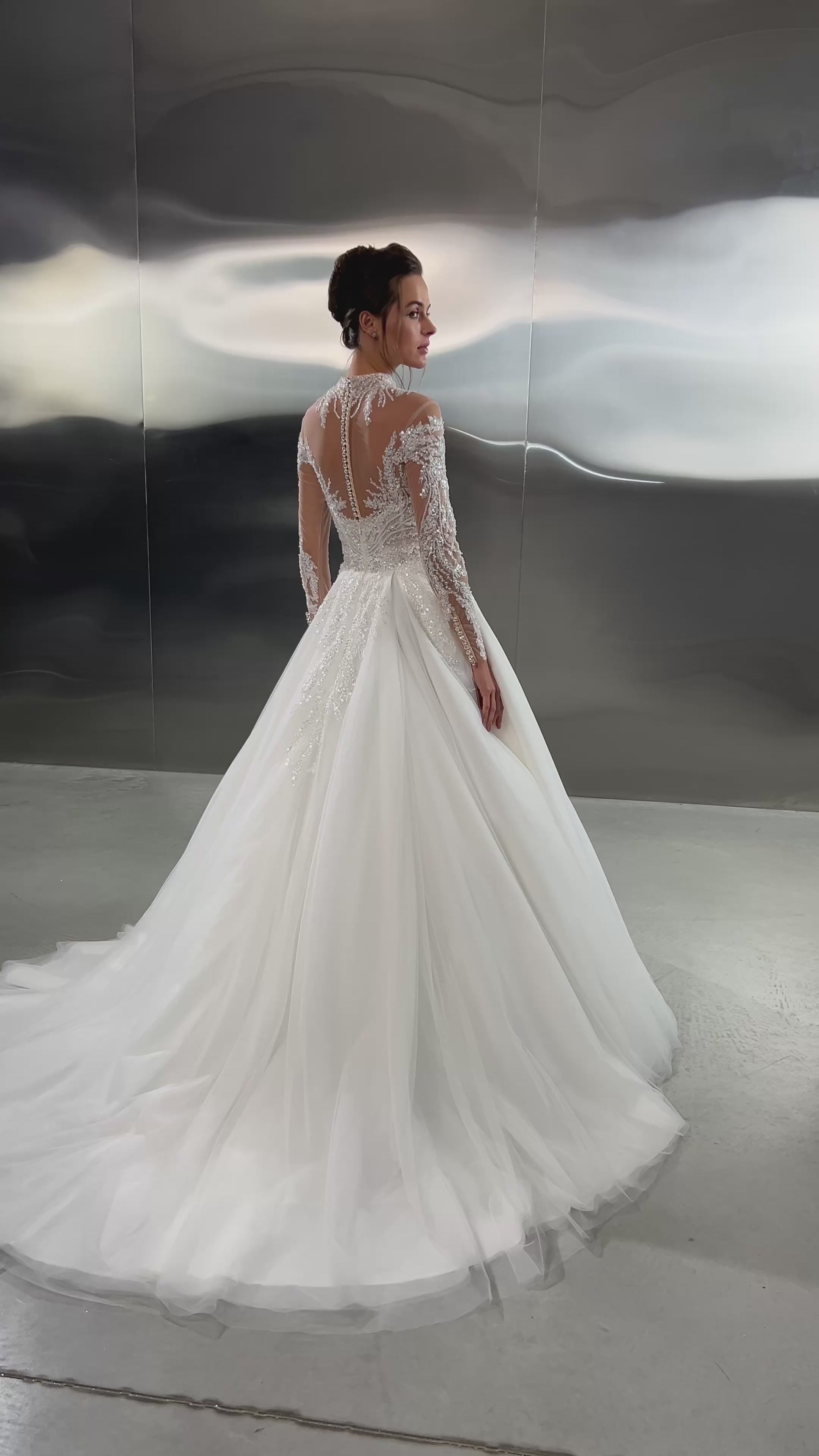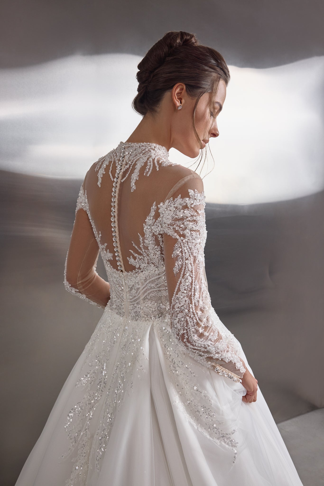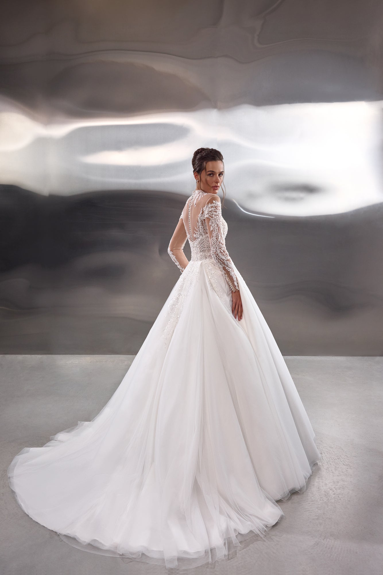 • Design: Long-sleeve ball gown wedding dress with chapel-length train