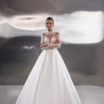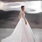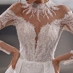 Make an unforgettable entrance in this breathtaking long-sleeve ball gown wedding dress, a true statement of royal elegance. The illusion neckline is delicately adorned with intricate lace appliqués and shimmering beadwork, creating a regal and feminine frame for the face and shoulders. The fitted bodice extends into a dramatic full ball gown skirt crafted from layers of luxurious tulle, flowing into an elegant chapel-length train. Sheer lace sleeves add timeless sophistication, while subtle sequins catch the light with every movement. Perfect for a grand church wedding or a lavish reception, this gown is designed for brides who dream of a majestic and unforgettable bridal look.