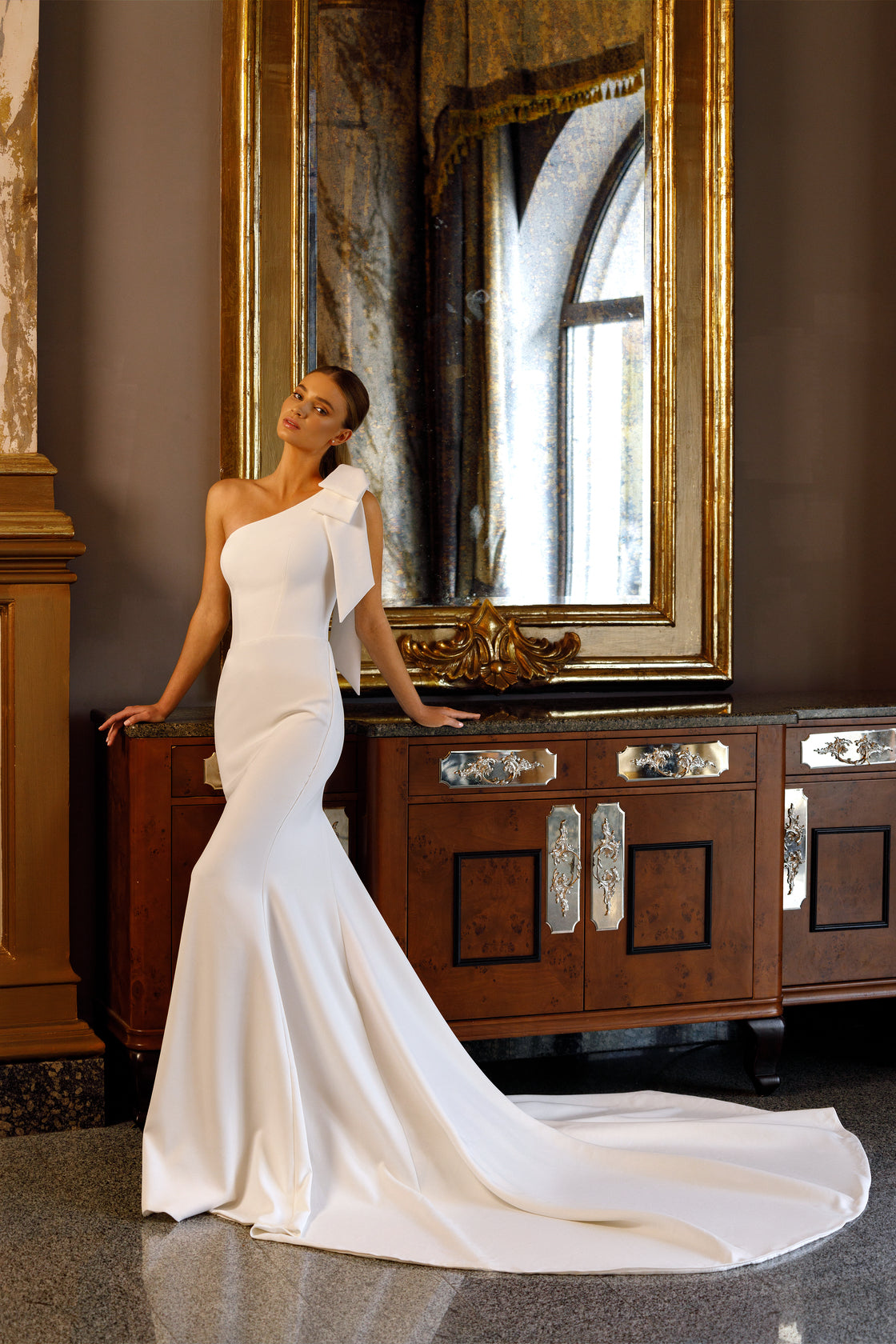 Color and Materials: Ivory dress made of stretch crepe satin. The dress is decorated with a bow on the shoulders.