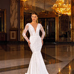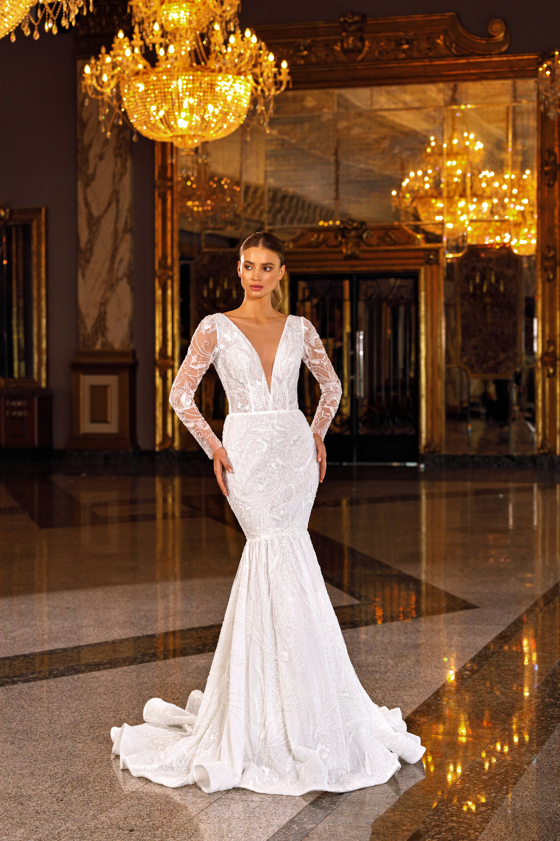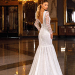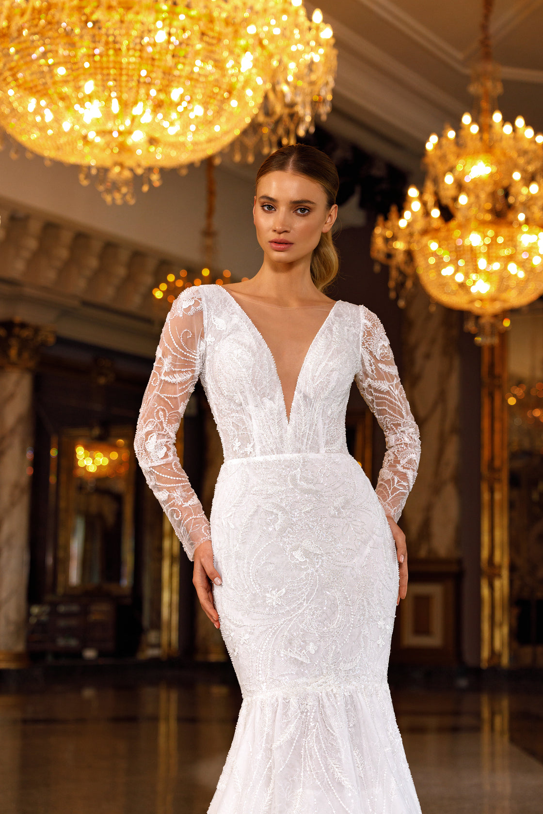 Color and materials: ivory dress body mesh neckline insert. The neckline and back are embroidered with beads and sequins. The corset and skirt are covered with chantilly. The corset has a delicate tulle drape. The dress is decorated with lace, which was embroidered with beads and sequins.