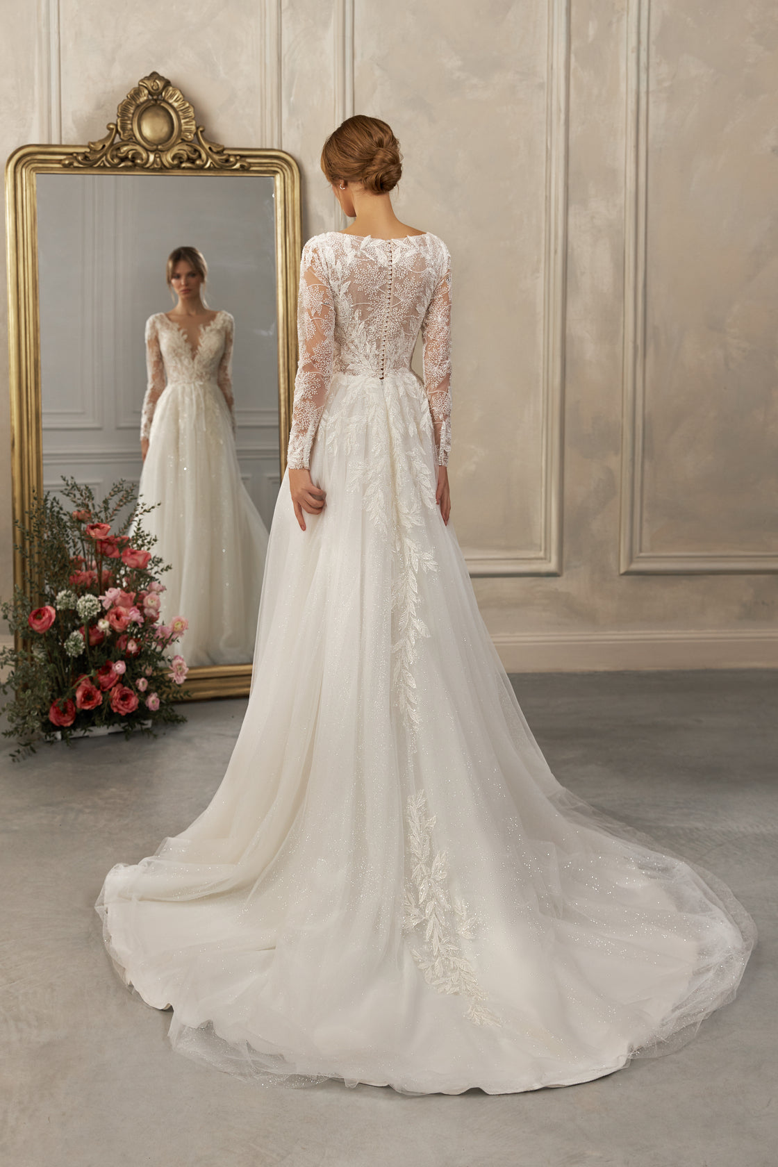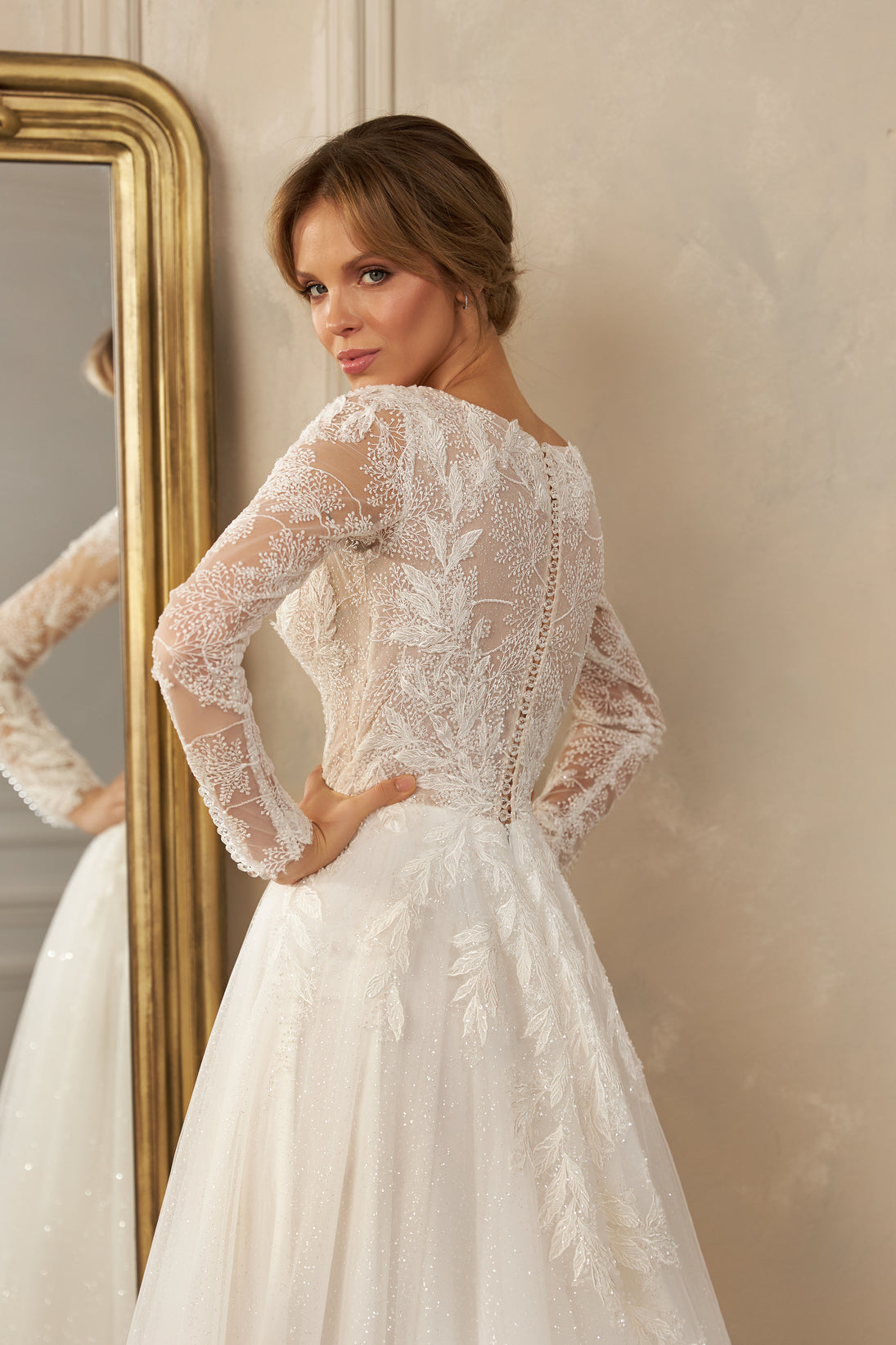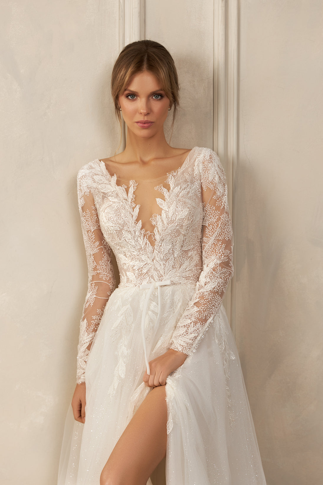 Radiate sophistication with this stunning long-sleeve A-line gown, featuring a plunging V-neckline and intricate floral lace appliqués. The dress showcases sheer lace sleeves and a fitted bodice that seamlessly transitions into a flowing skirt with a high slit, adding a touch of modern elegance to a classic silhouette. Perfect for weddings, formal events, and special occasions, this dress is designed to captivate and impress.
