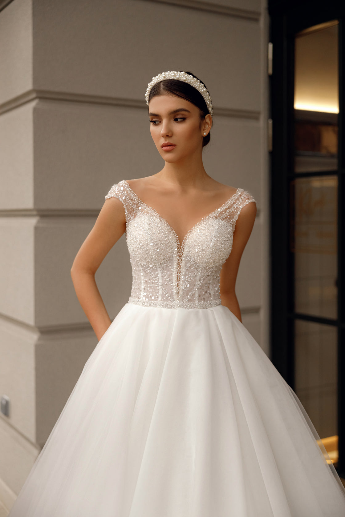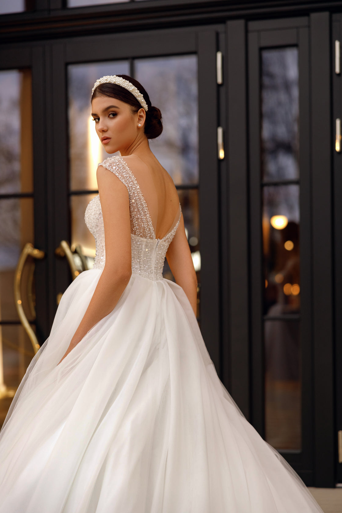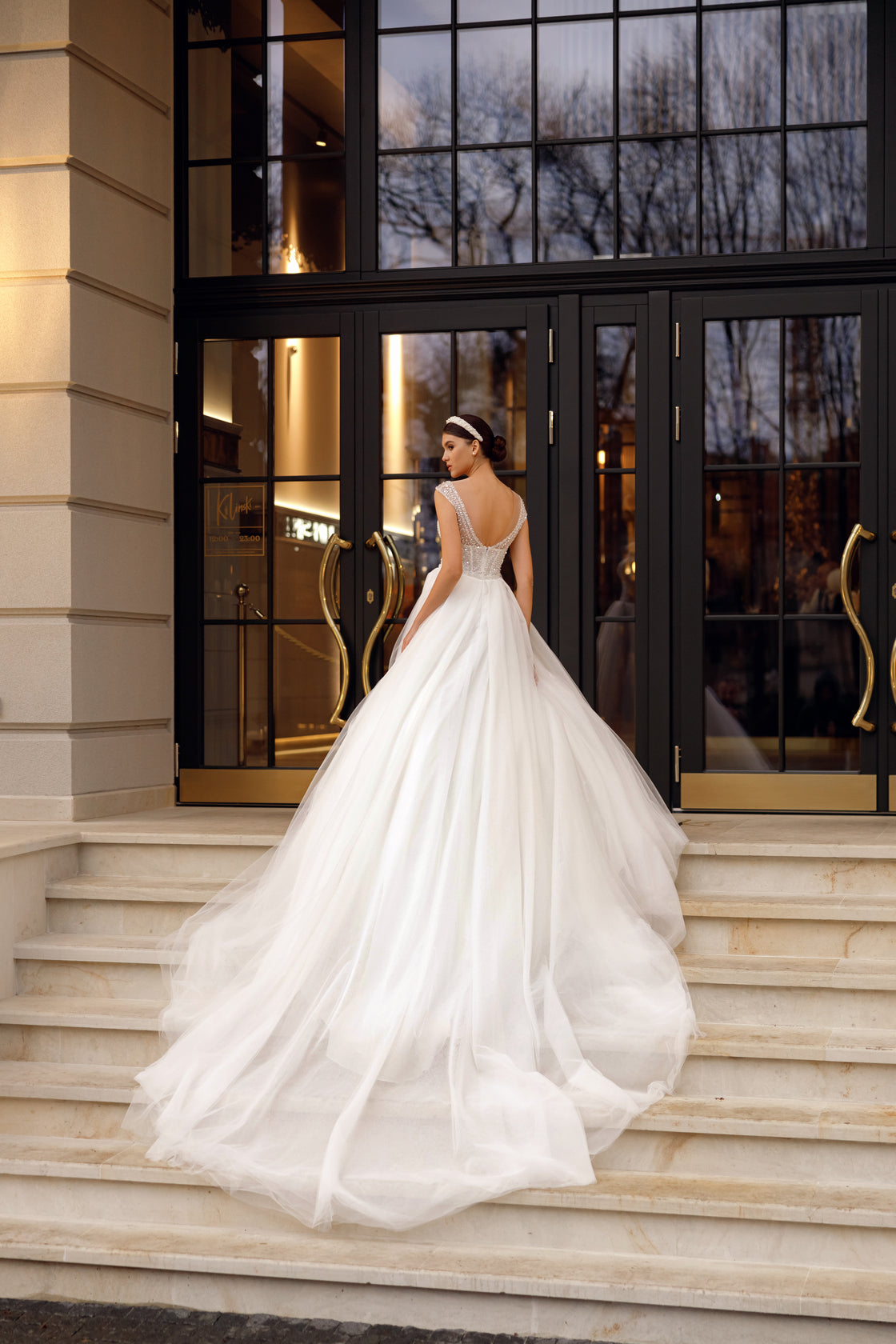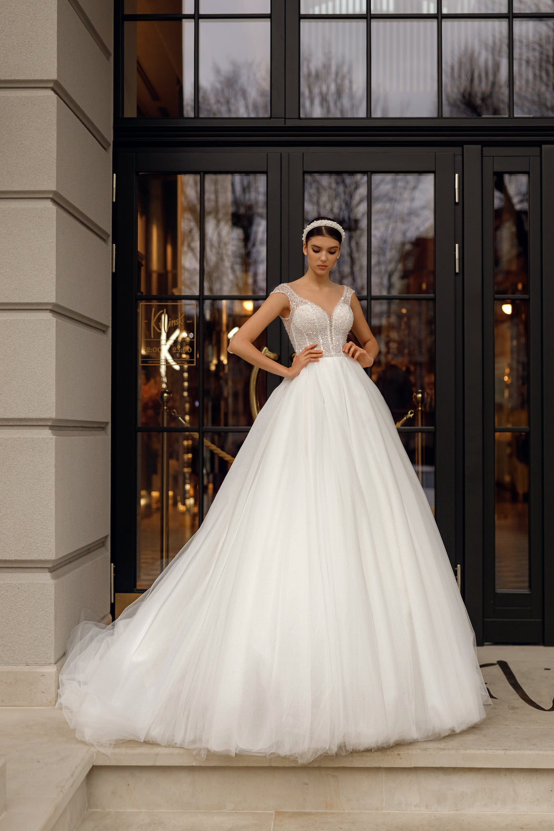 Type of wedding dress: puffy princess-style dress, sleeveless.
