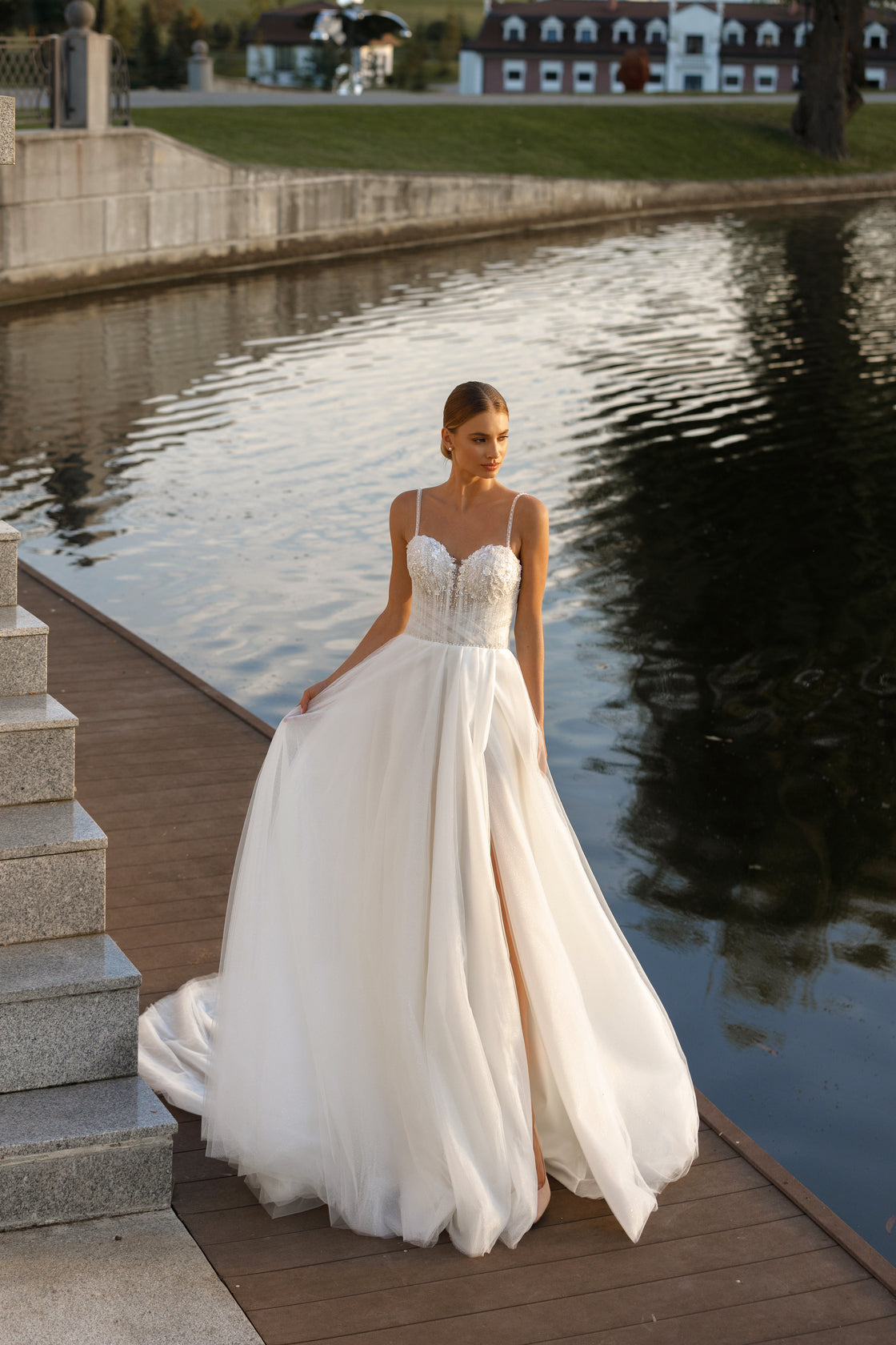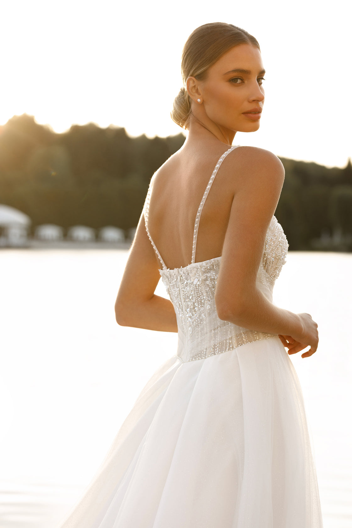 The waist is accentuated with an embroidered belt. Skirt made of weightless tulle and glitter, with a slit.