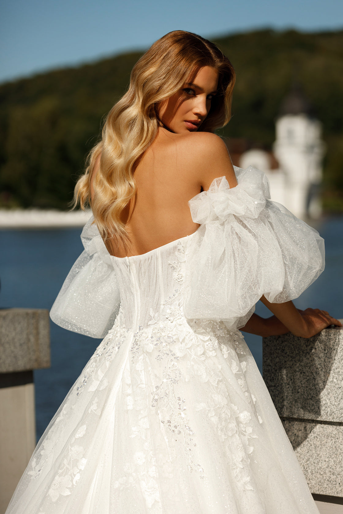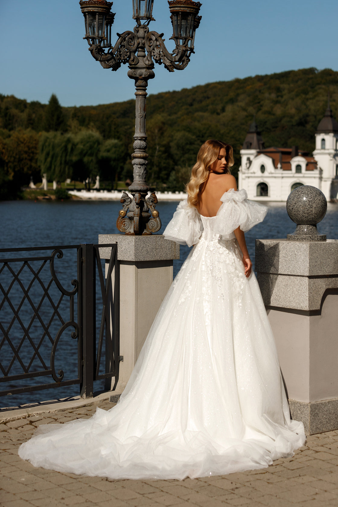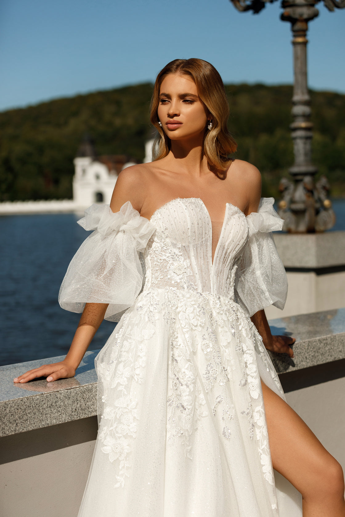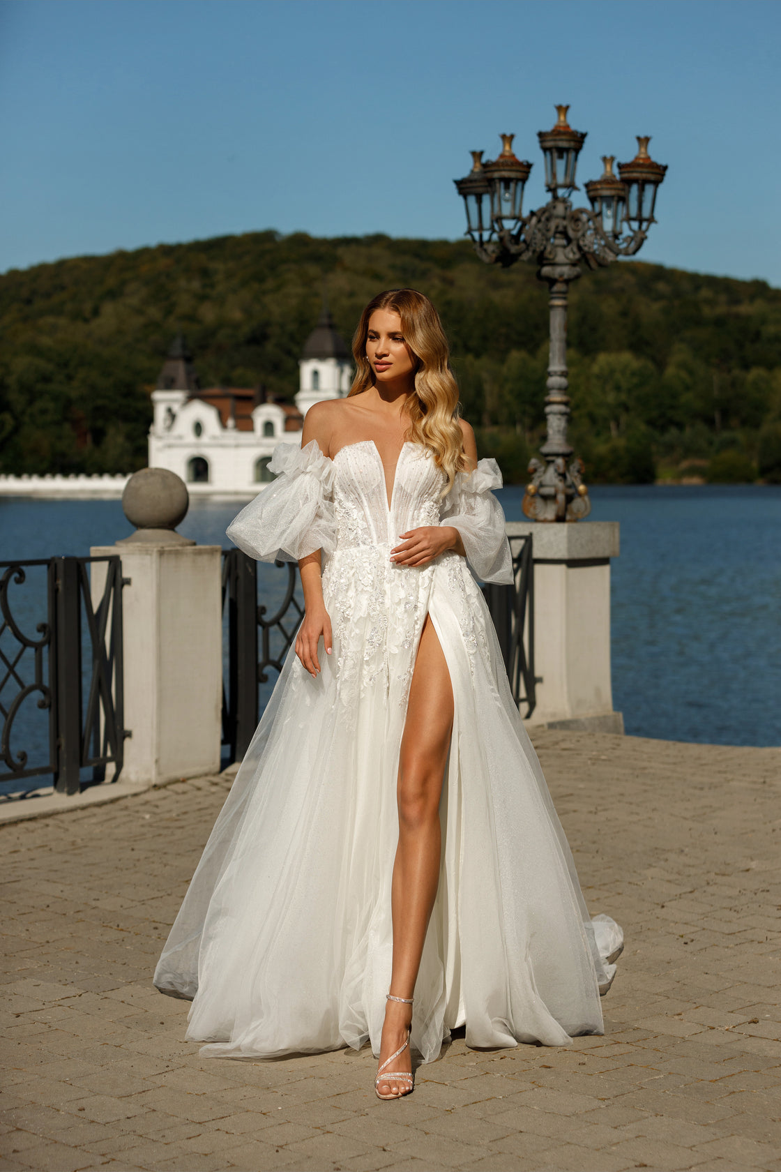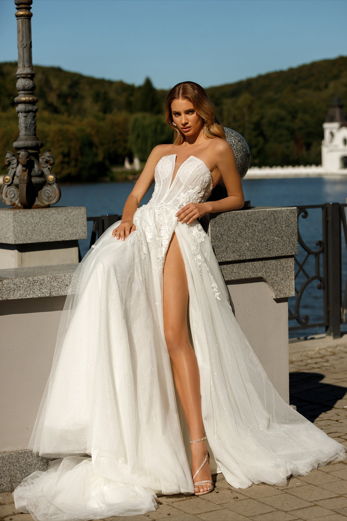 Colors and materials: ivory color dress, nude mesh insert at the neckline. Translucent corset, decorated with lace, embroidered with stones, beads, pearls and sequins. The corset is lightly draped with tulle. Skirt made of tulle and glitter, decorated with lace, which is embroidered with beads and sequins. Skirt with a slit.