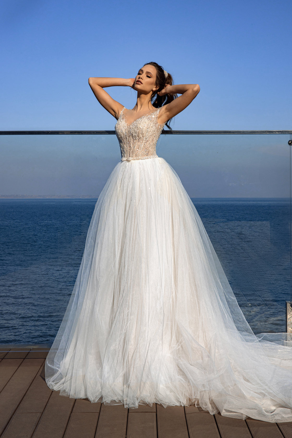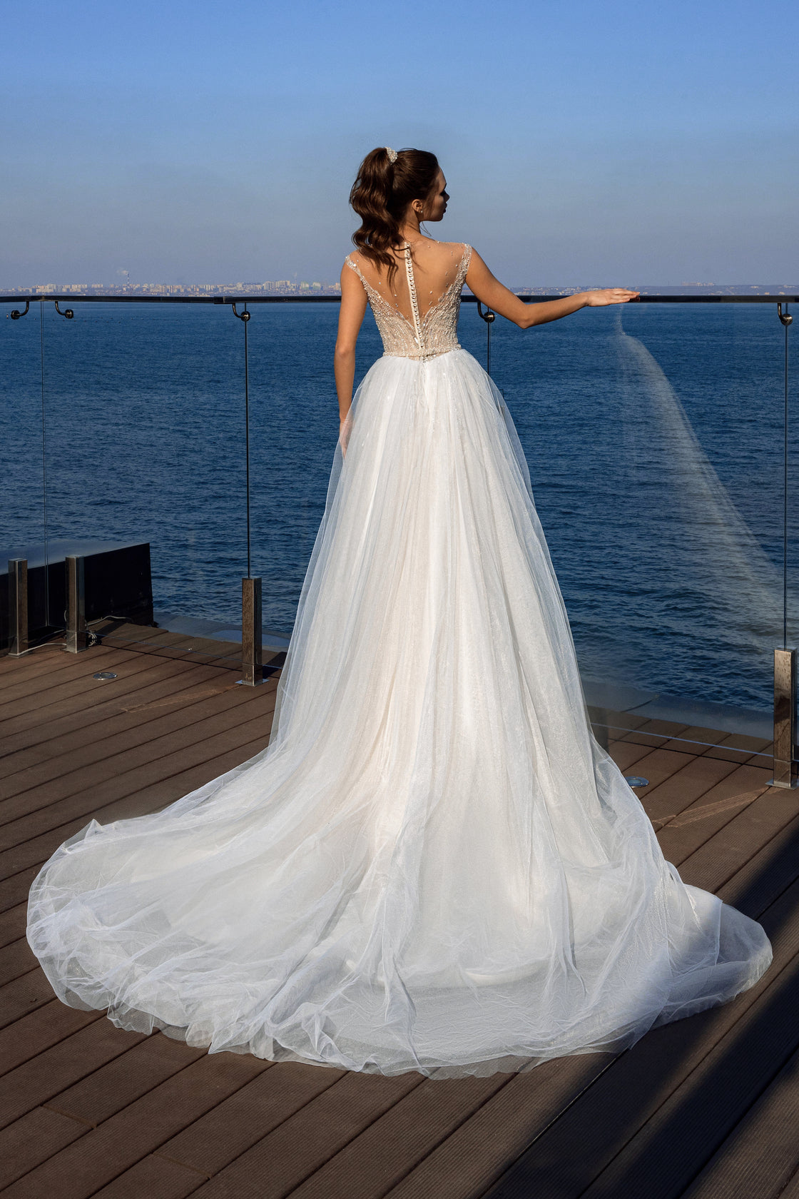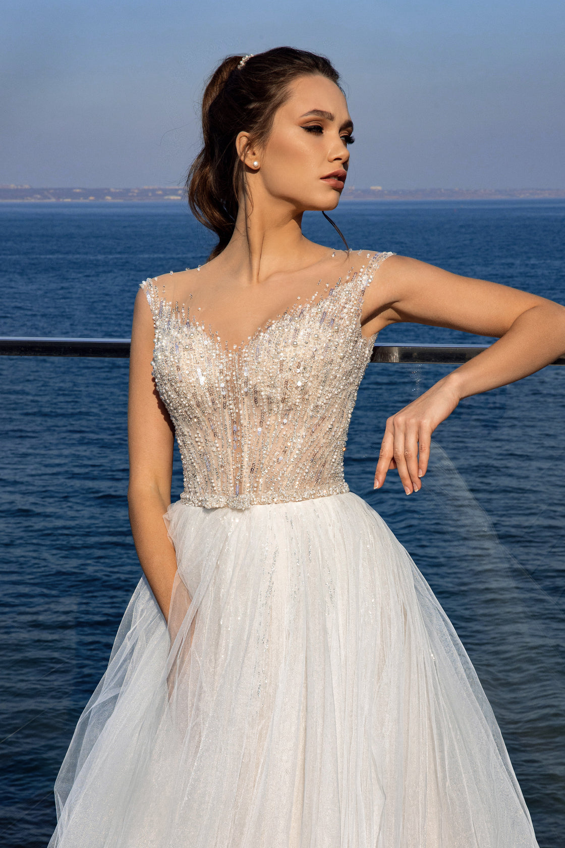 Color and materials: dress has nude transparent corset, which is embroidered with pearls, crystals, beeds, stones and sequins by our masters, nude tulle skirt with glitter elements