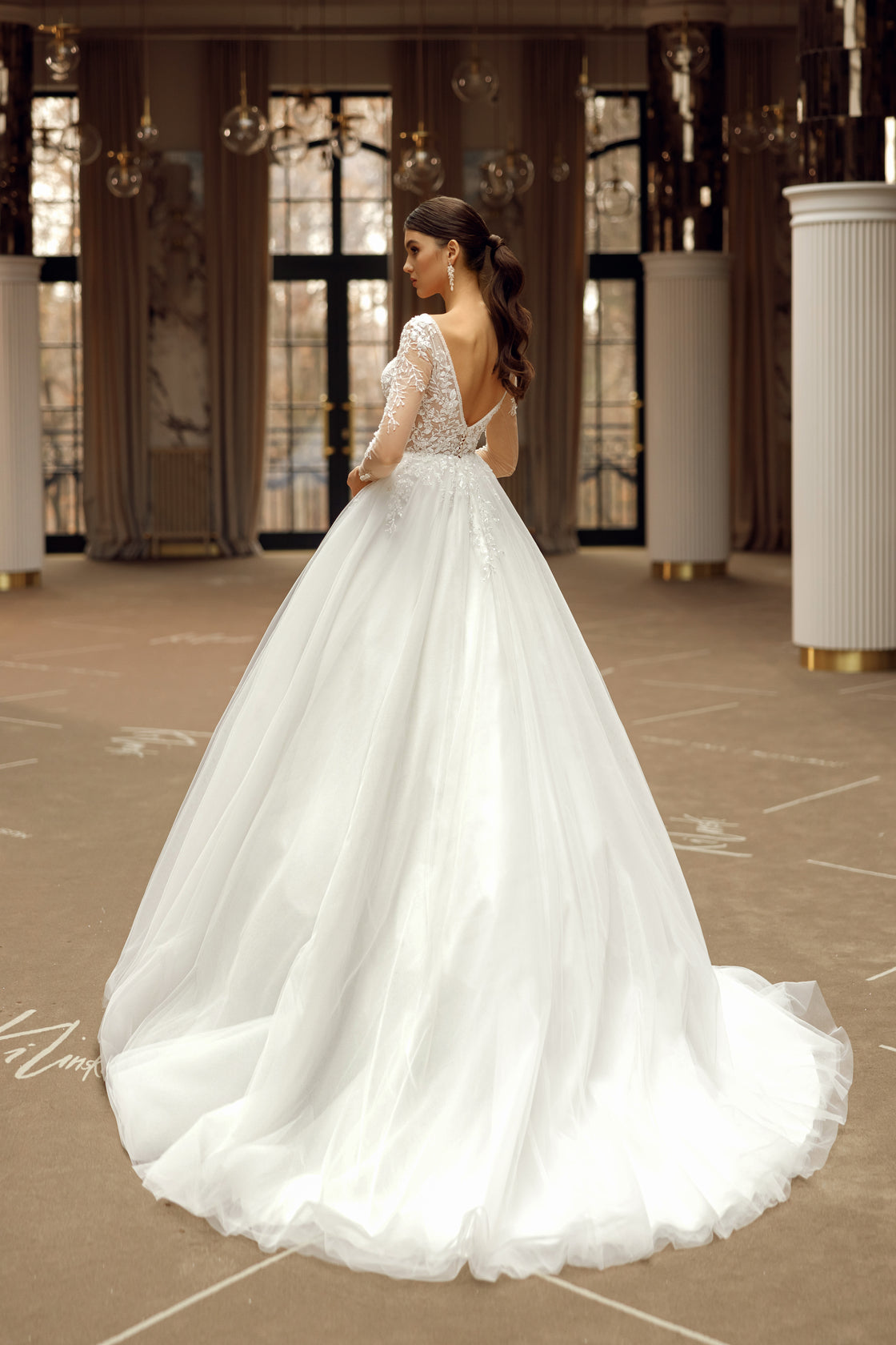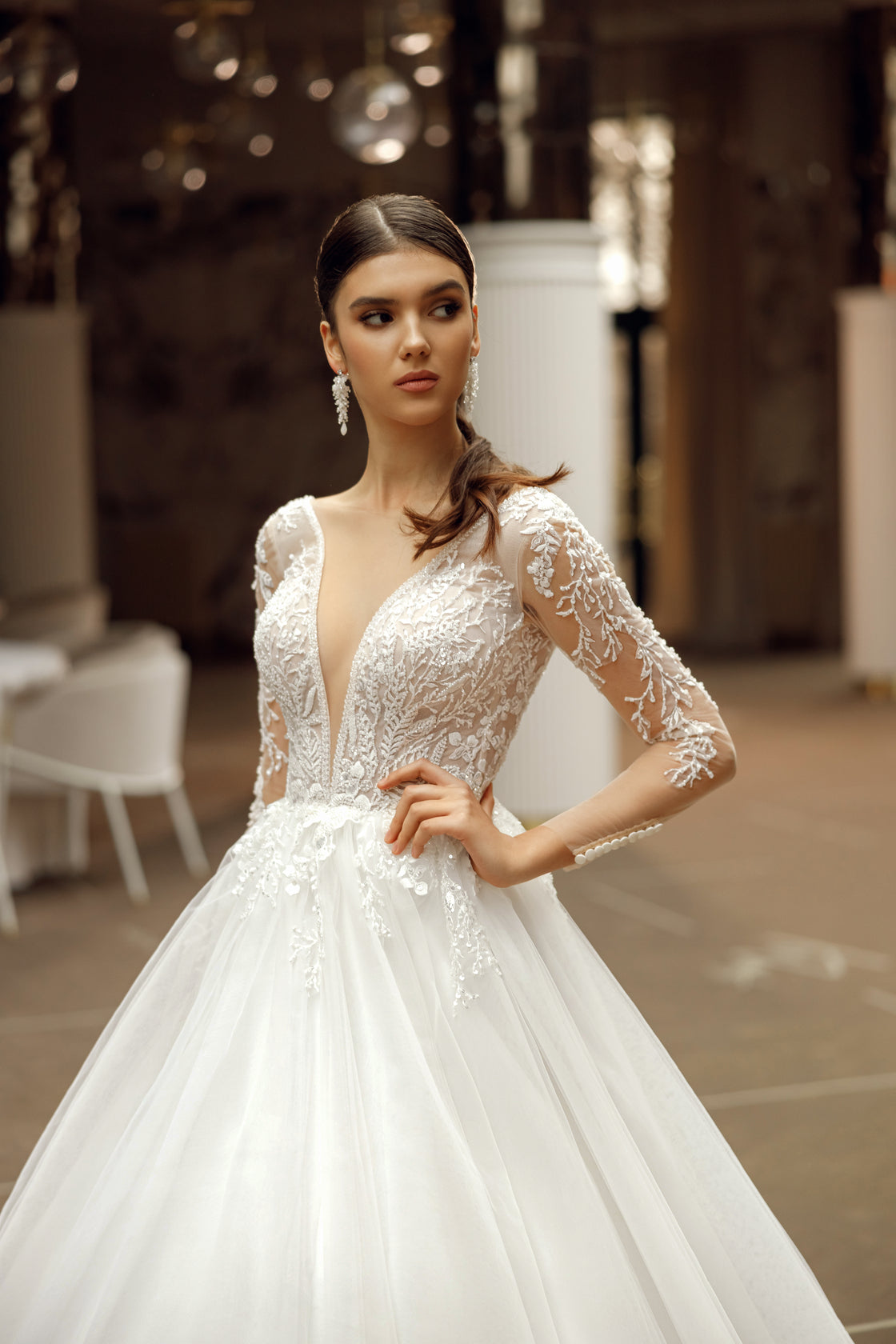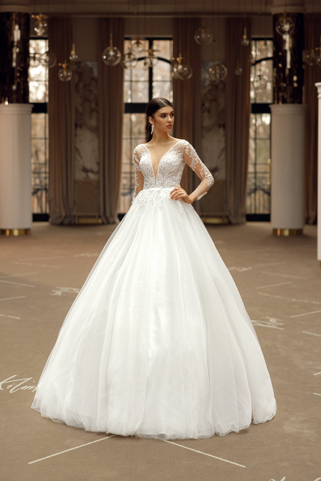 Type of wedding dress: puffy princess-style dress with long sleeves.