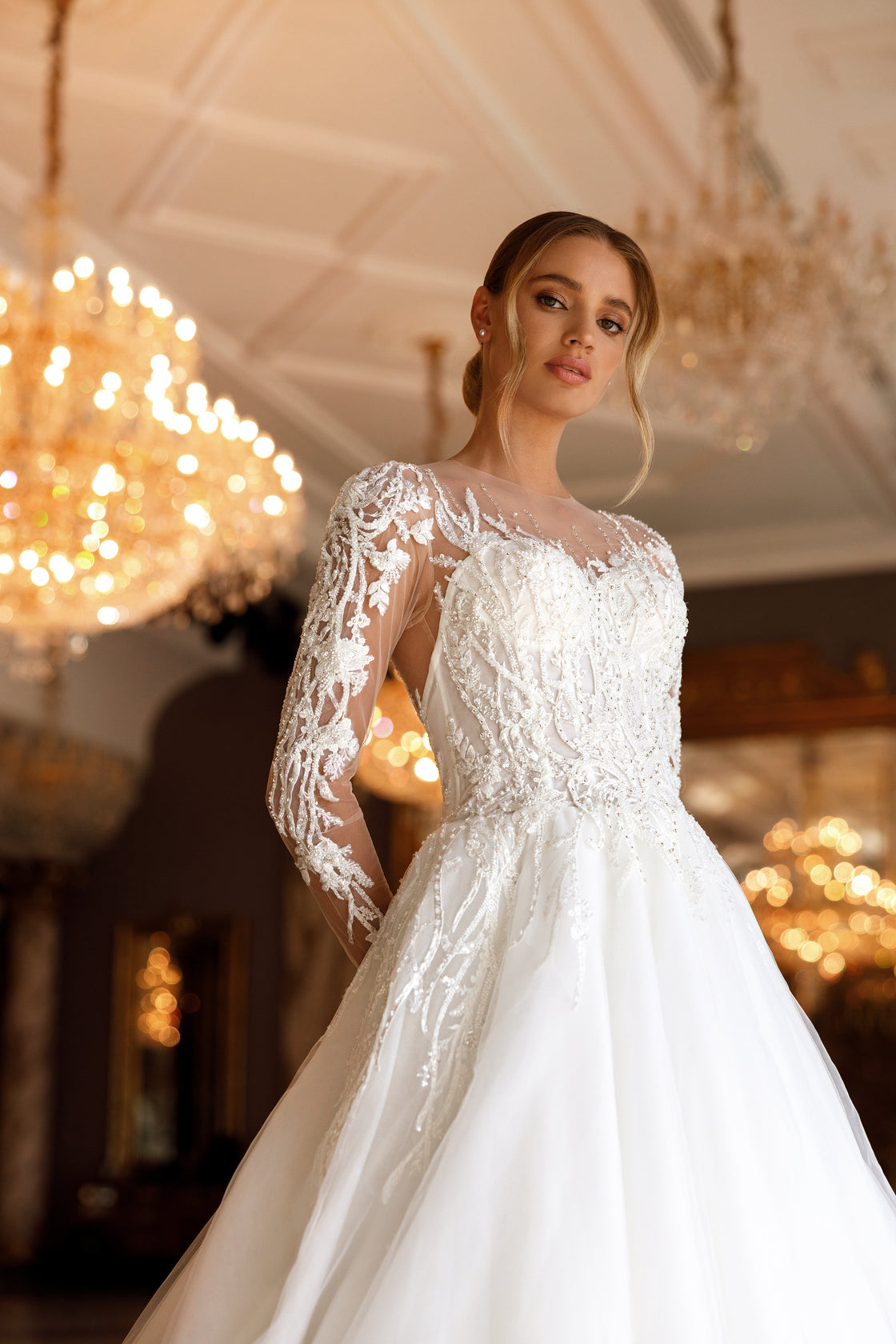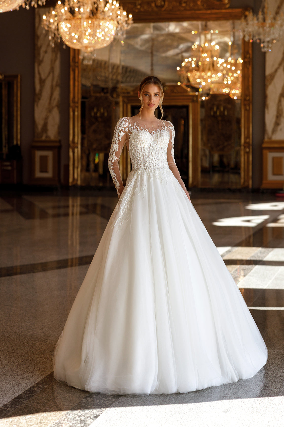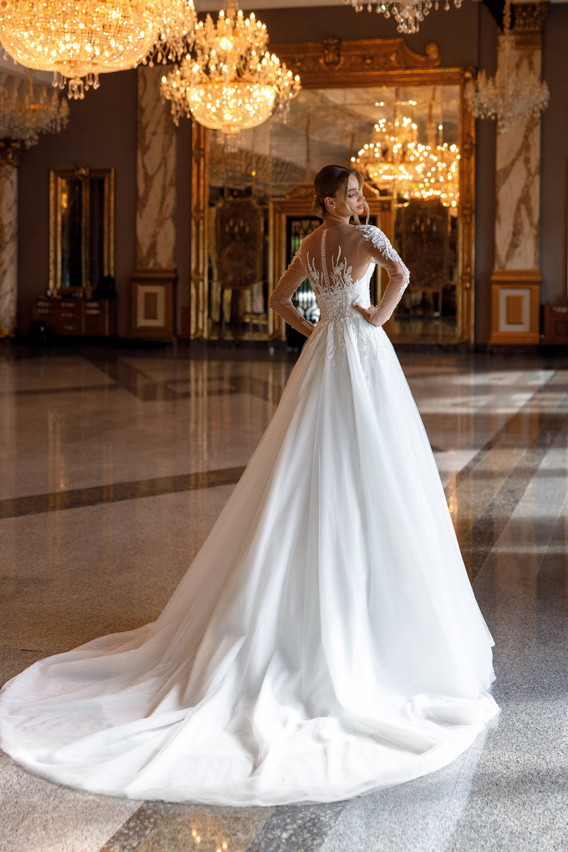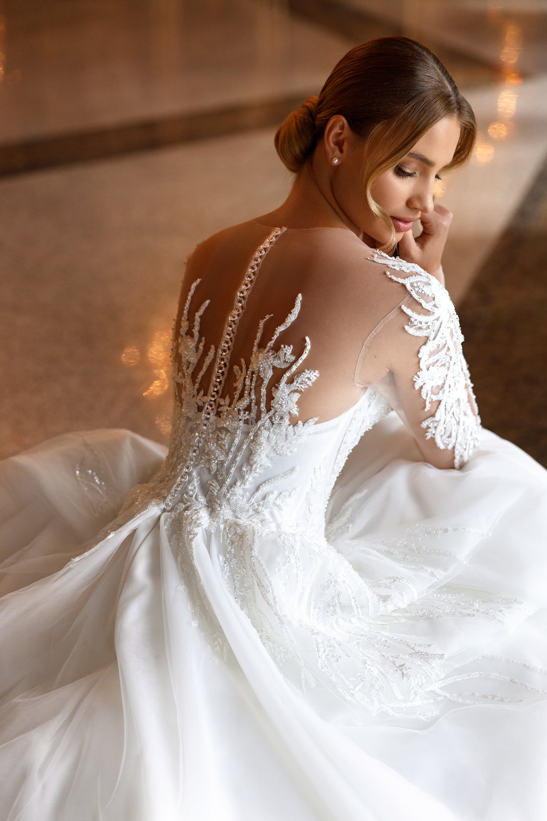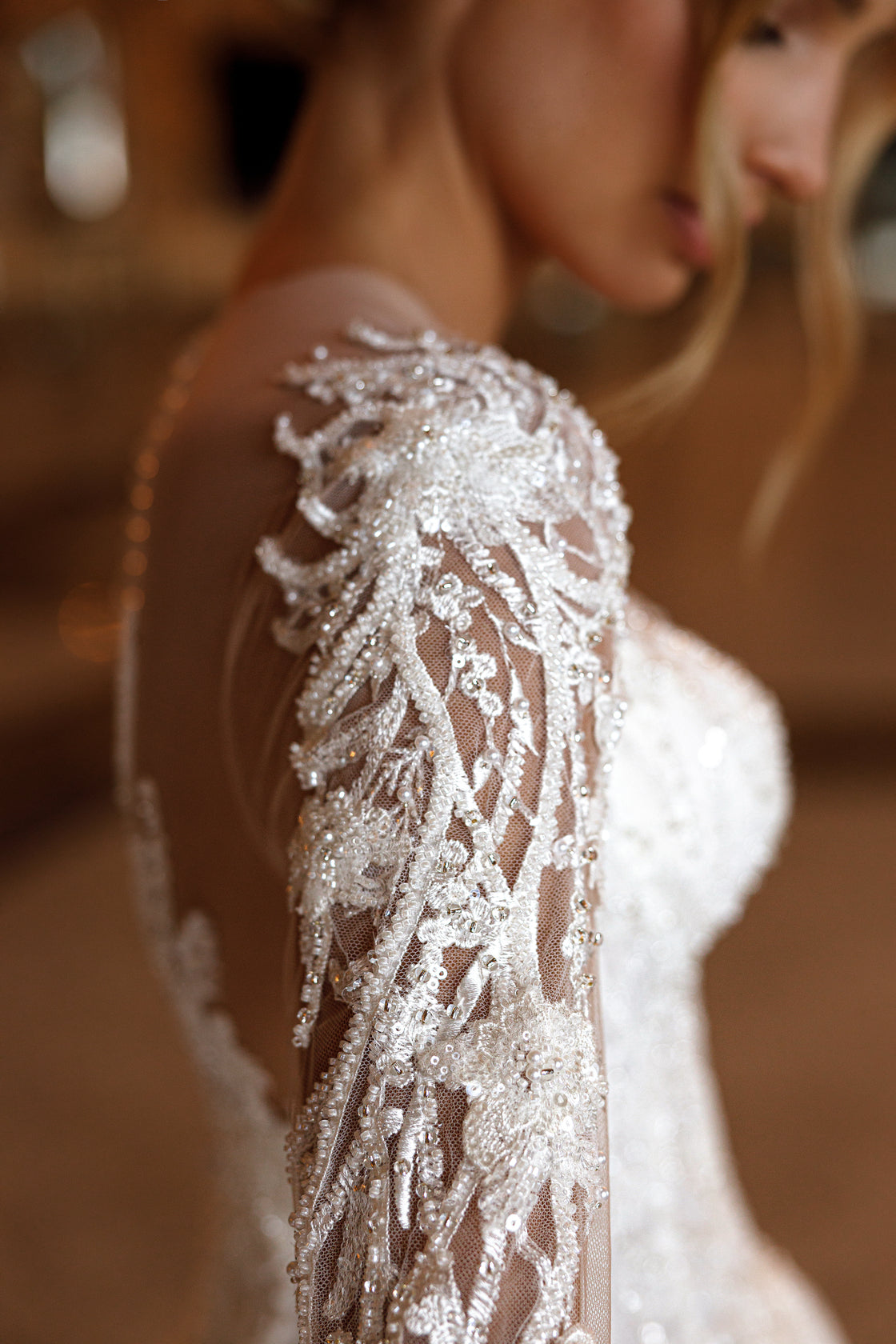 Colors and materials: ivory color dress, nude net on the top of the corset and on sleeves. Corset, skirt and sleeves are decorated with floral lace, which is embroidered with beads, pearls and sequins. Tulle skirt.