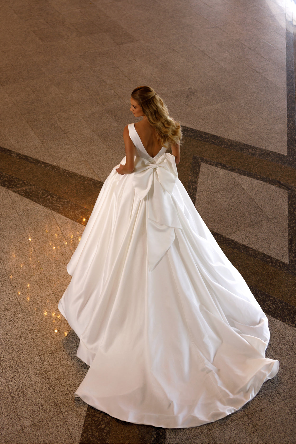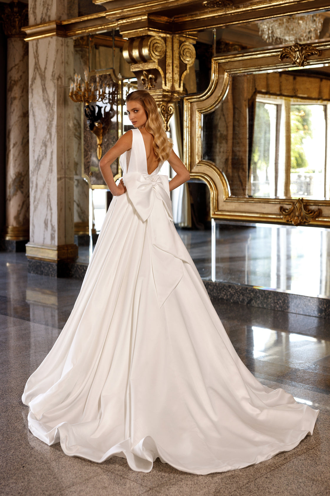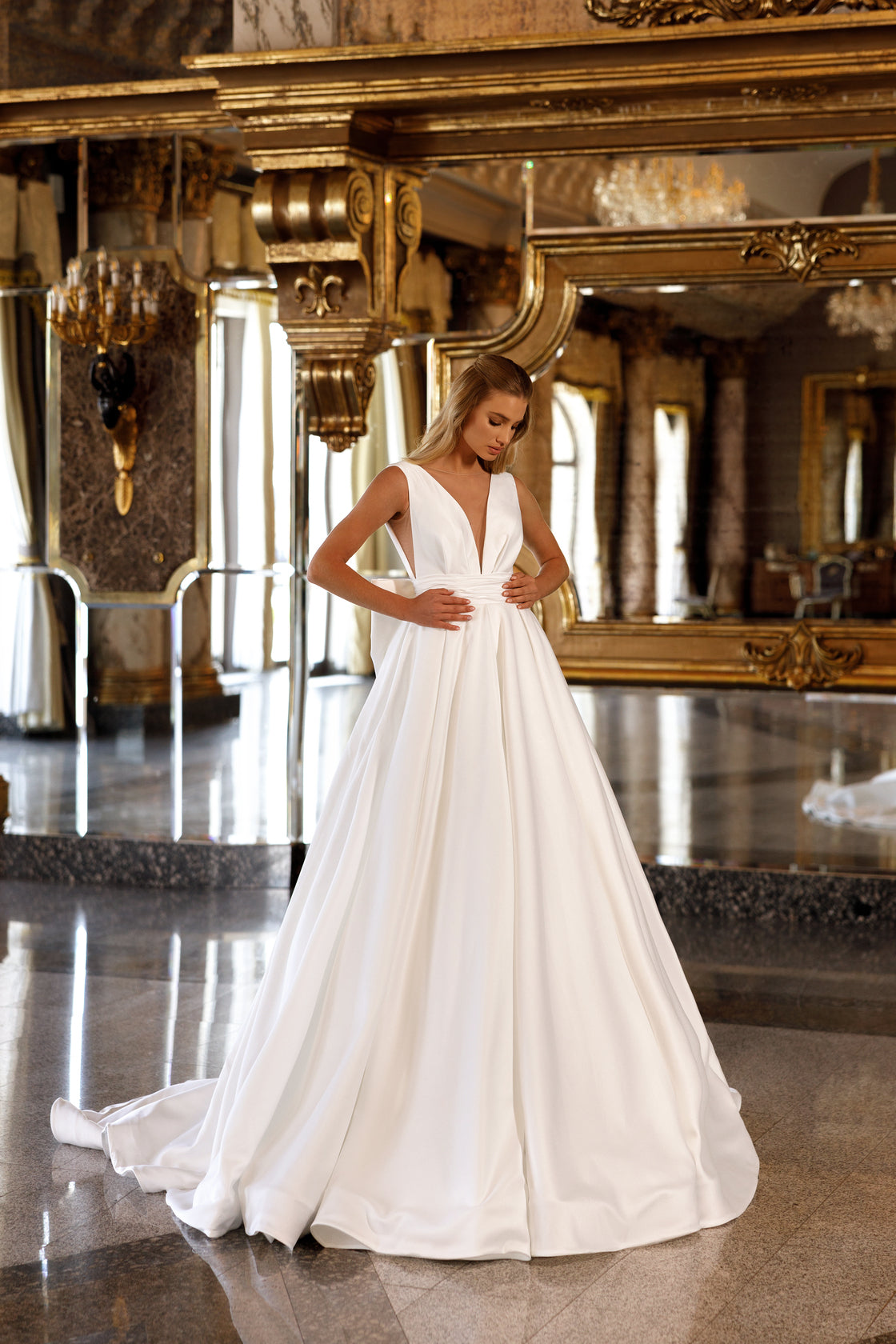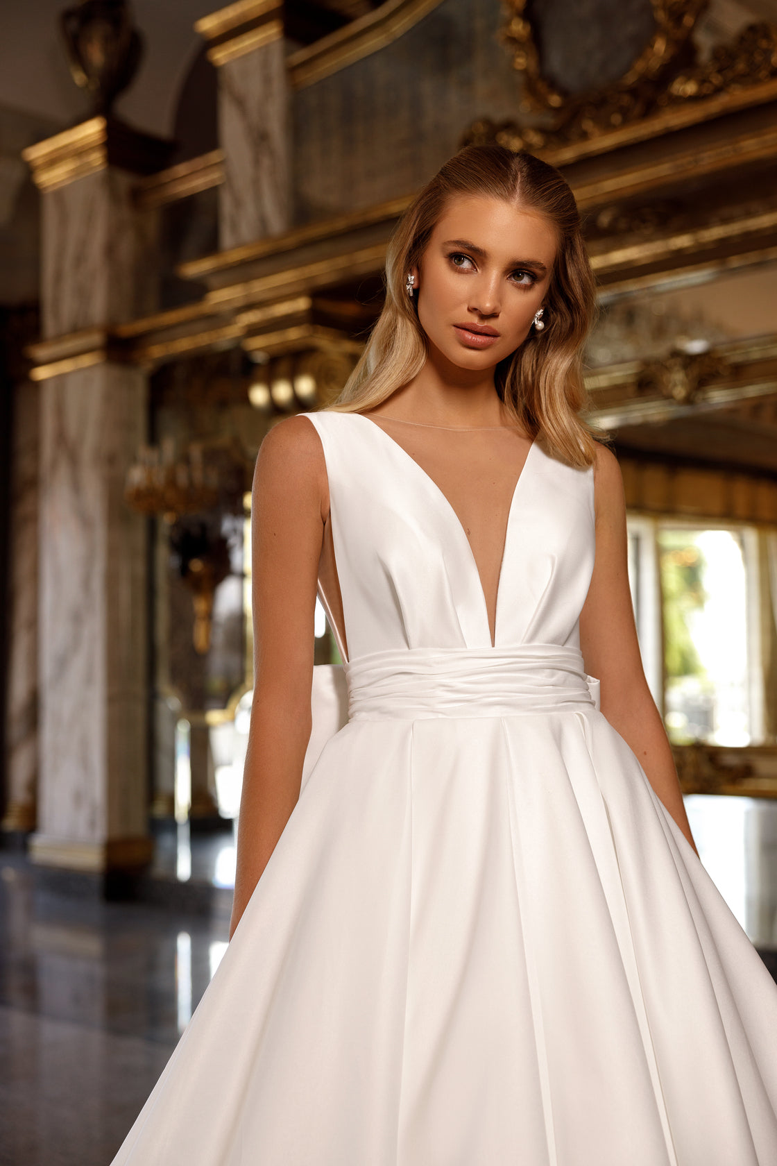 Colors and materials: ivory satin dress, nude mesh inserts. At the waist there is an original drapery made of satin.