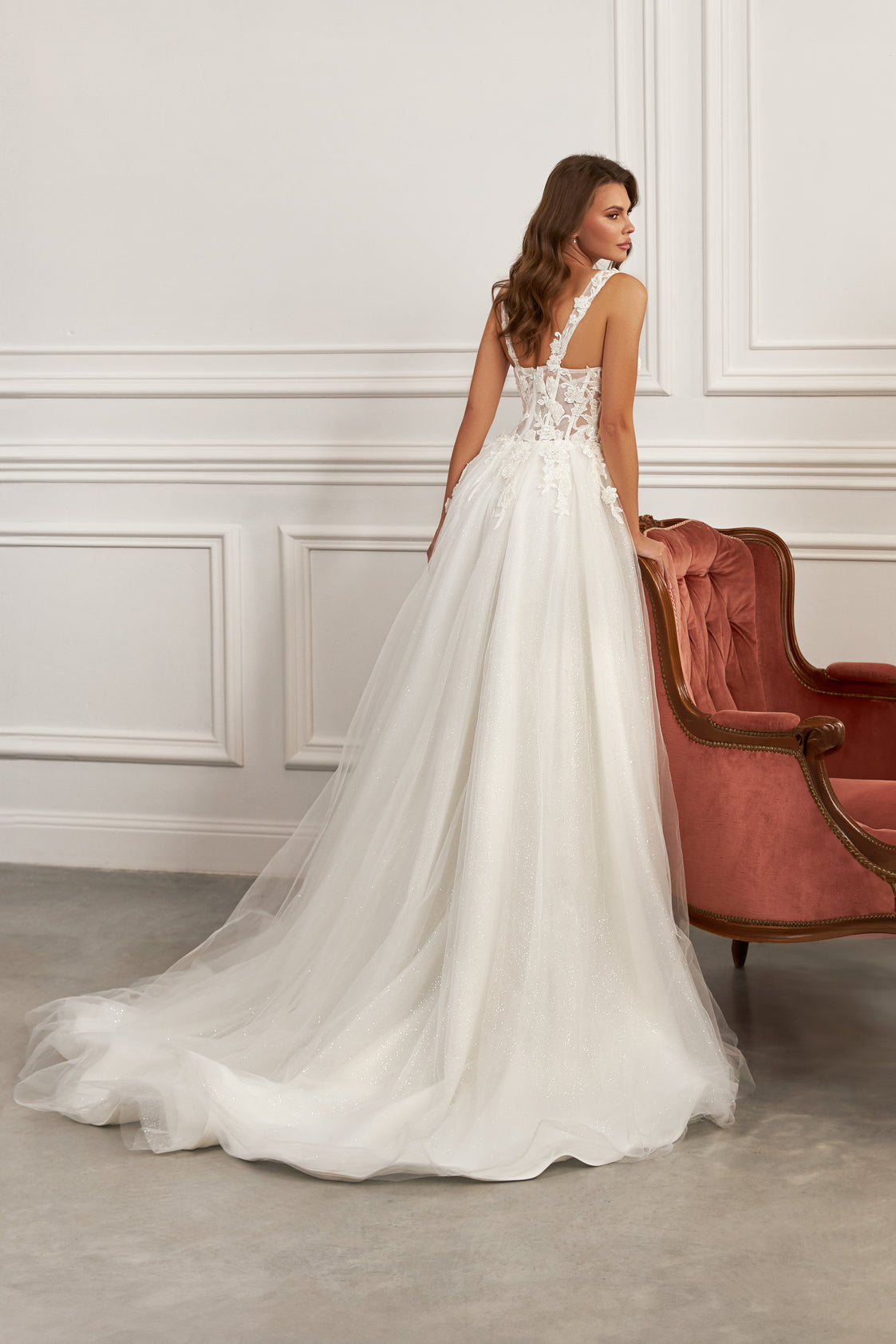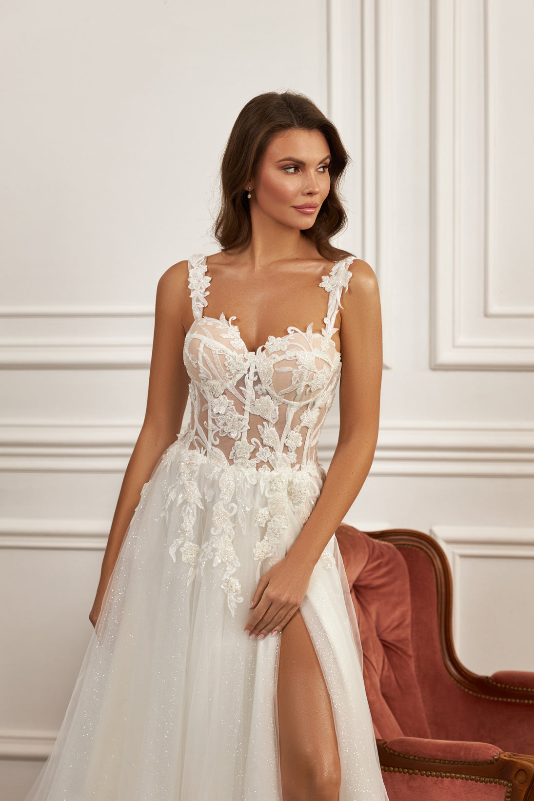 Exude modern romance with this exquisite sleeveless A-line gown, featuring a plunging neckline and intricate floral lace appliqués. The dress showcases delicate straps and a sheer corset-style bodice that transitions into a flowing skirt with a high slit, creating a look that is both sophisticated and alluring. Ideal for weddings, formal events, and special occasions, this dress is designed to make you feel like a true princess.