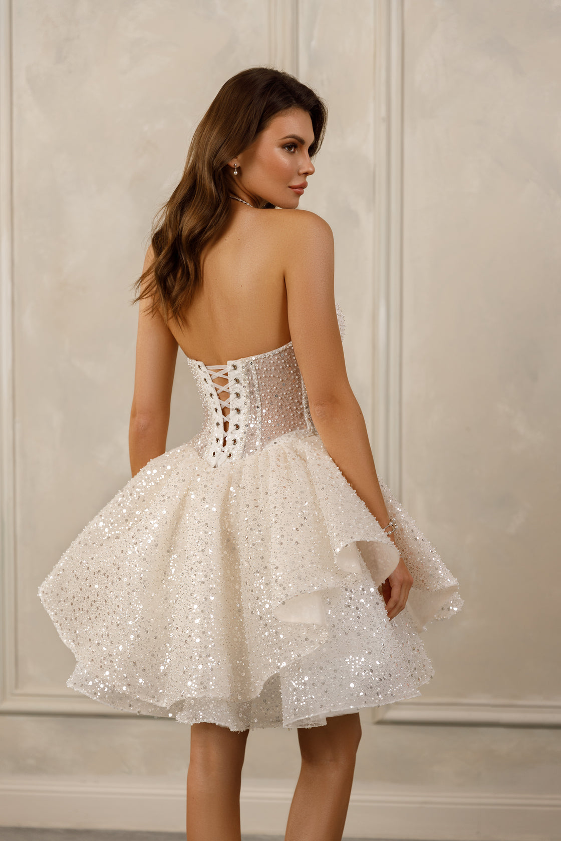 Dazzle on your special day with this sparkling mini wedding dress. This captivating dress features a strapless sweetheart neckline with a fitted, corset-style bodice adorned with shimmering sequins and intricate beadwork. The short, layered skirt creates a playful and modern silhouette, perfect for brides looking to make a chic and unforgettable statement.