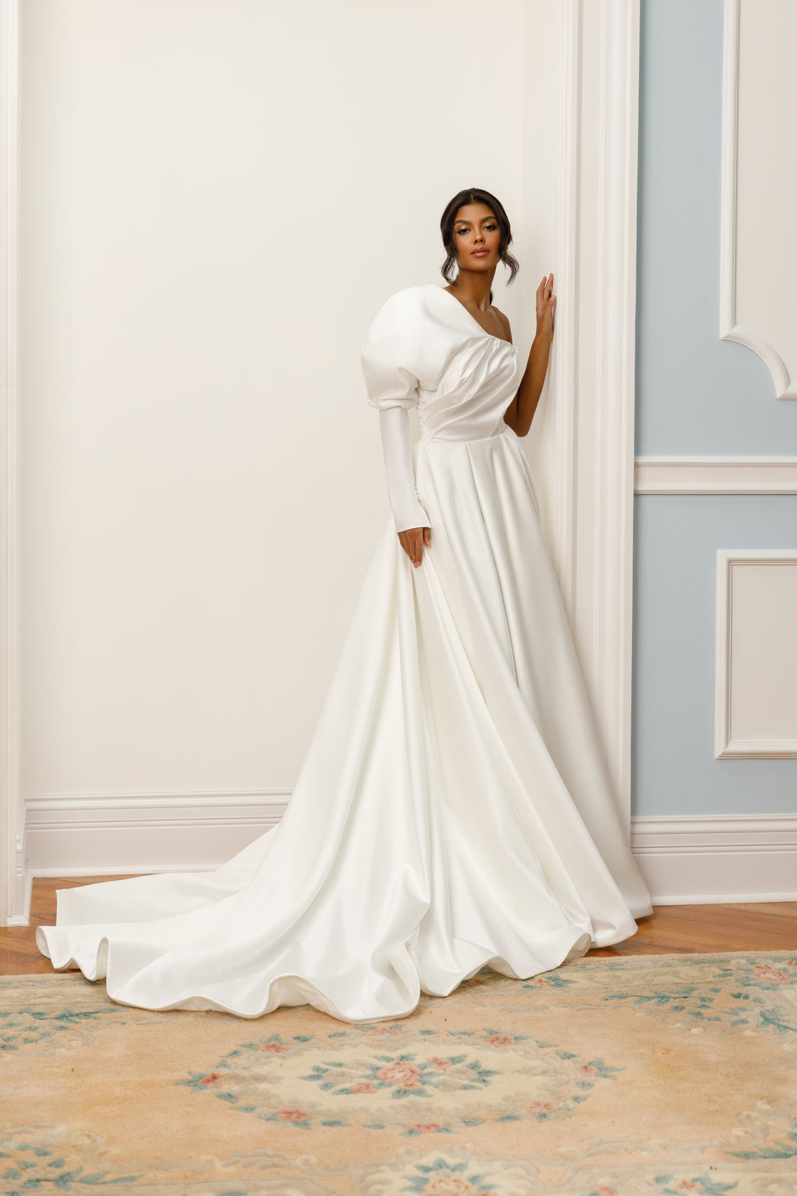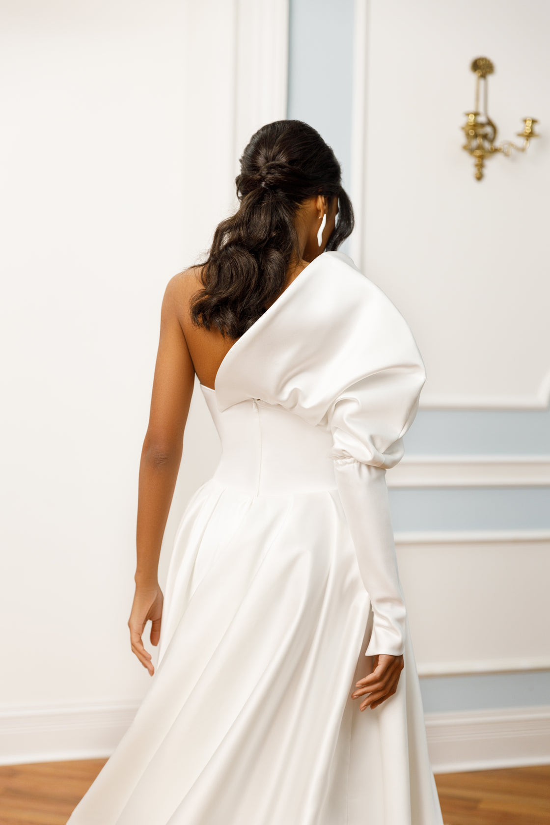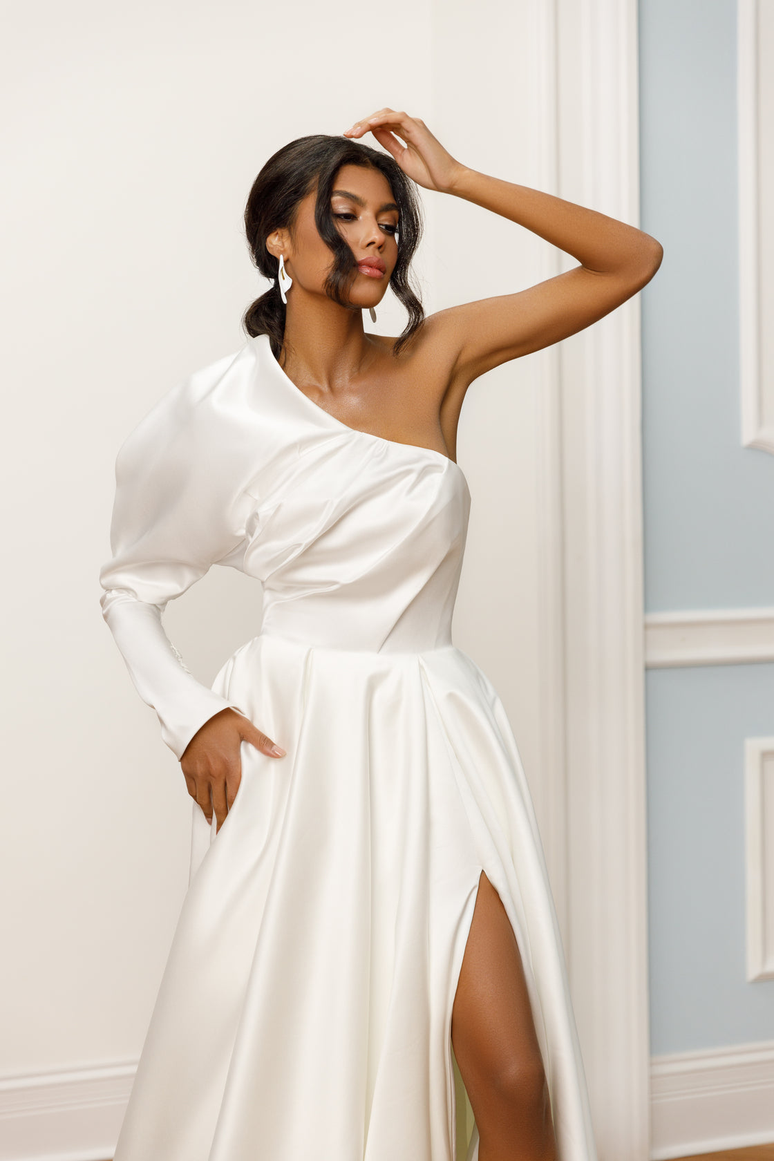 Make a bold statement with this modern one-shoulder gown, featuring a dramatic asymmetrical neckline and a sleek fitted bodice. The dress showcases a long sleeve on one side and a high slit in the flowing skirt, creating a look that is both contemporary and elegant. Perfect for weddings, formal events, and special occasions, this dress exudes sophistication and unique style.
