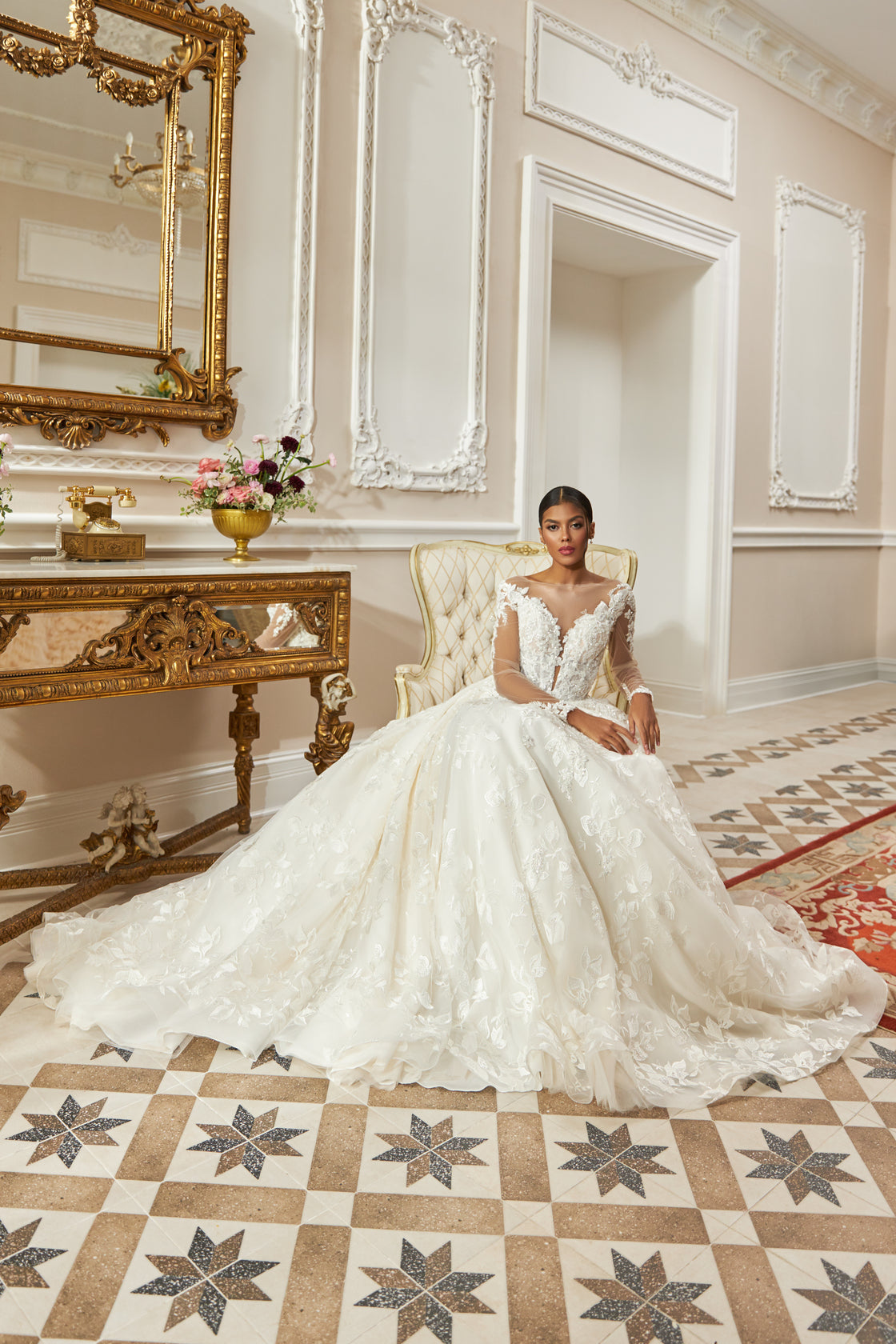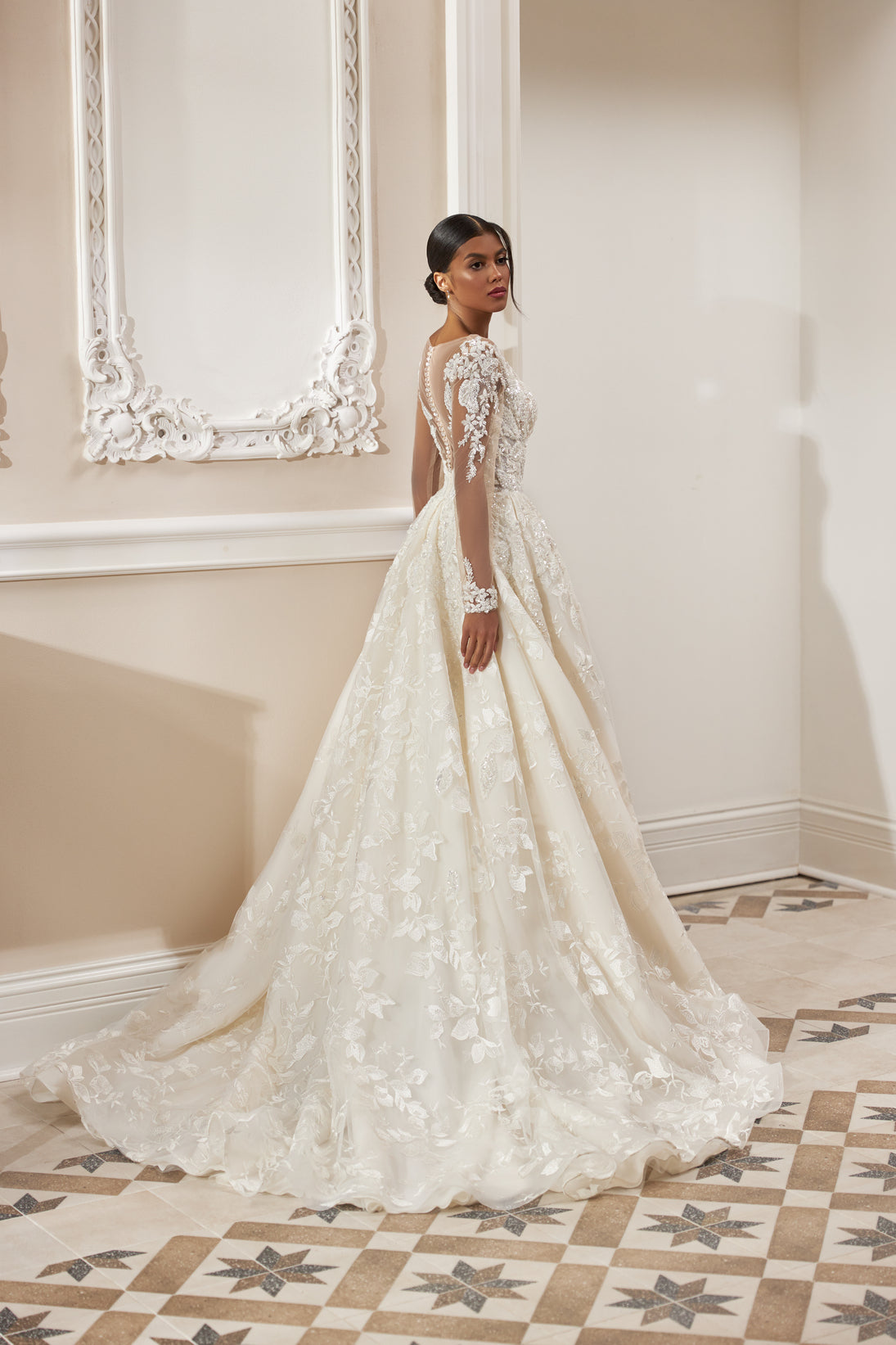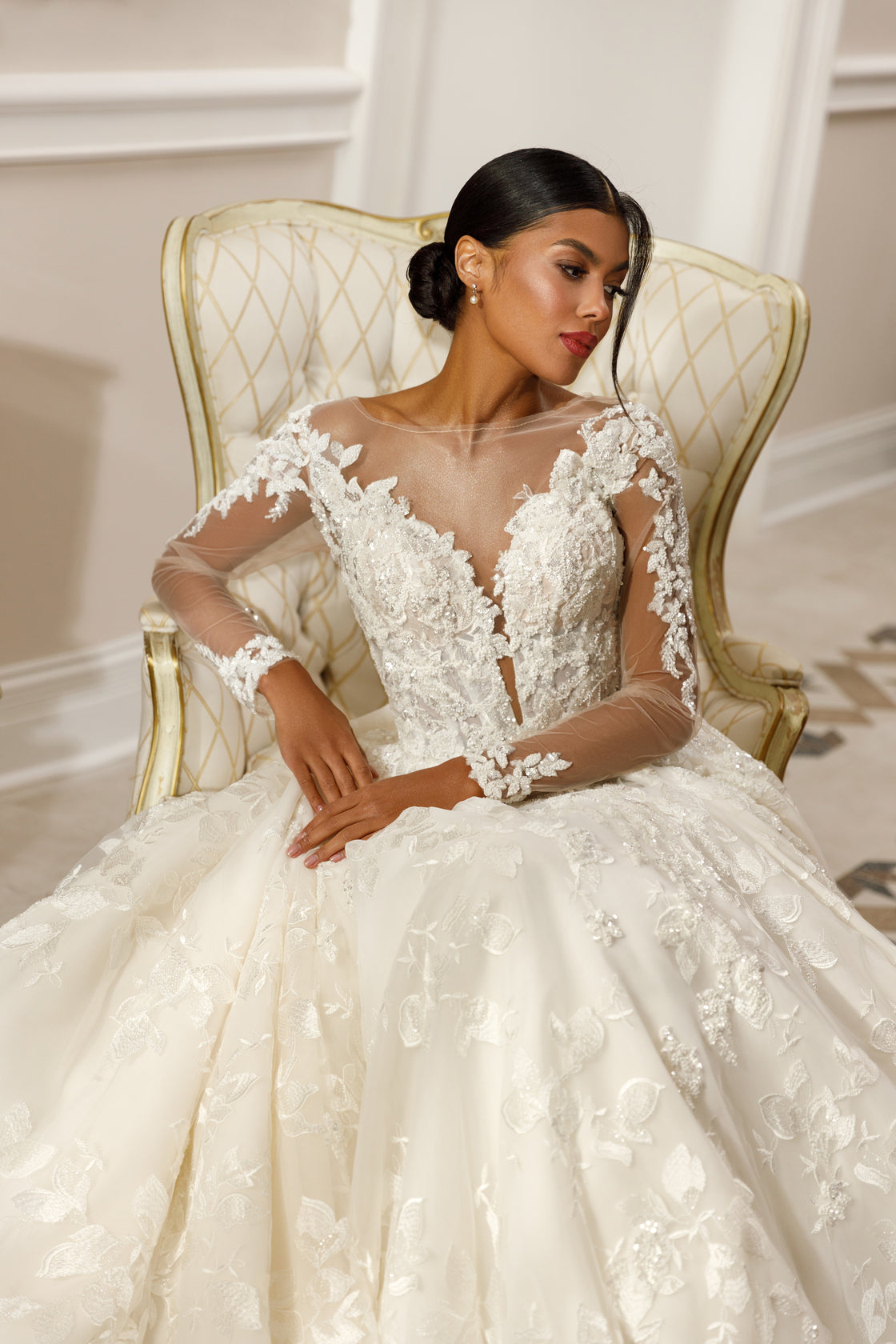 Radiate timeless beauty with this exquisite A-line gown, featuring a delicate illusion neckline and intricate floral lace appliqués. The dress showcases long sheer sleeves with lace details and a fitted bodice that seamlessly transitions into a flowing skirt, creating a look that is both elegant and romantic. Ideal for weddings, formal events, and special occasions, this dress is designed to make a lasting impression.