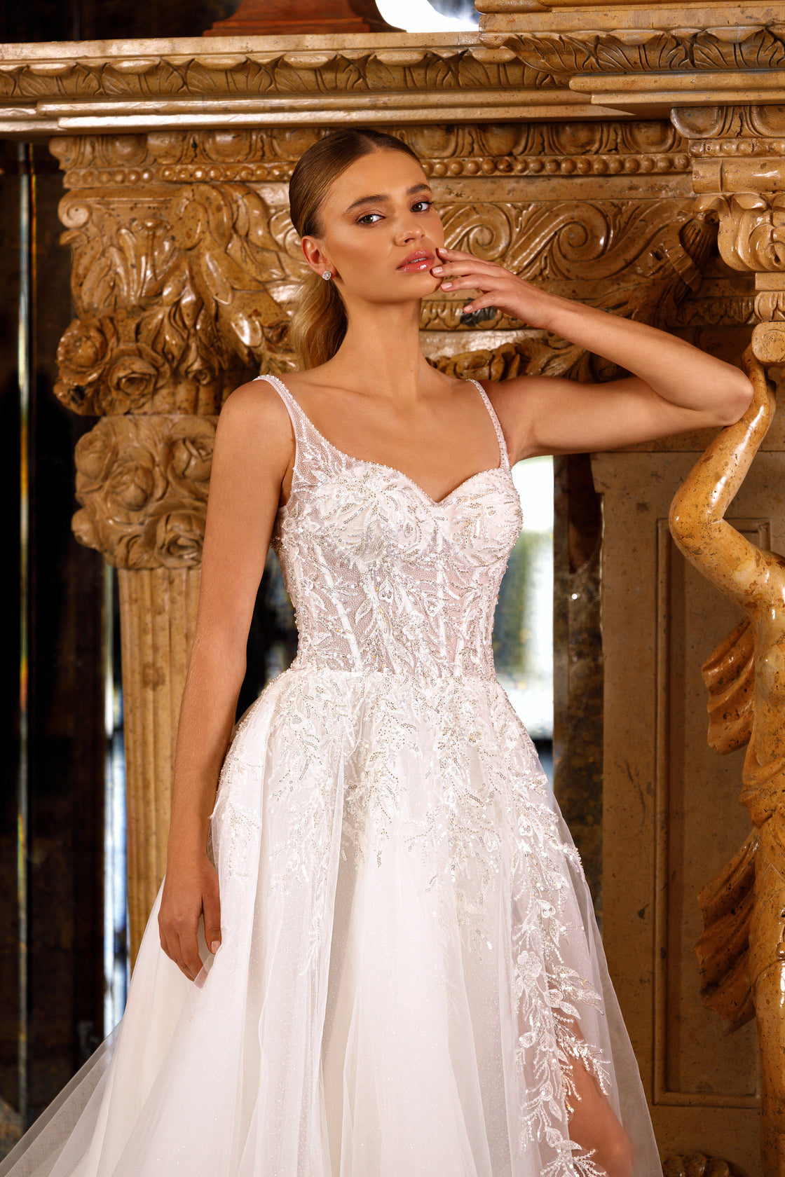 broidered with beads. Tulle and glitter skirt decorated with embroidered lace, beads, pearls and sequins. Skirt with a slit.