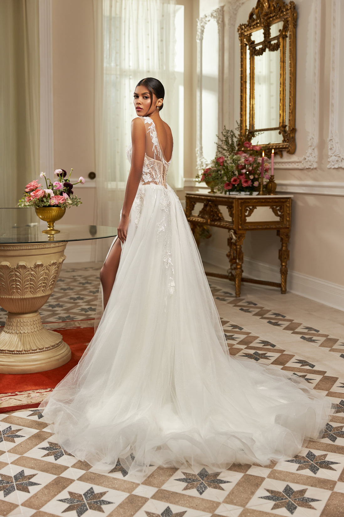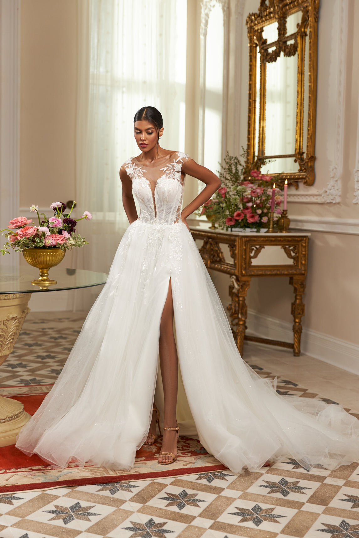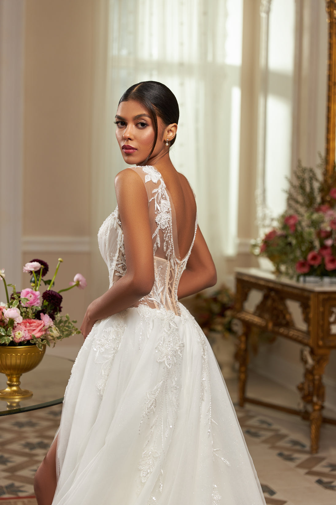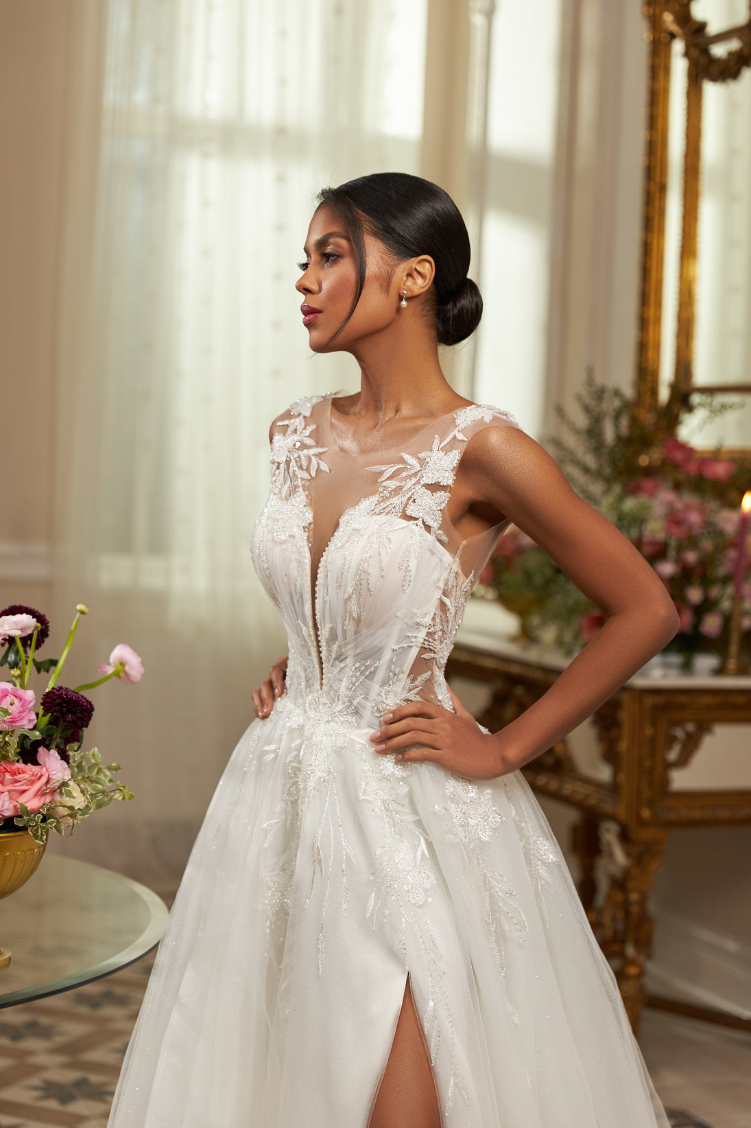 Radiate elegance with this captivating illusion neckline A-line gown, featuring delicate floral lace appliqués and a dramatic plunging neckline. The dress showcases sheer shoulder details and a fitted bodice that flows into a voluminous skirt with a high slit, perfect for a bride seeking a combination of modern sophistication and timeless beauty. Ideal for weddings, formal events, and special occasions, this dress is designed to leave a lasting impression.