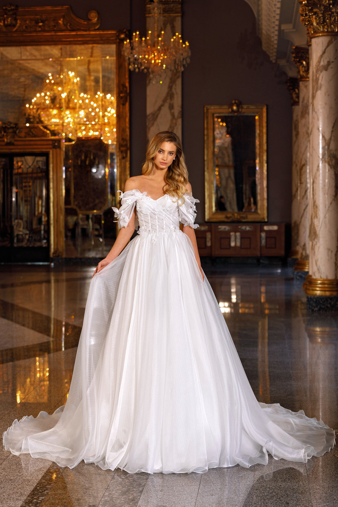 Color and materials: ivory organza dress. Light drapery on the corset. The corset