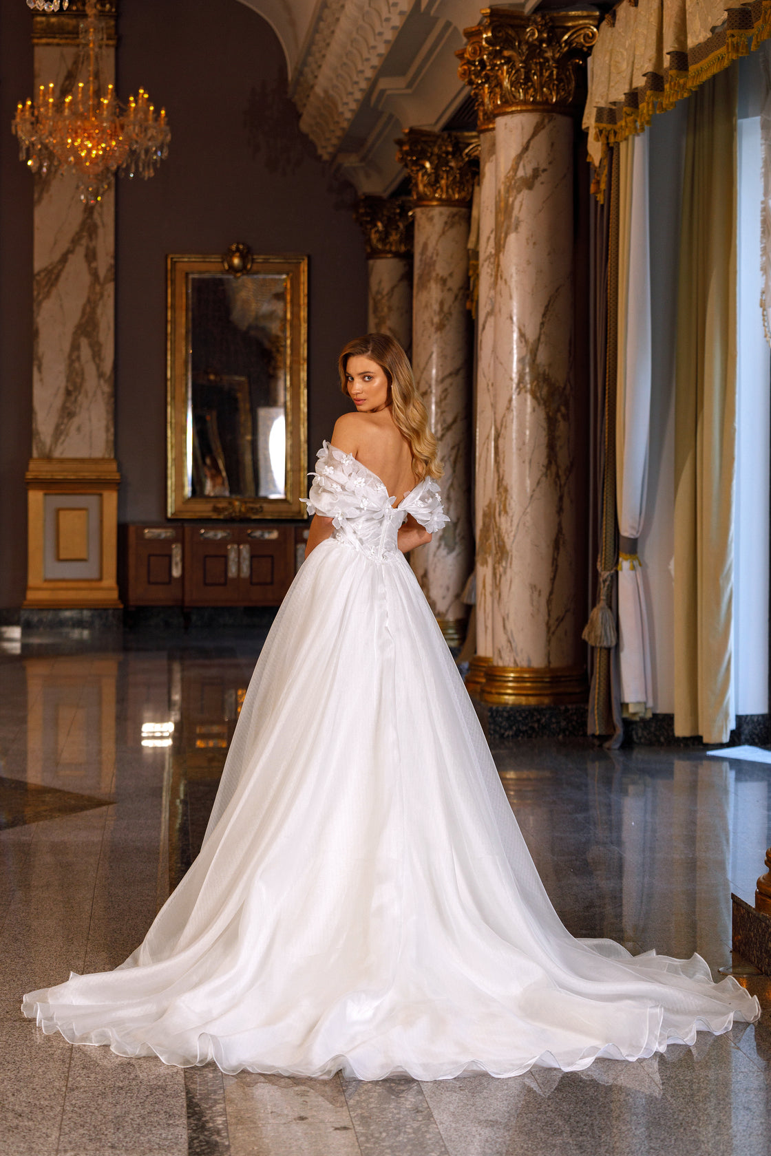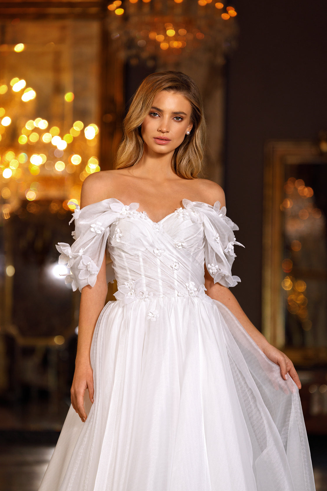 and straps are decorated with voluminous 3D flowers made of organza. Tulle and organza skirt.