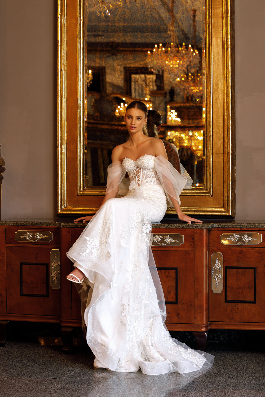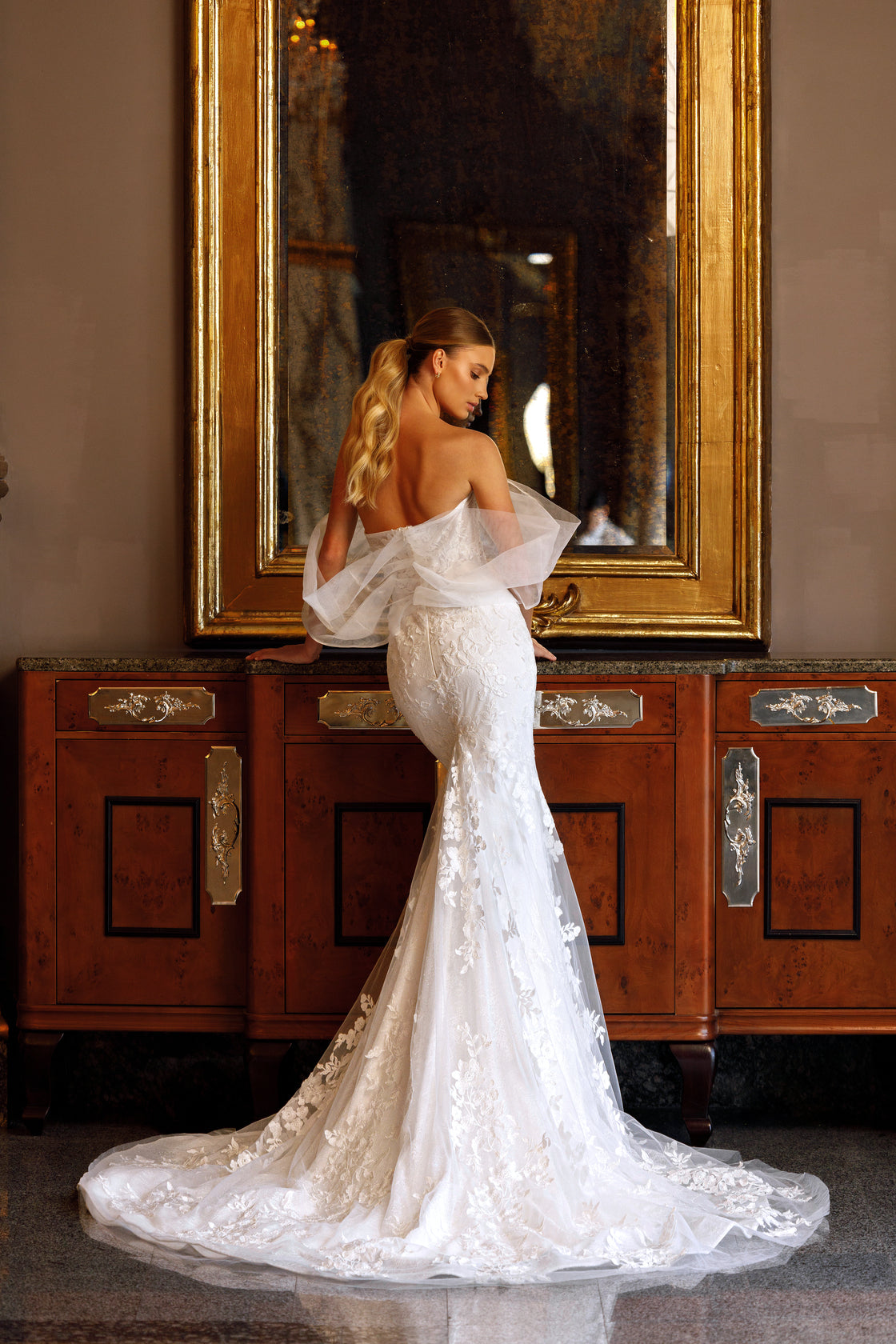 Type of wedding dress: mermaid dress with lowered tulle straps.