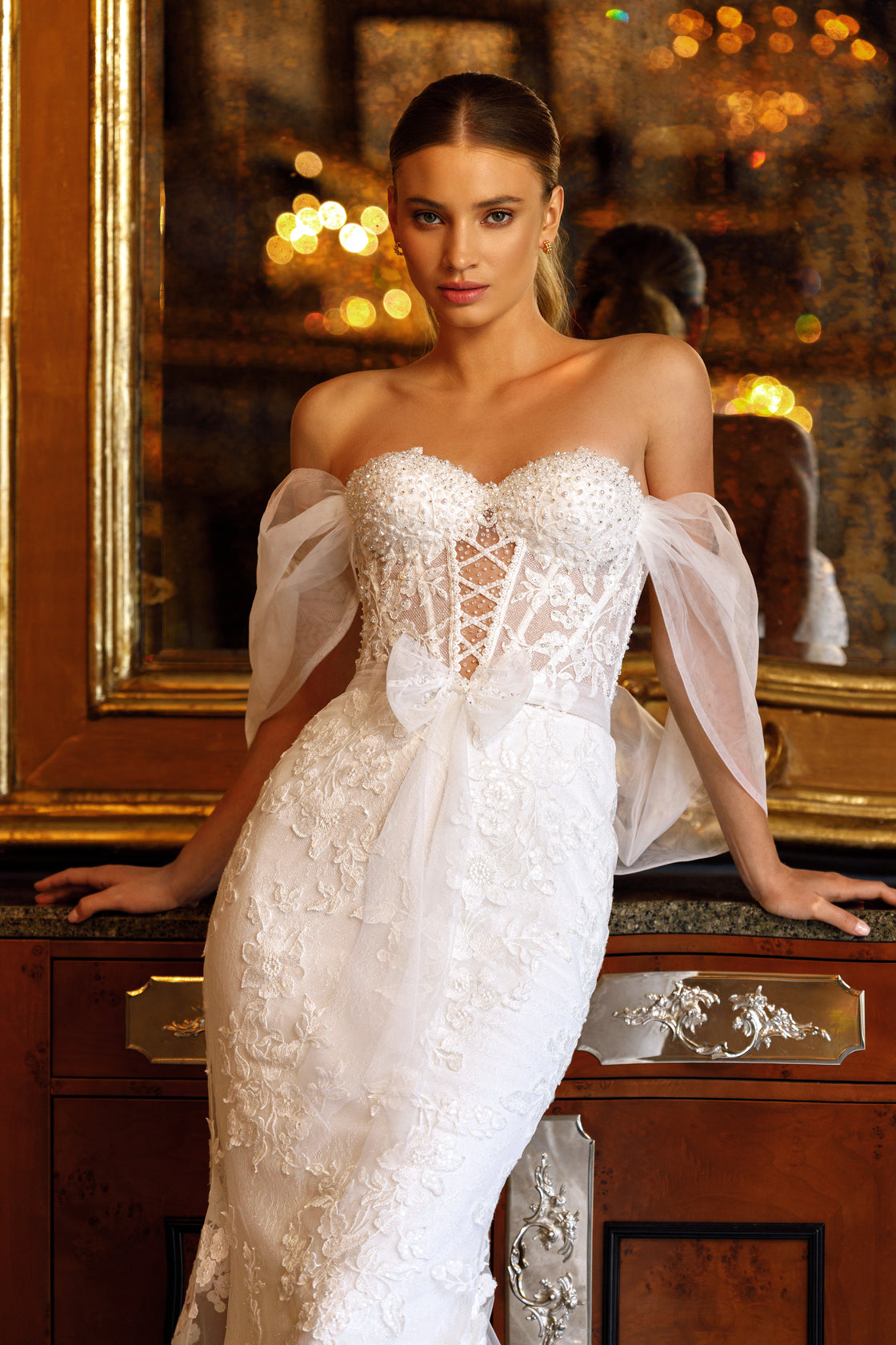 Color and materials: translucent ivory corset covered with glitter, body mesh neckline insert. The corset is decorated with lace, which is embroidered with transparent sequins, densely embroidered with crystals, pearls, stones, beads and sequins. The waist is accentuated with a delicate belt with a bow. Ivory skirt made of tulle, glitter and chantilly, decorated with floral lace, which is embroidered with transparent sequins.