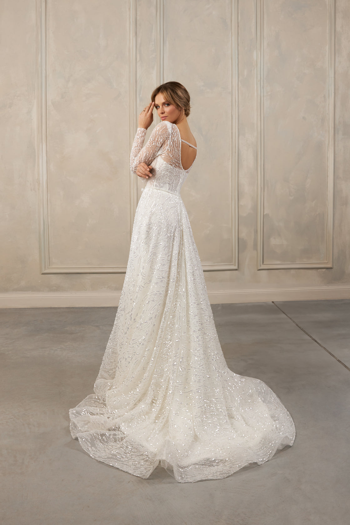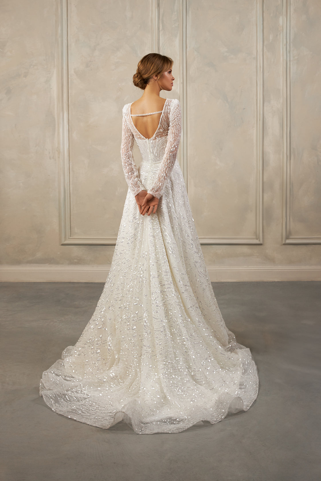 Emanate pure elegance with this exquisite long-sleeve A-line gown, featuring a delicate illusion neckline and intricate beadwork. The dress showcases a fitted bodice with a sweetheart underlay and sheer beaded sleeves, creating a look that is both sophisticated and timeless. The flowing A-line skirt adds a touch of grace, perfect for a bride seeking a classic yet modern style. Ideal for weddings, formal events, and special occasions, this dress is designed to leave a lasting impression.