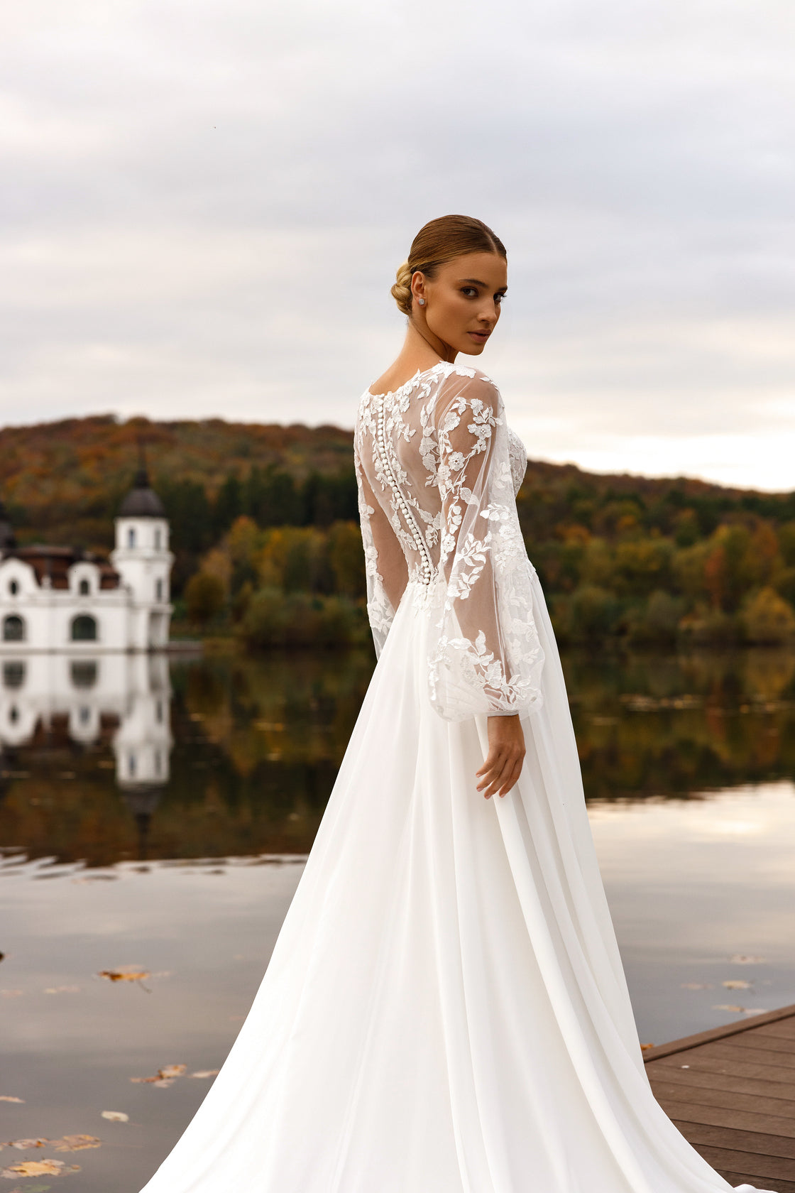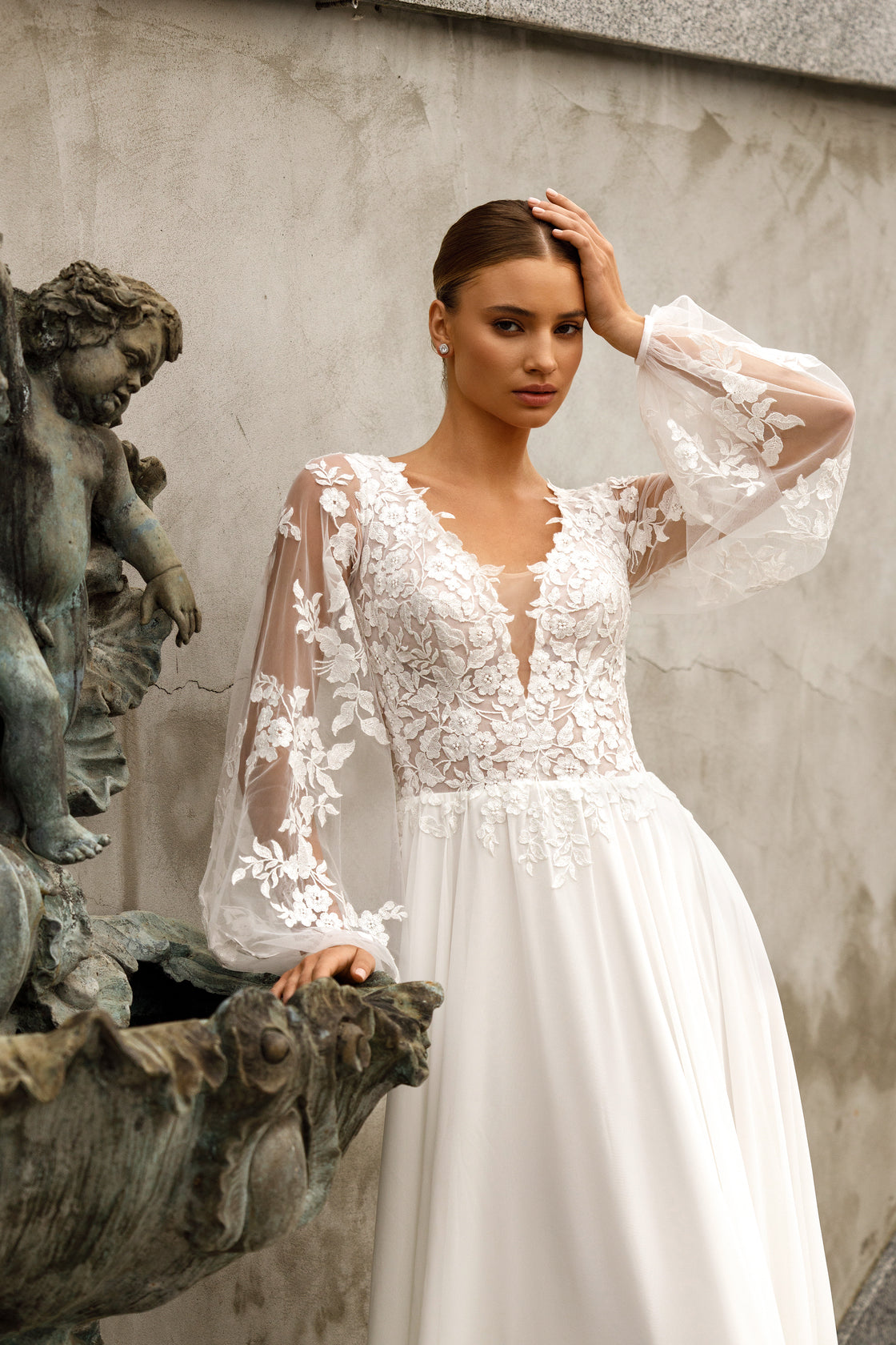 Type of wedding dress: A-silhouette with long voluminous sleeves.