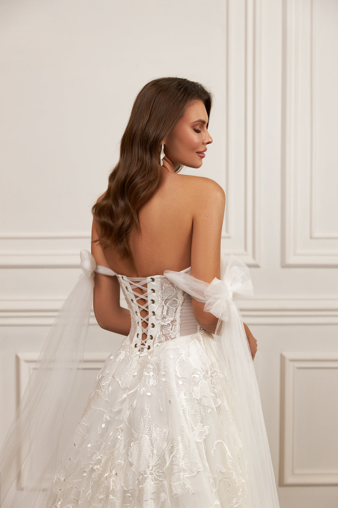 - Sleeves: Off-the-shoulder tulle bow sleeves