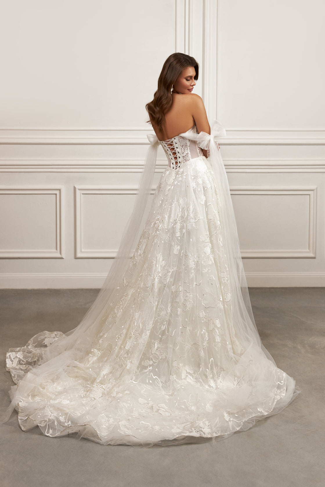 Capture attention with this stunning off-the-shoulder ball gown, featuring a structured corset bodice and delicate floral lace appliqués. The dress showcases charming tulle bow sleeves and a sweetheart neckline, creating a look that is both romantic and sophisticated. The voluminous skirt flows gracefully, perfect for making a grand entrance at any special occasion. Ideal for weddings, formal events, and special occasions, this dress exudes timeless elegance and modern allure.
