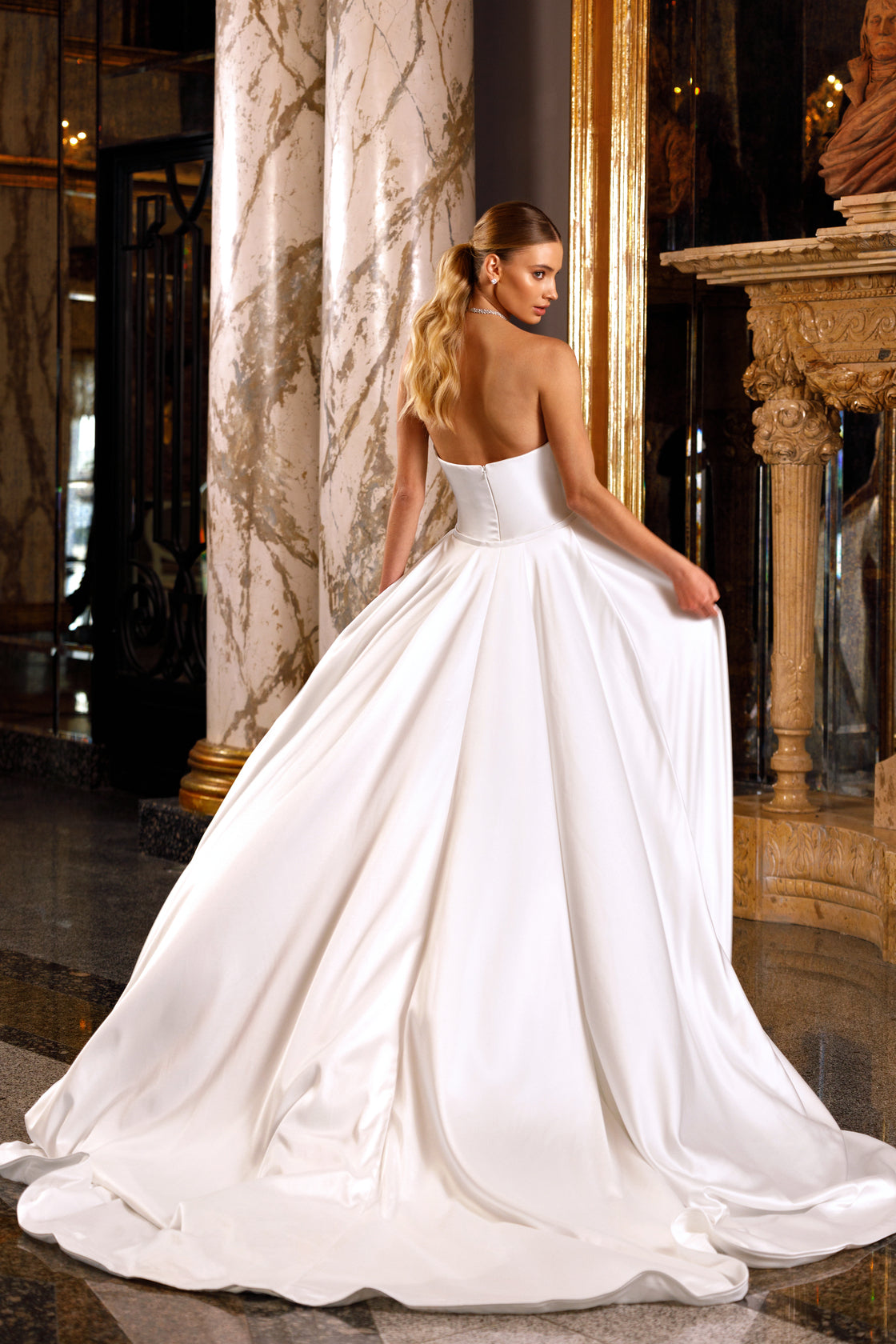 Color and materials: ivory satin dress, body mesh neckline insert. The corset has original drapery. Skirt with a slit.