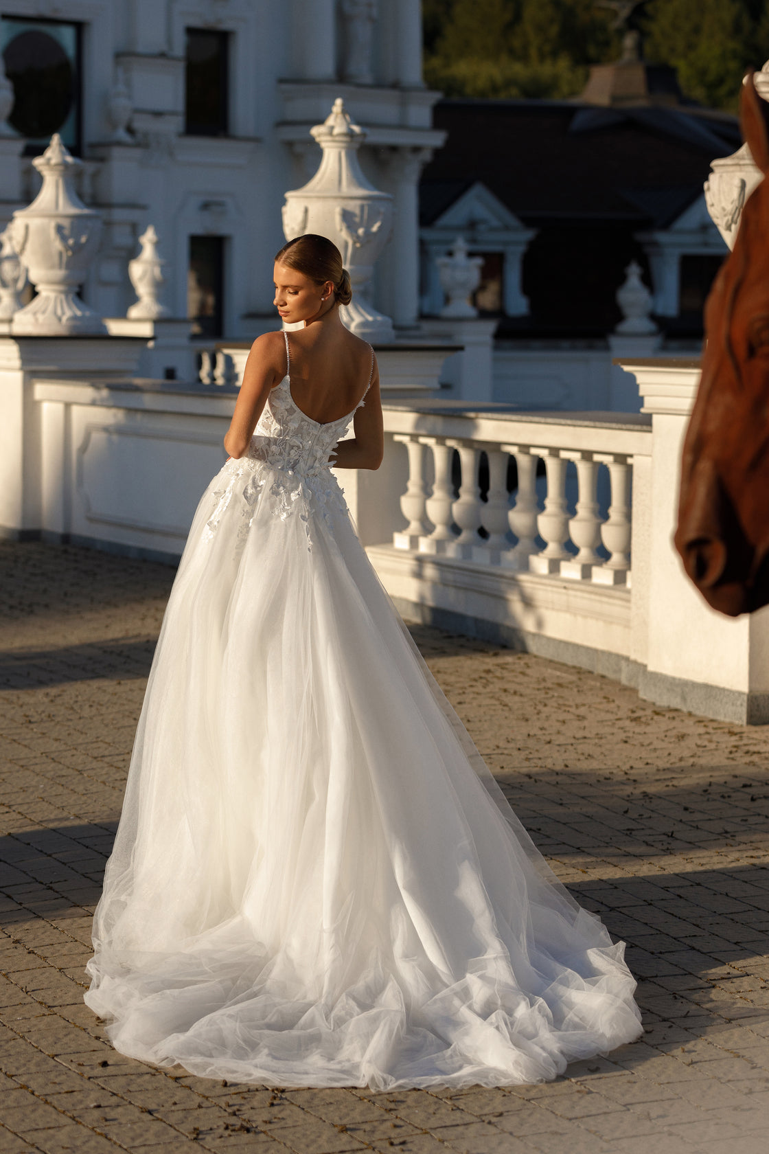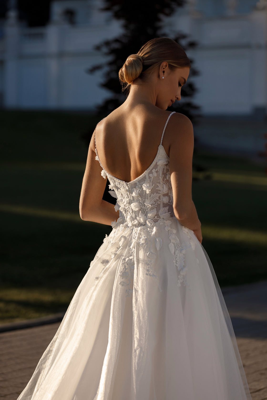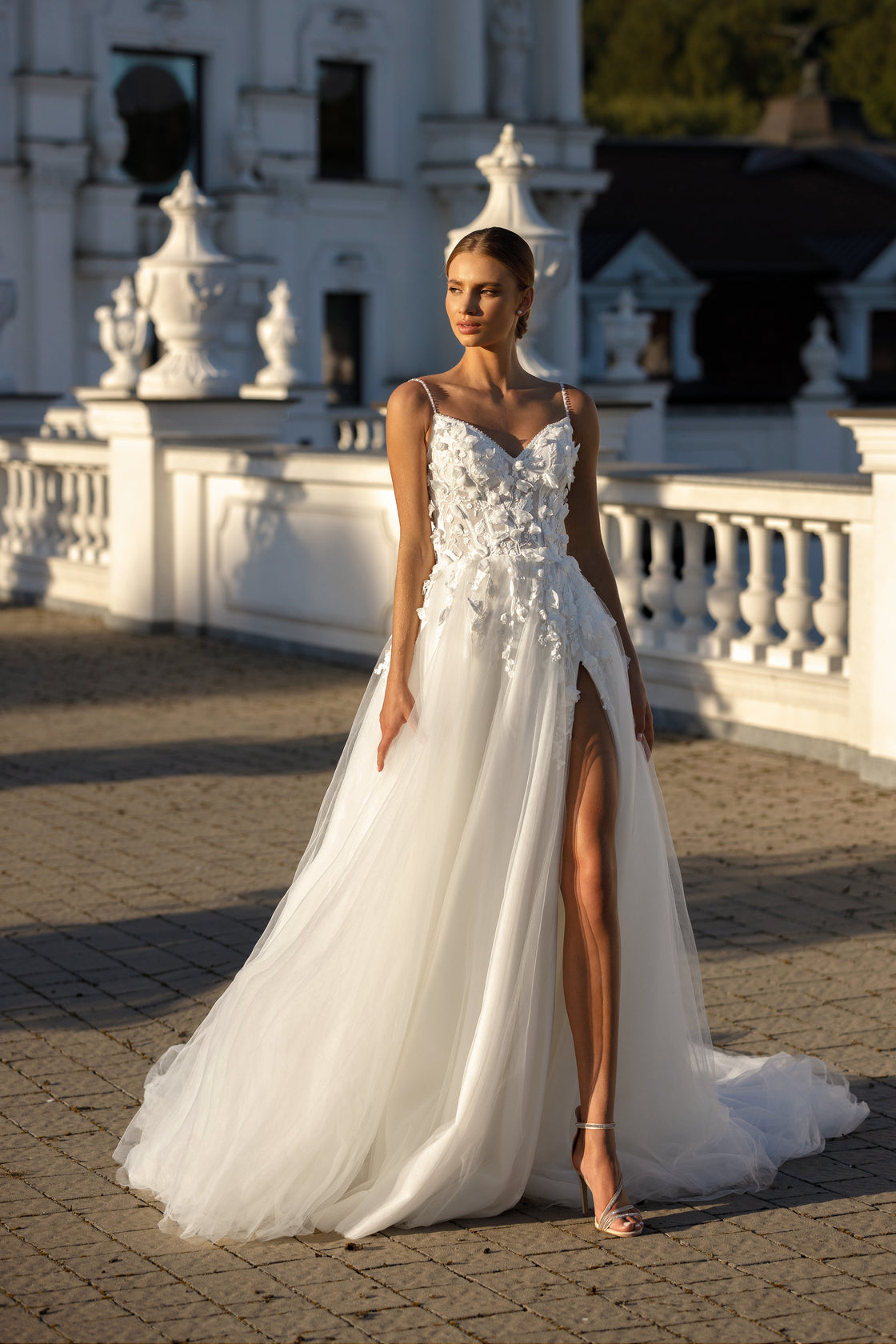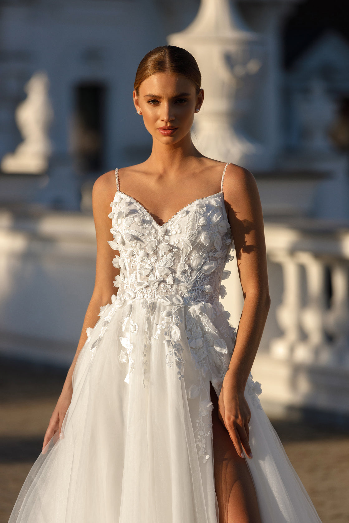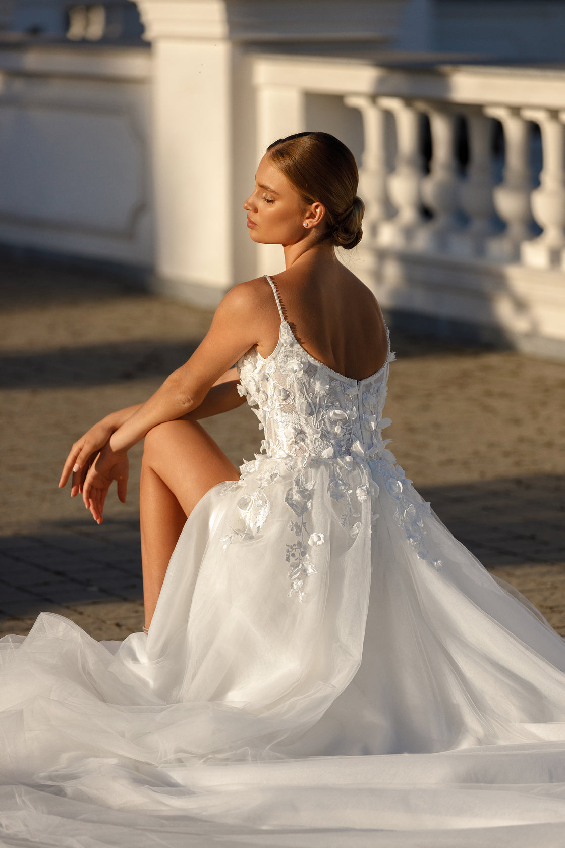 voluminous 3D flowers and petals. Skirt made of tulle, with a slit.
