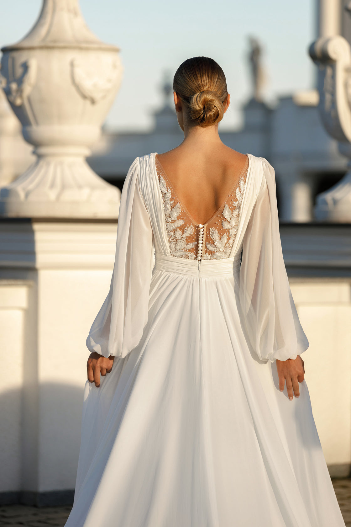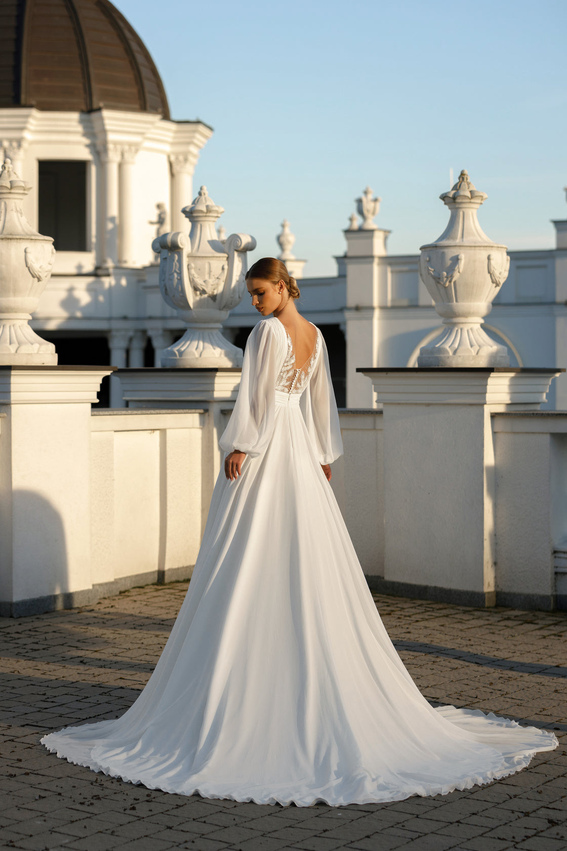 Color and materials: ivory color dress. In the neckline area and on the back is nude net, embroidered with stones and decorated with lace, which is embroidered with beads and sequins. Original drapery on the corset and belt. Nude mesh cuffs. The cuffs are heavily