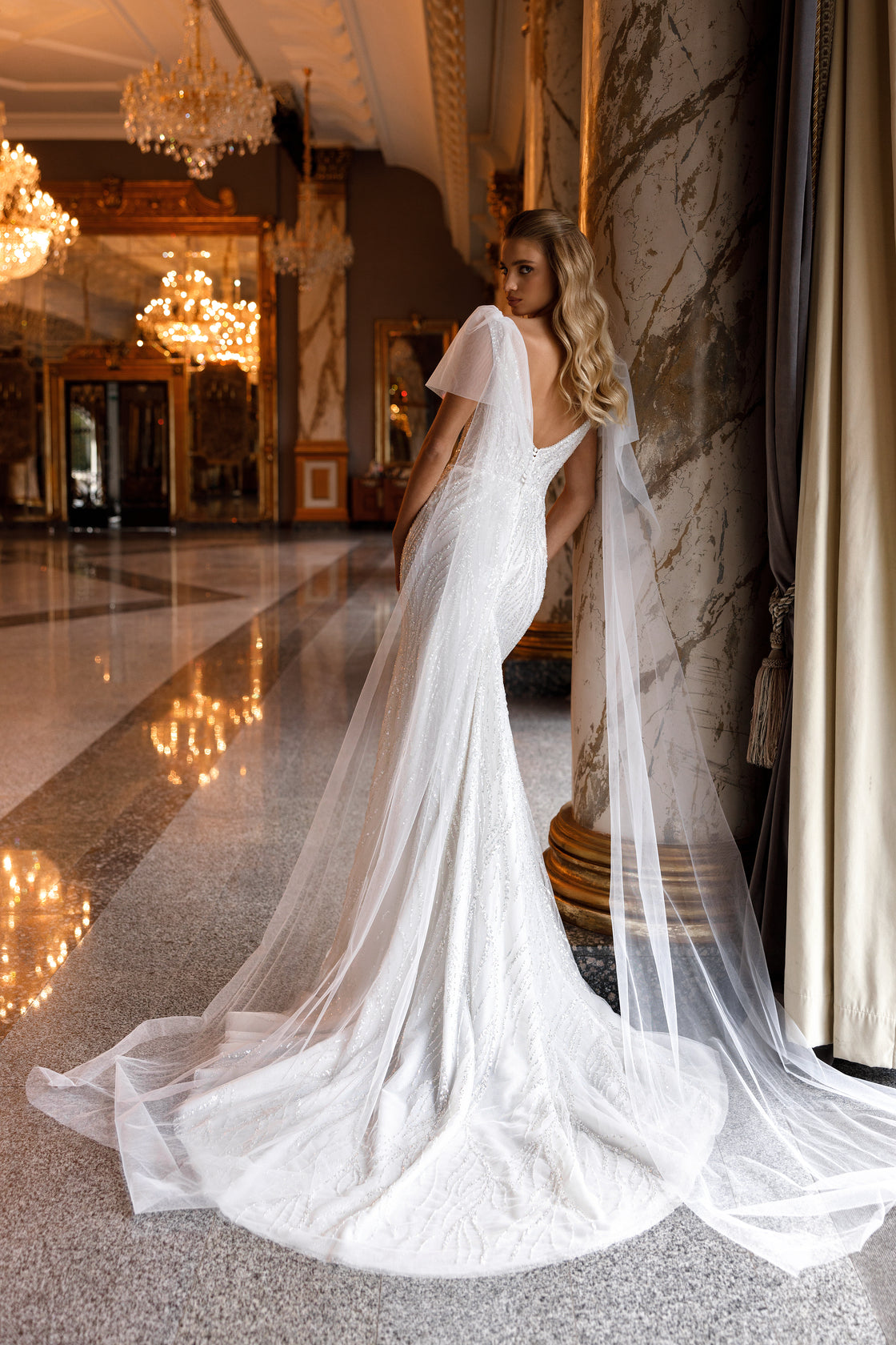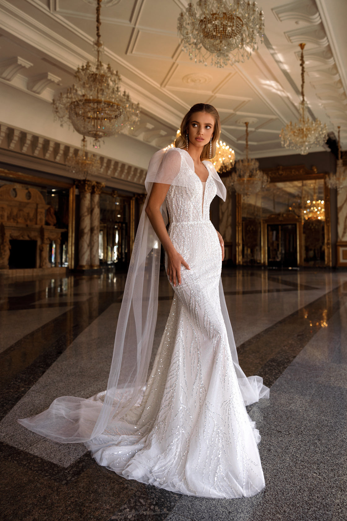 Type of wedding dress: mermaid dress with tulle capes on the shoulders.
