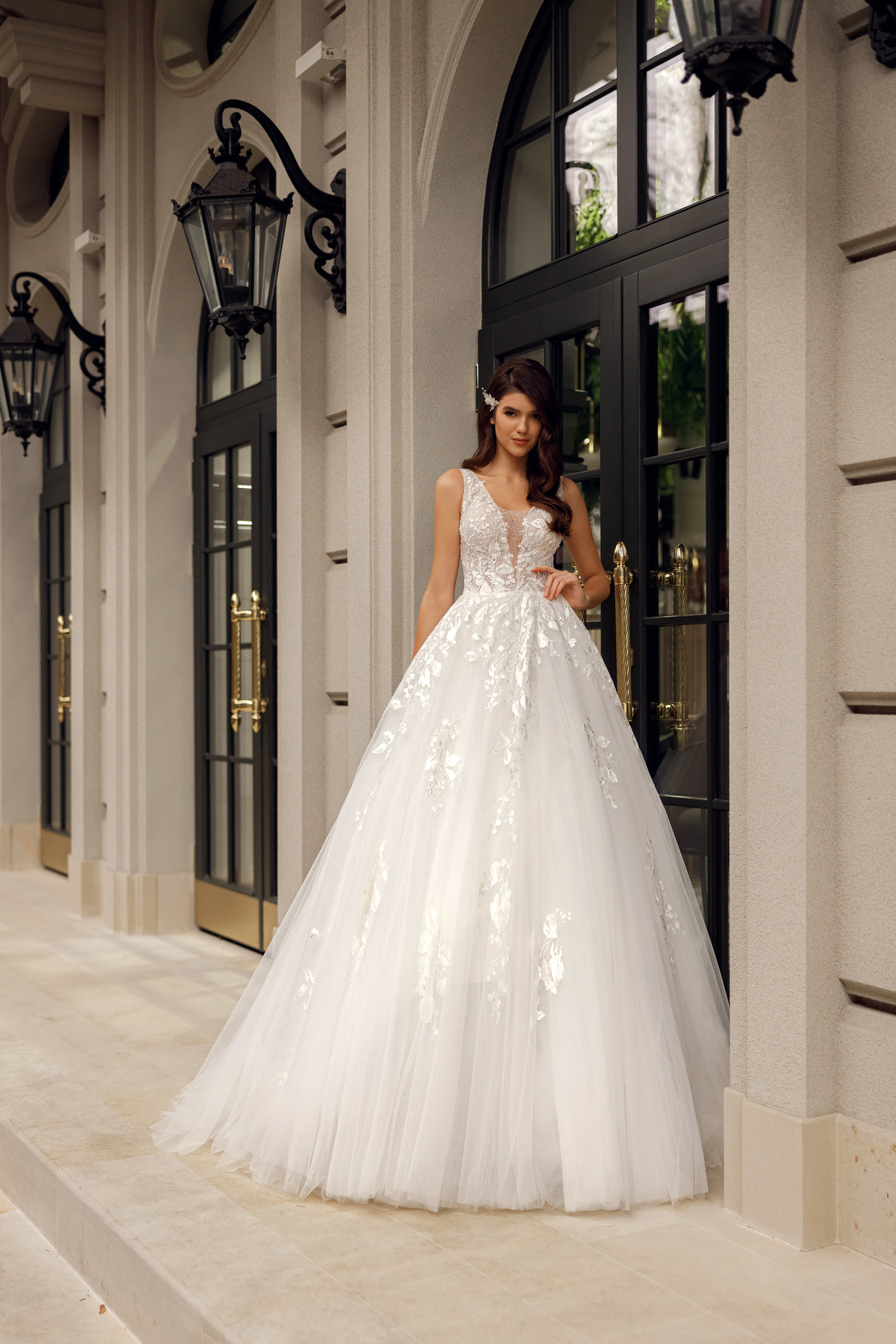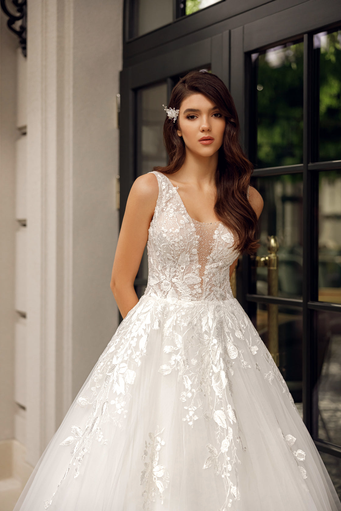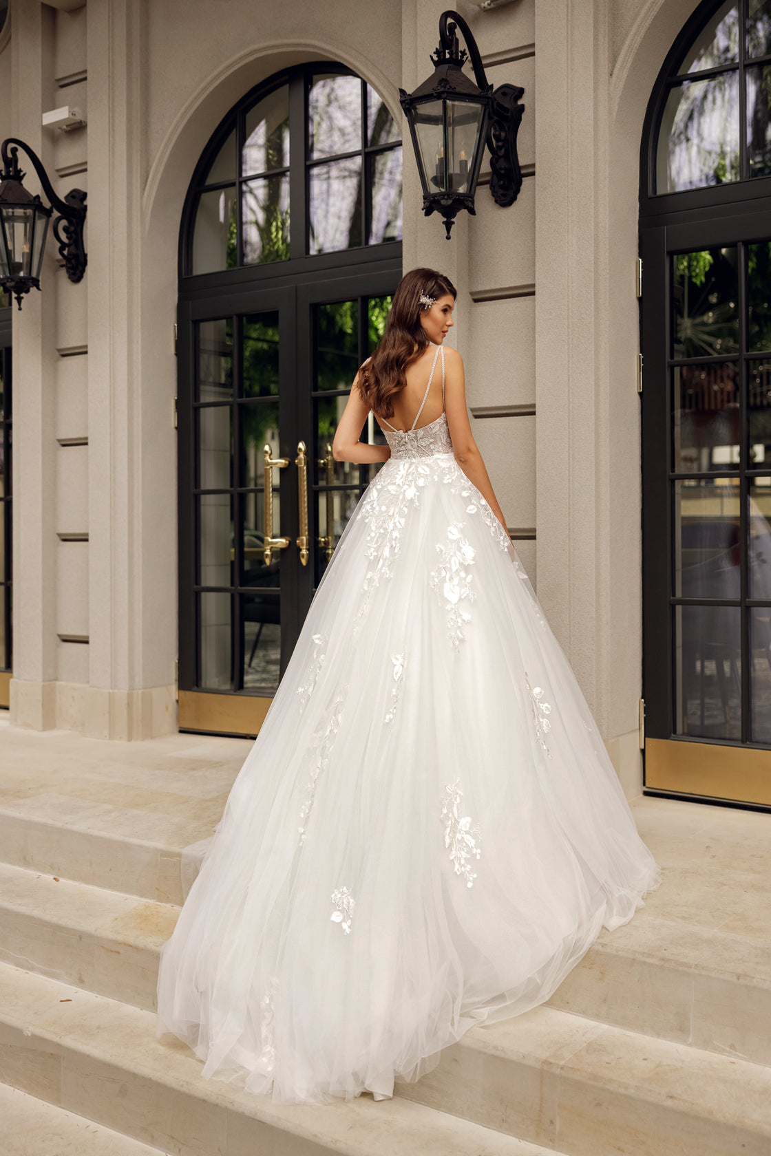 Type of wedding dress: fluffy princess-style dress with thin straps.