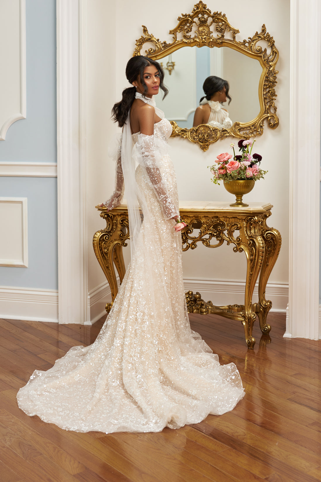 Turn heads with this dramatic mermaid gown, featuring a unique halter neckline and intricate lace detailing. The dress showcases a fitted bodice with a sheer overlay, adorned with exquisite beading and lace appliqués. The illusion sleeves and mermaid silhouette with a sweeping train create a breathtaking and elegant look, perfect for weddings, formal events, and special occasions. This dress combines modern sophistication with timeless elegance.