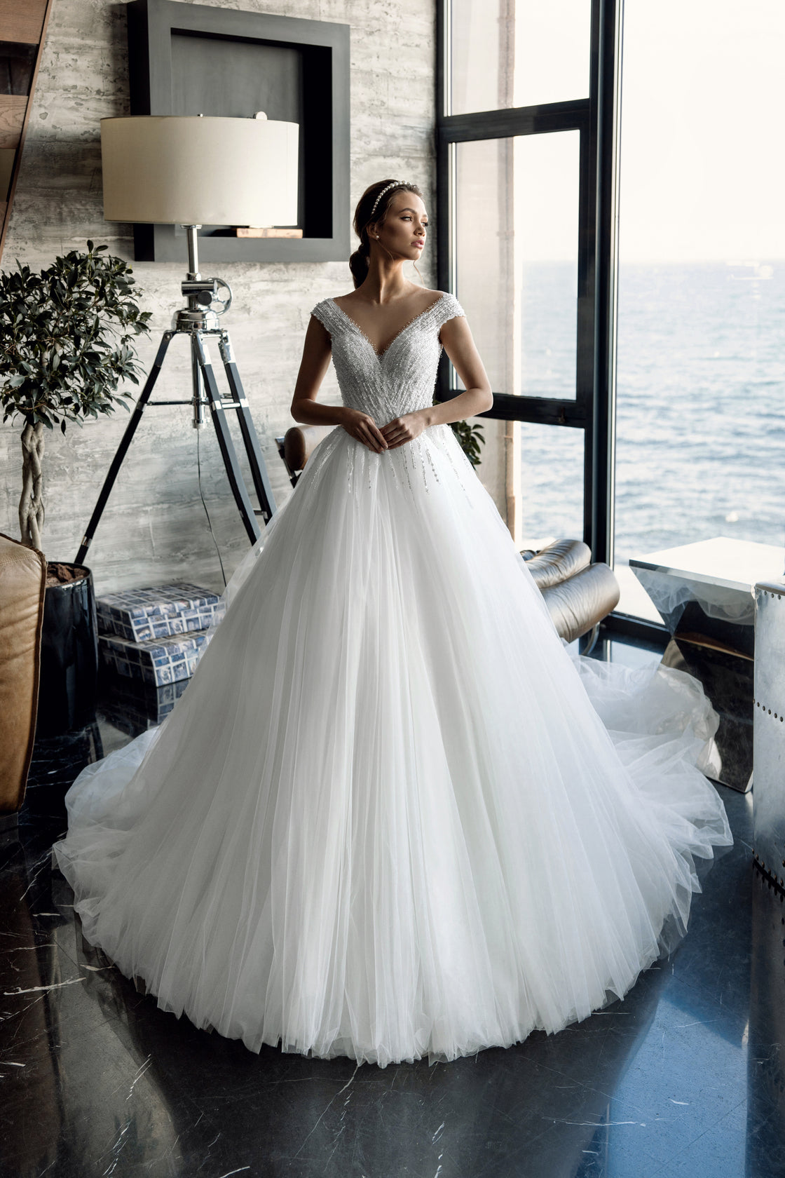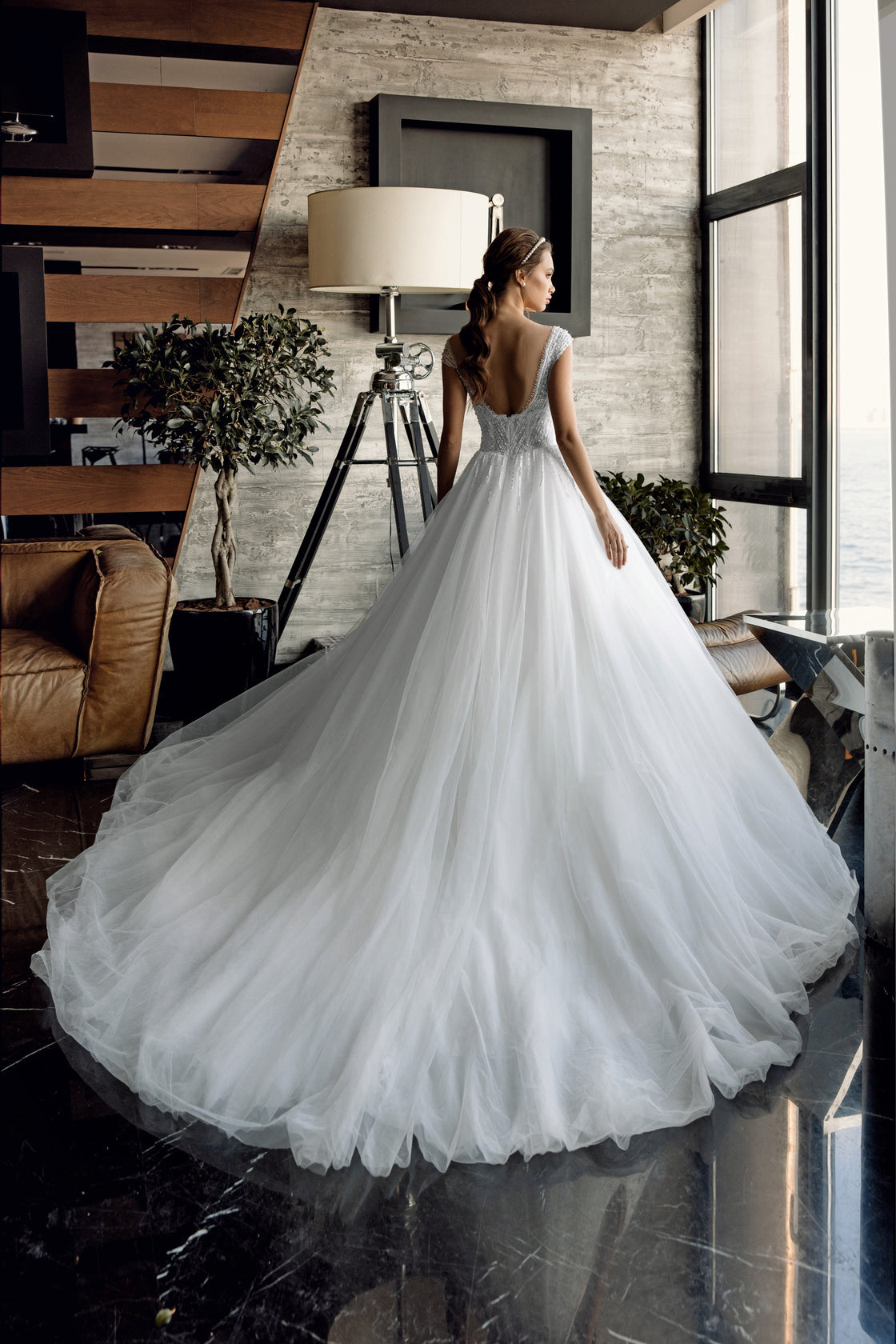 Color and materials: dress has ivory transparent corset with nude insert, which is embroidered with crystals, beeds and stones by our masters, ivory tulle skirt