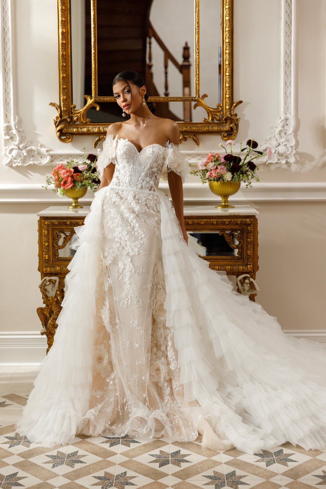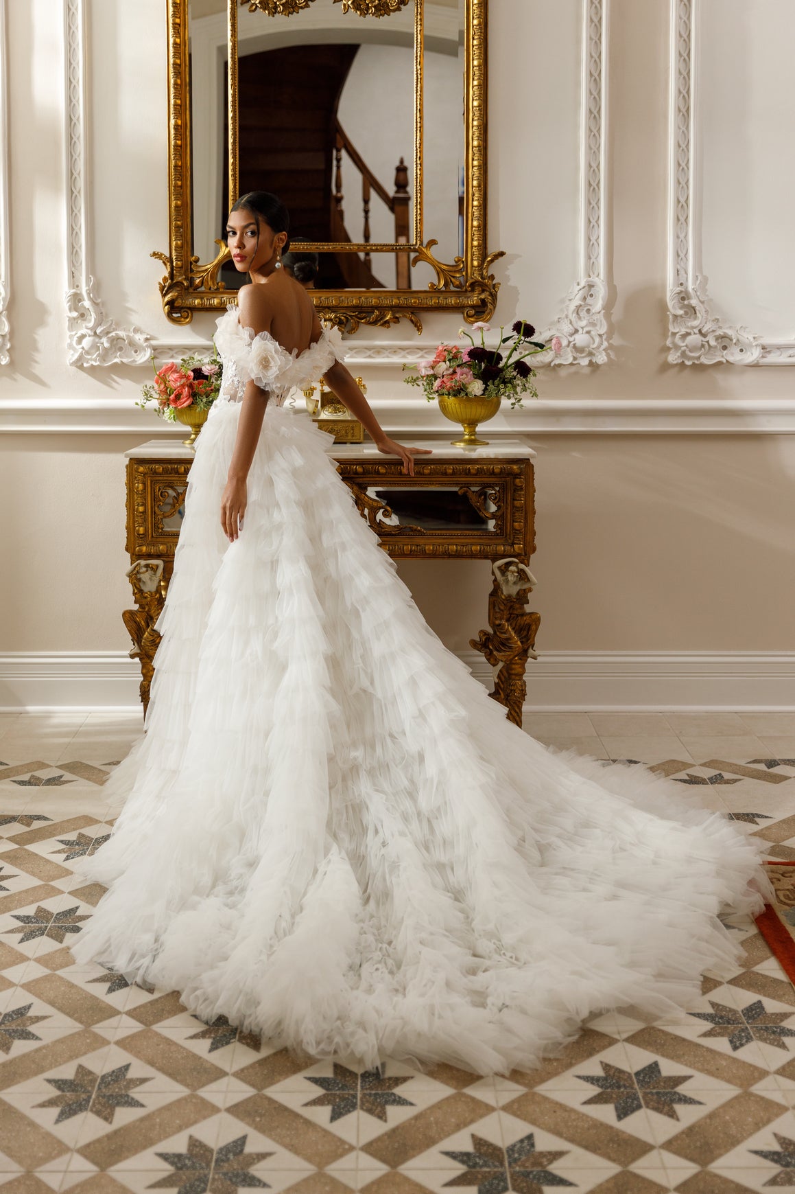 - Skirt: Detachable. Ball gown silhouette with voluminous tulle layers