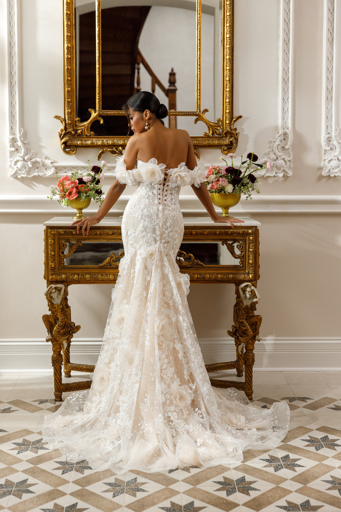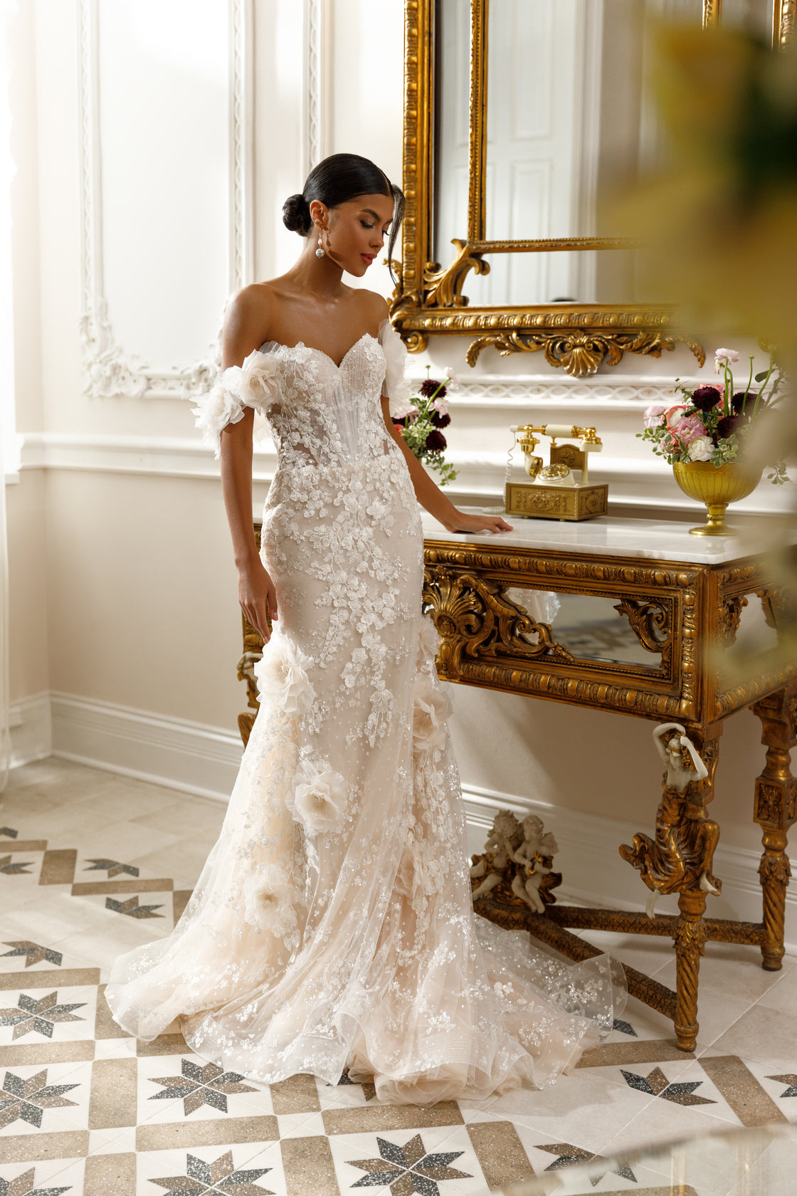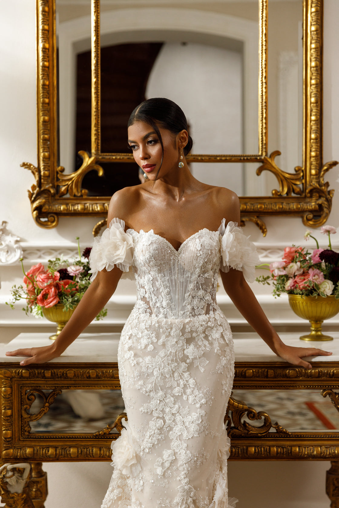 Step into a fairytale with this magnificent off-the-shoulder ball gown, adorned with exquisite floral lace appliqués and a voluminous tulle skirt. The dress features a sweetheart neckline with delicate off-the-shoulder sleeves, creating a romantic and enchanting look. The fitted bodice is beautifully embellished, leading into a cascading skirt with layers of tulle for a dramatic and regal silhouette. Ideal for weddings, formal events, and special occasions, this dress is designed to make you feel like royalty.