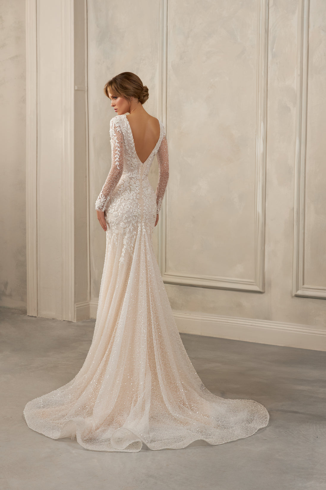 Unveil your inner glamour with this exquisite long-sleeve mermaid gown, featuring a deep V-neckline and intricate floral lace appliqués. The dress is designed with sheer illusion sleeves embellished with delicate beading, creating a stunning and sophisticated look. The fitted bodice gracefully transitions into a mermaid silhouette with a subtle train, perfect for weddings, formal events, and special occasions. This dress exudes elegance and timeless beauty.