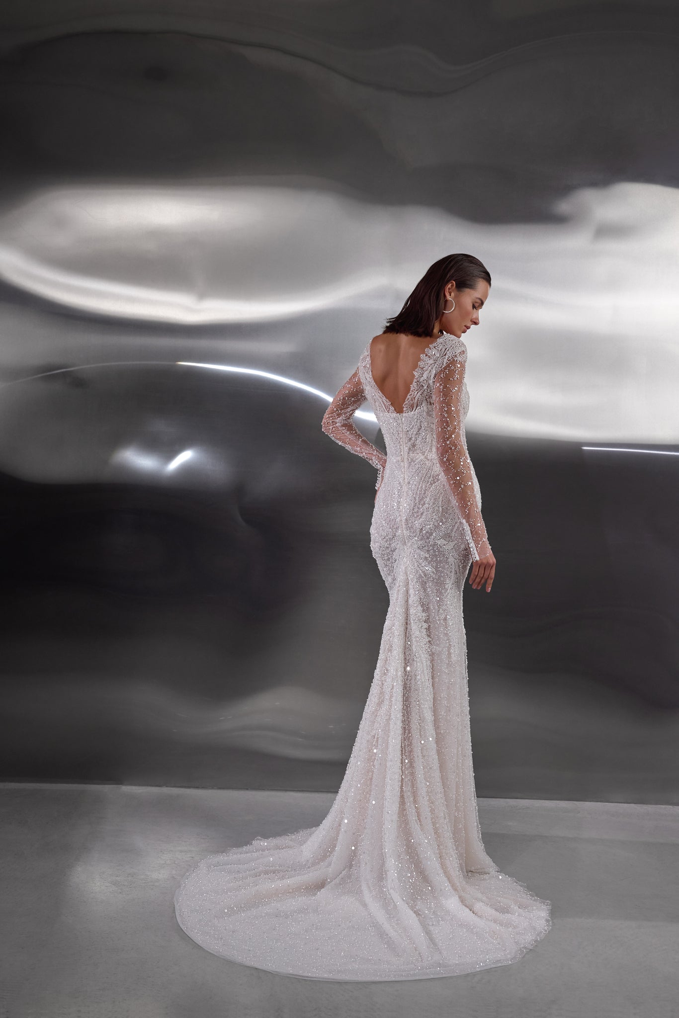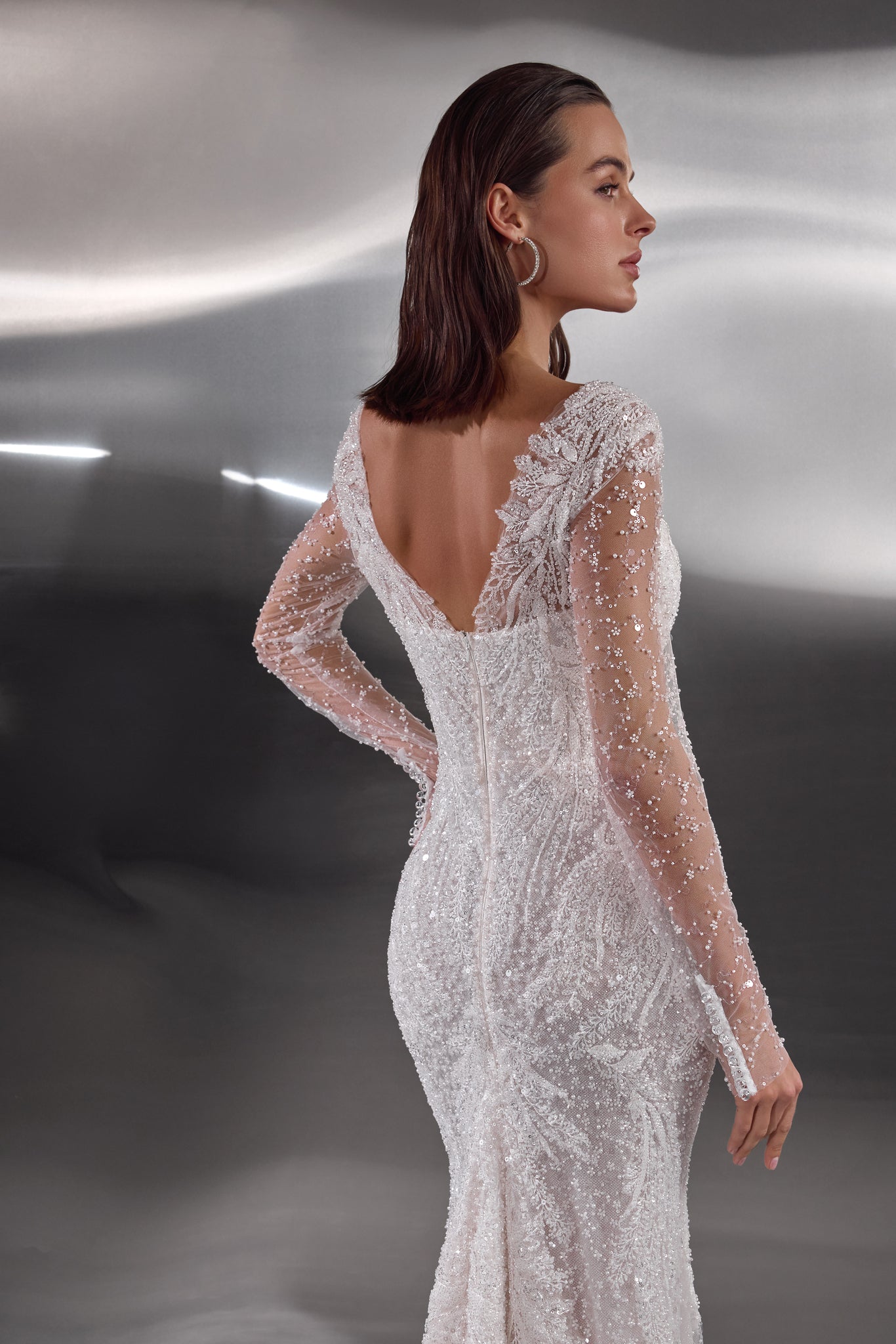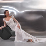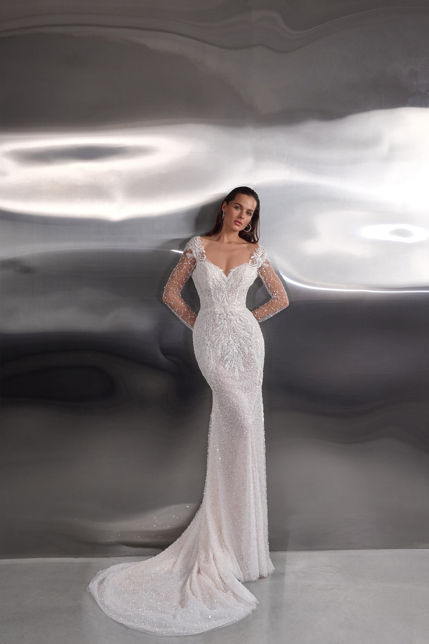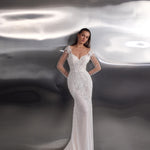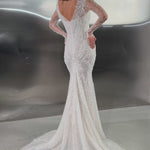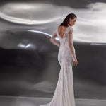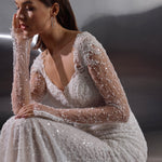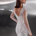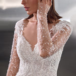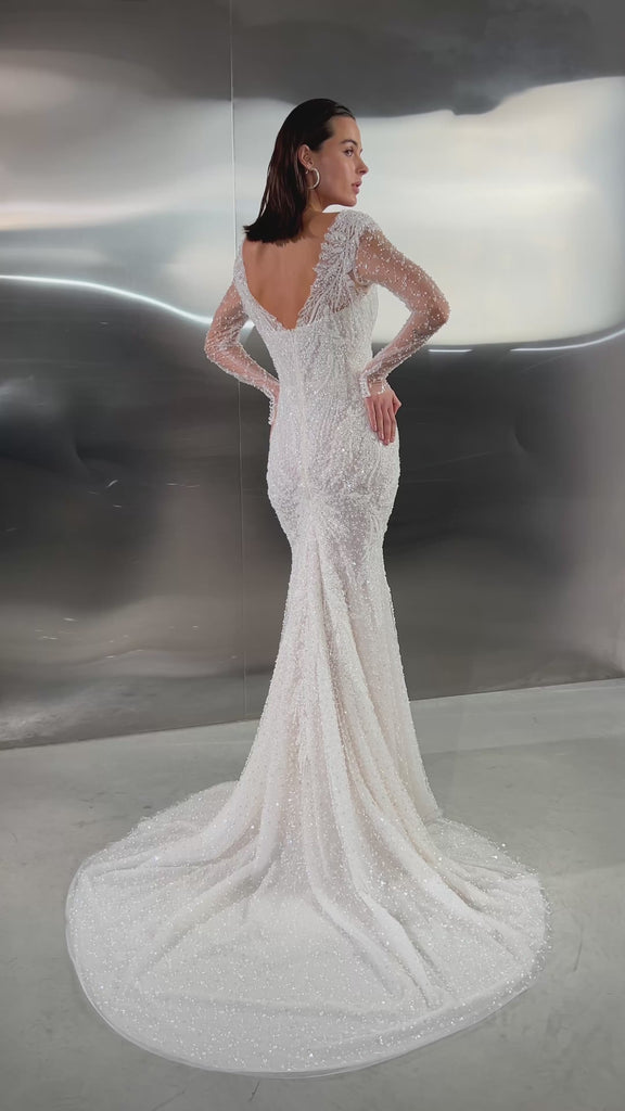 A dazzling celebration of craftsmanship, this fitted wedding dress shimmers from every angle with its all-over beaded embellishments. The illusion long sleeves and bodice are adorned with intricate pearl and sequin detailing, creating a refined yet glamorous effect. A deep V-neckline elongates the figure, while the sheer back offers an elegant glimpse of skin. The softly flared skirt and sweeping train complete the look, ensuring a show-stopping entrance and unforgettable exit.