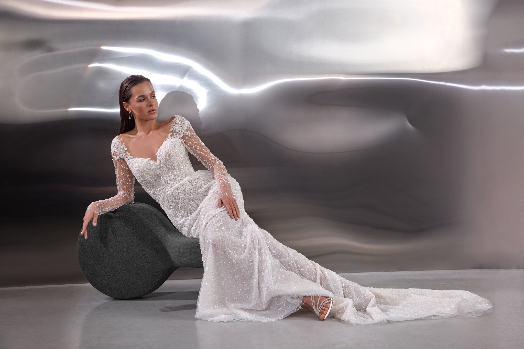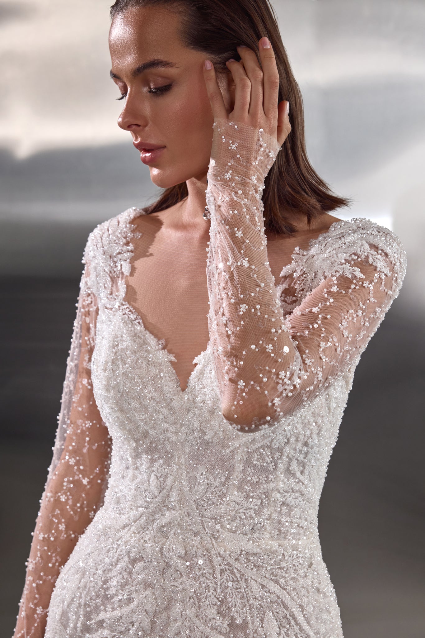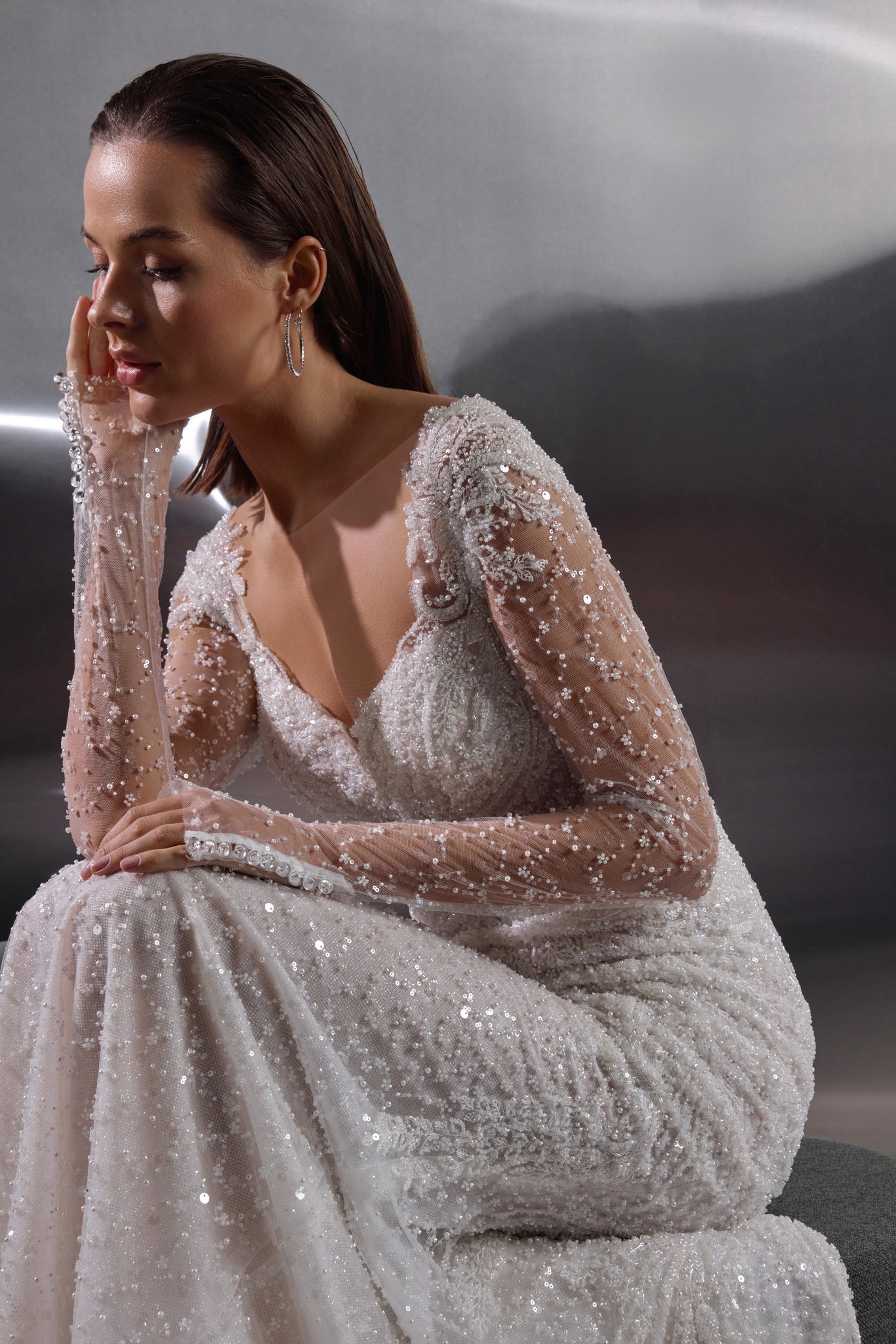A dazzling celebration of craftsmanship, this fitted wedding dress shimmers from every angle with its all-over beaded embellishments. The illusion long sleeves and bodice are adorned with intricate pearl and sequin detailing, creating a refined yet glamorous effect. A deep V-neckline elongates the figure, while the sheer back offers an elegant glimpse of skin. The softly flared skirt and sweeping train complete the look, ensuring a show-stopping entrance and unforgettable exit.