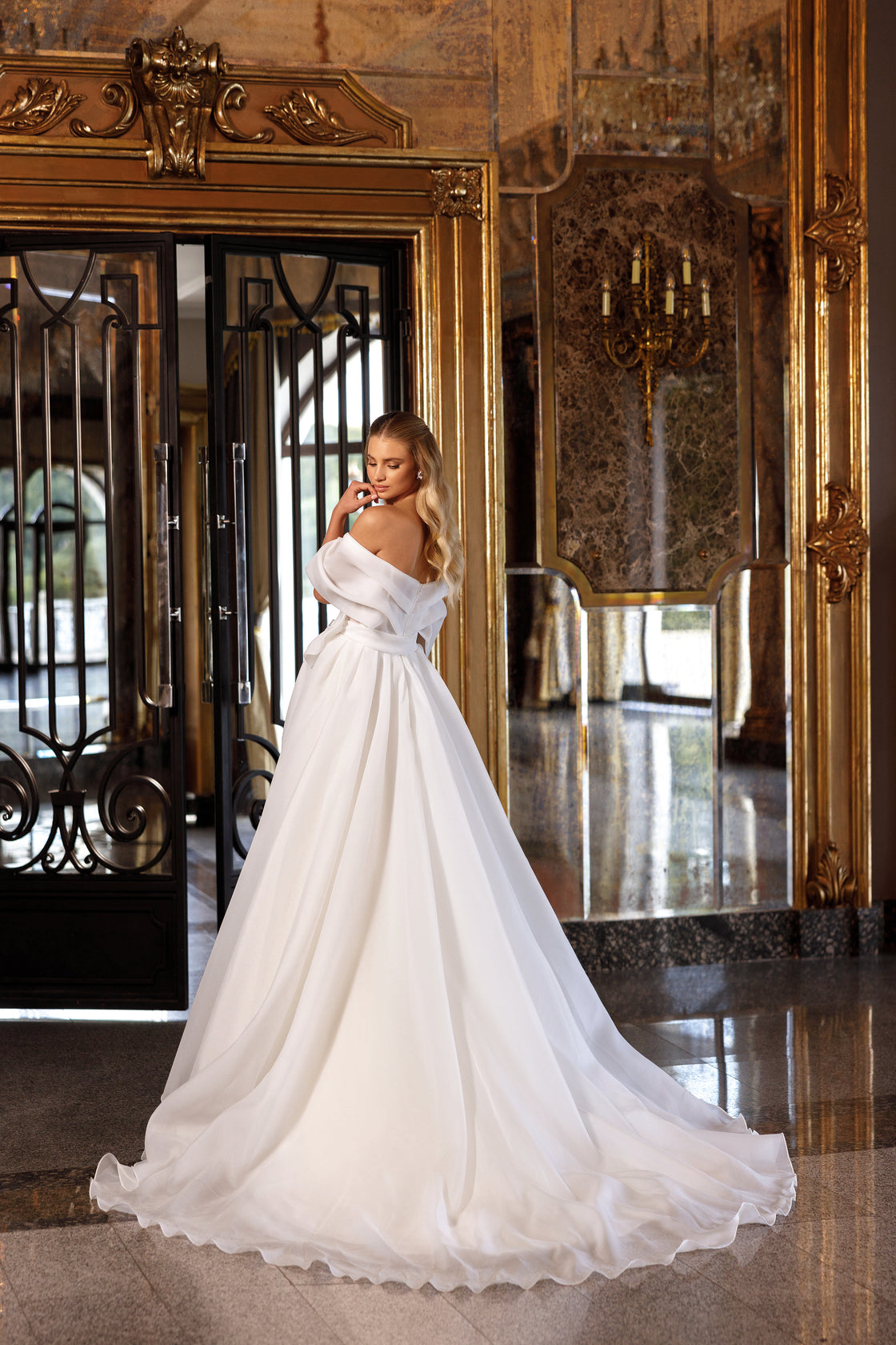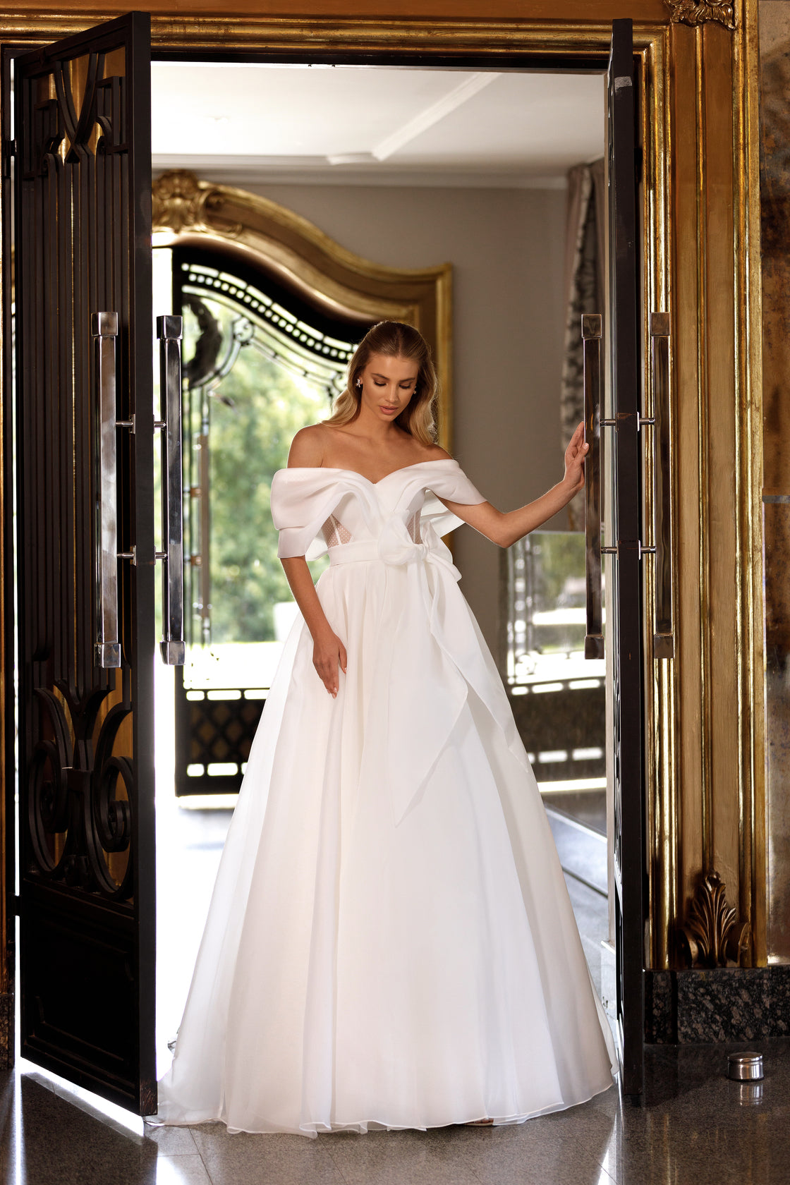 Color and materials: ivory color dress. Transparent glitter corset with original