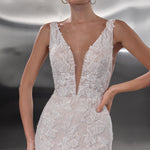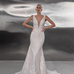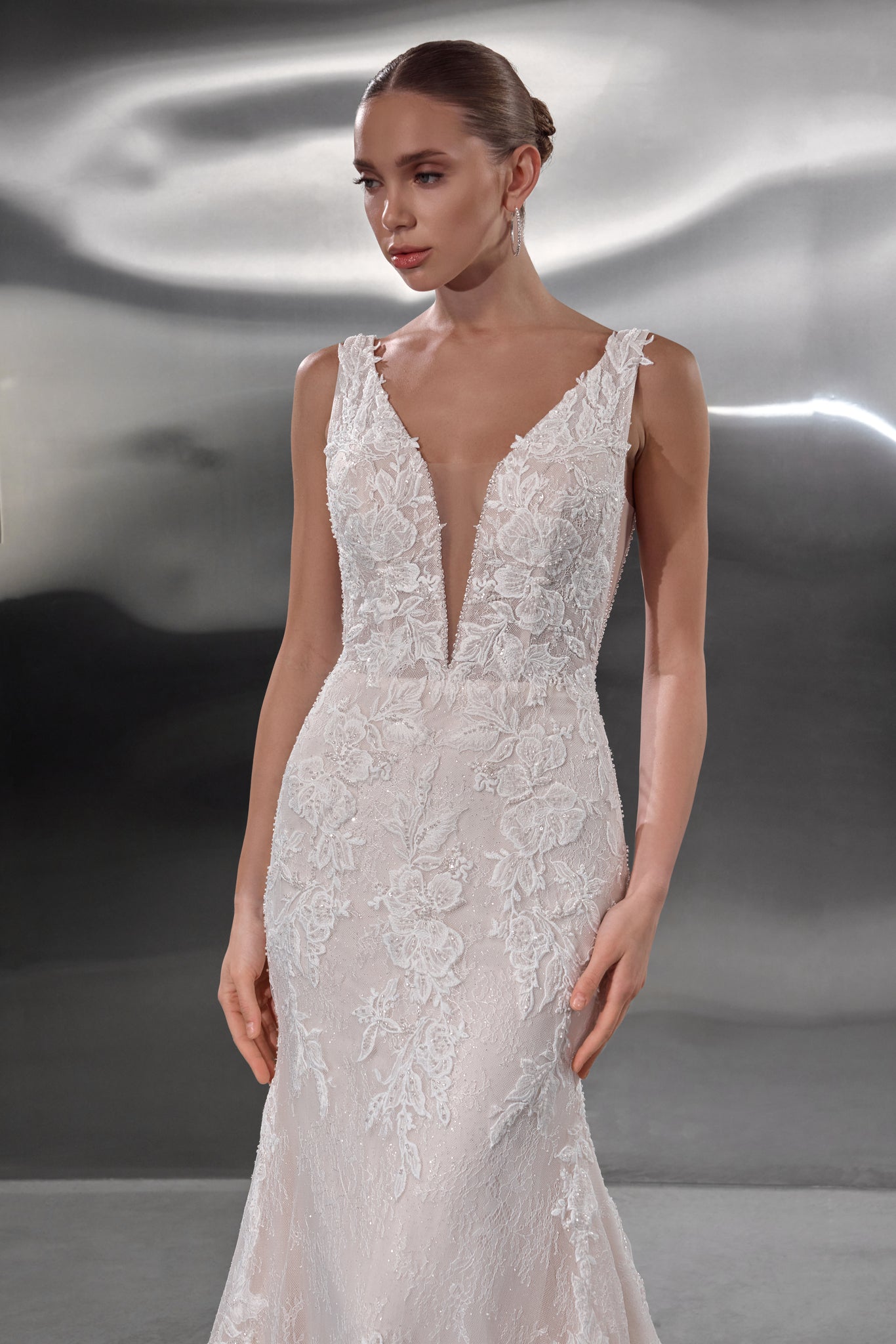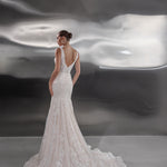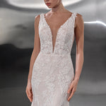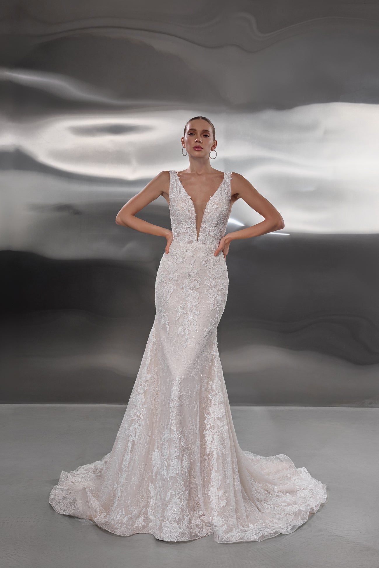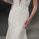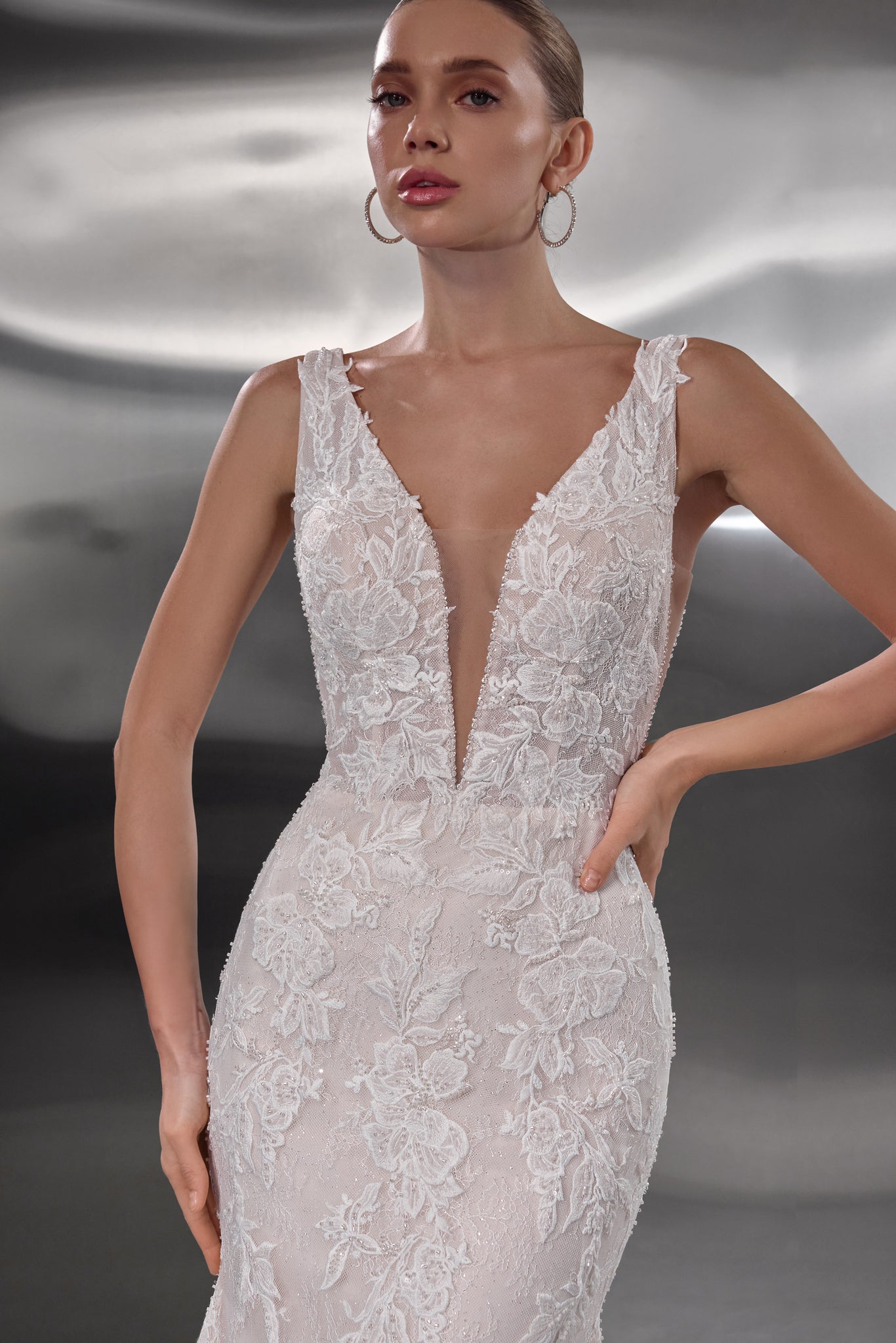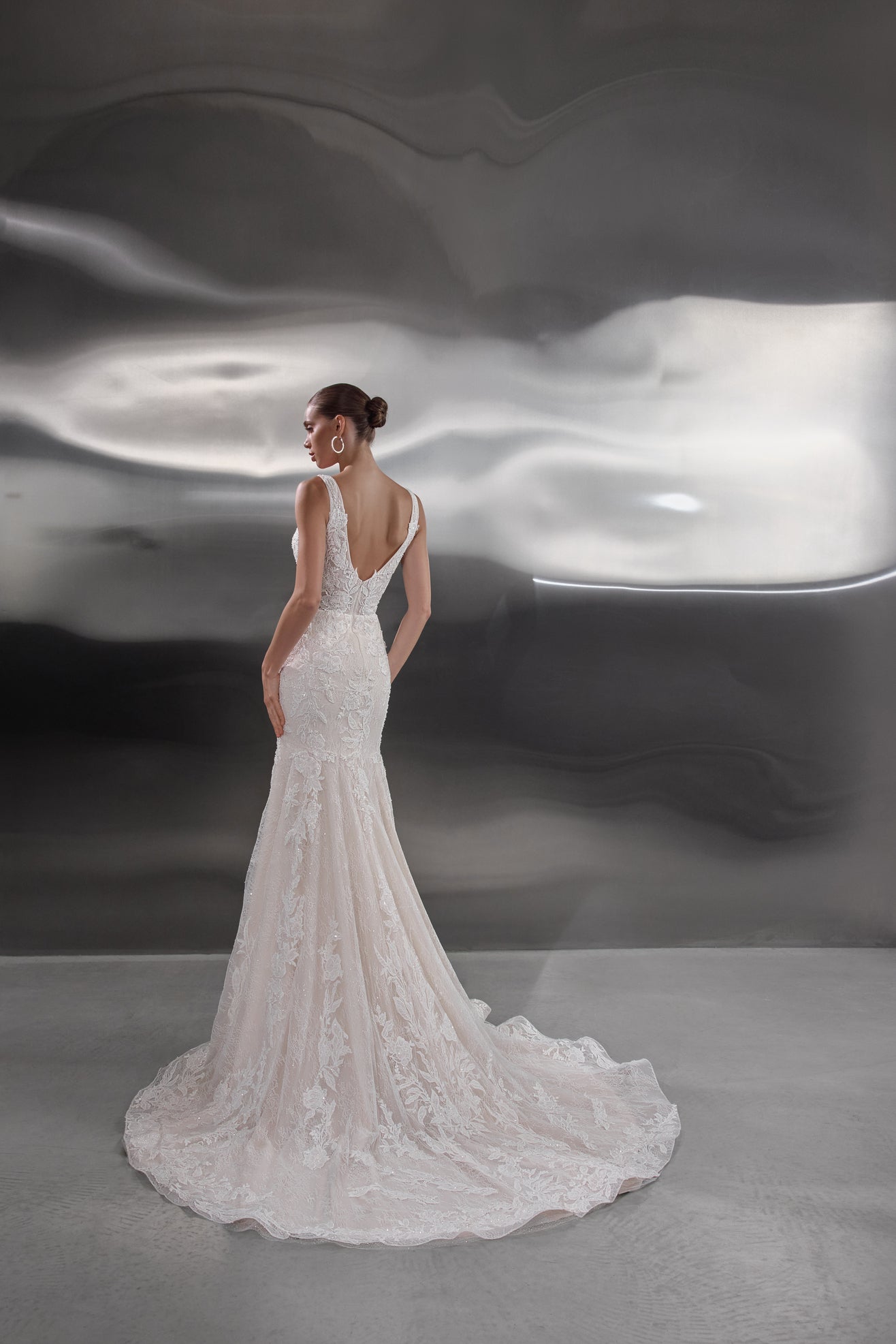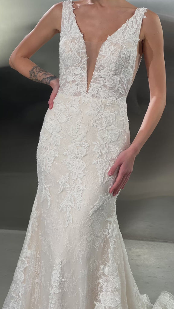 Sculpted to perfection, this fitted lace wedding dress blends timeless romance with modern elegance. The deep illusion plunge neckline draws the eye while offering a flattering elongation of the torso. Exquisite floral lace appliqués cascade throughout the gown, enhancing the silhouette with texture and dimension. A low V-back adds an alluring touch, while the fitted skirt flows seamlessly into a graceful chapel-length train, creating a captivating look from every angle.