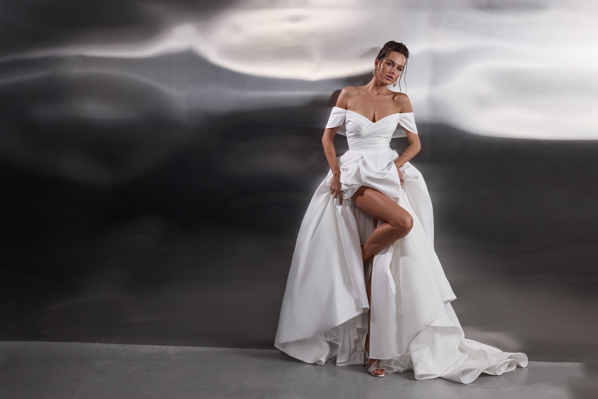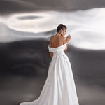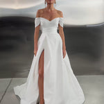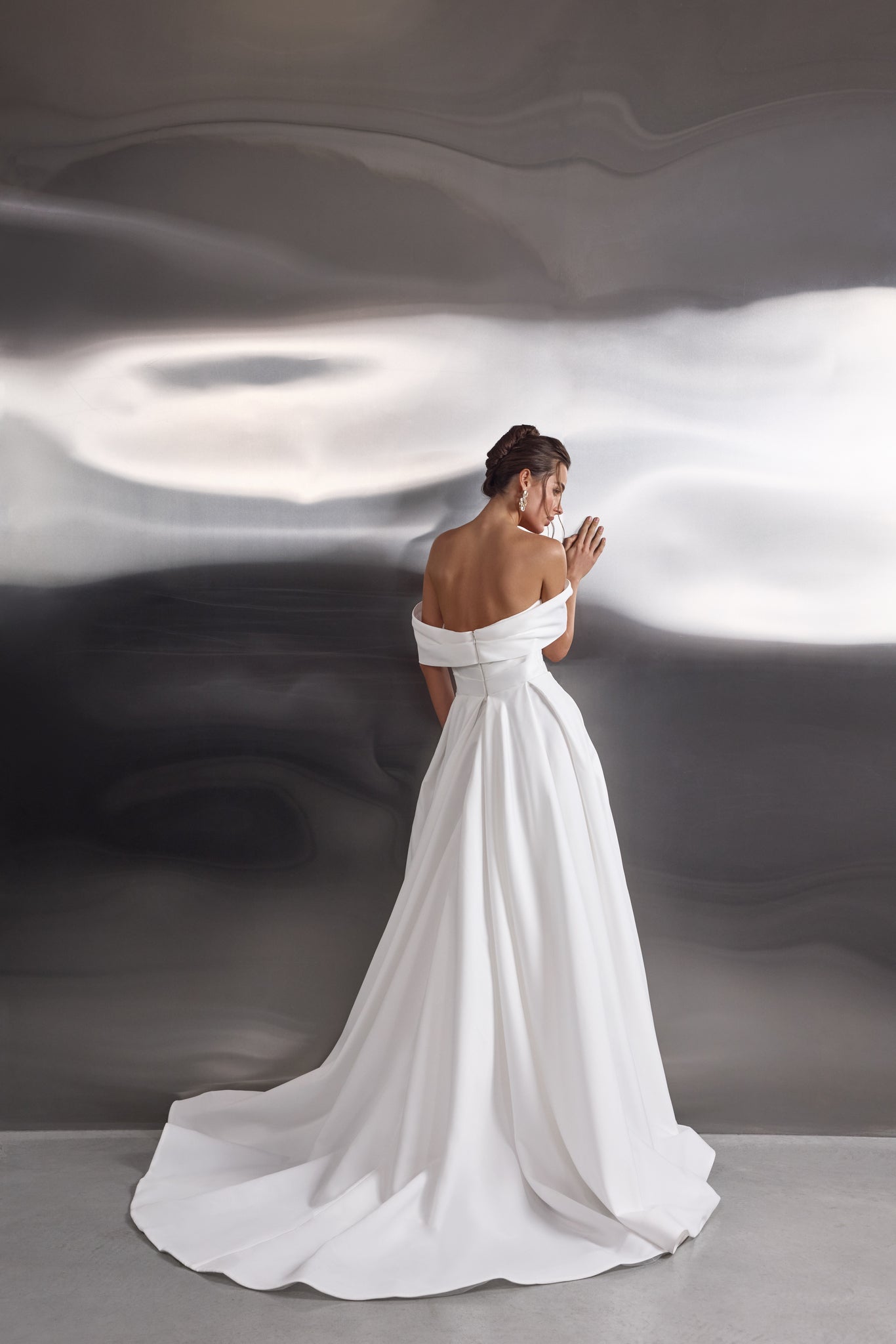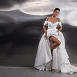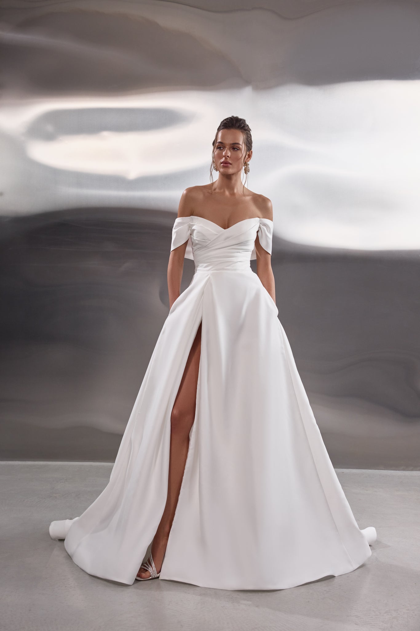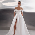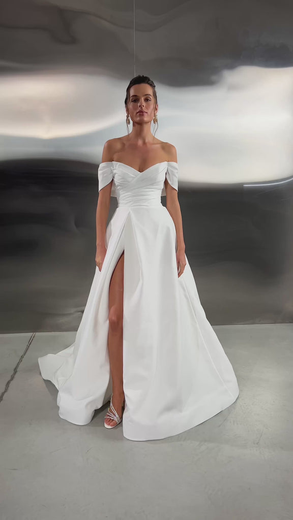 A striking blend of sophistication and modern edge, this off-the-shoulder satin wedding dress is designed to make a statement. The structured bodice features flattering pleated detailing that enhances the waistline, while the sweetheart neckline frames the décolleté with elegance. A daring thigh-high slit adds movement and allure, perfectly balancing the voluminous A-line skirt. The clean, open back flows into a sweeping chapel-length train, ensuring a breathtaking exit.