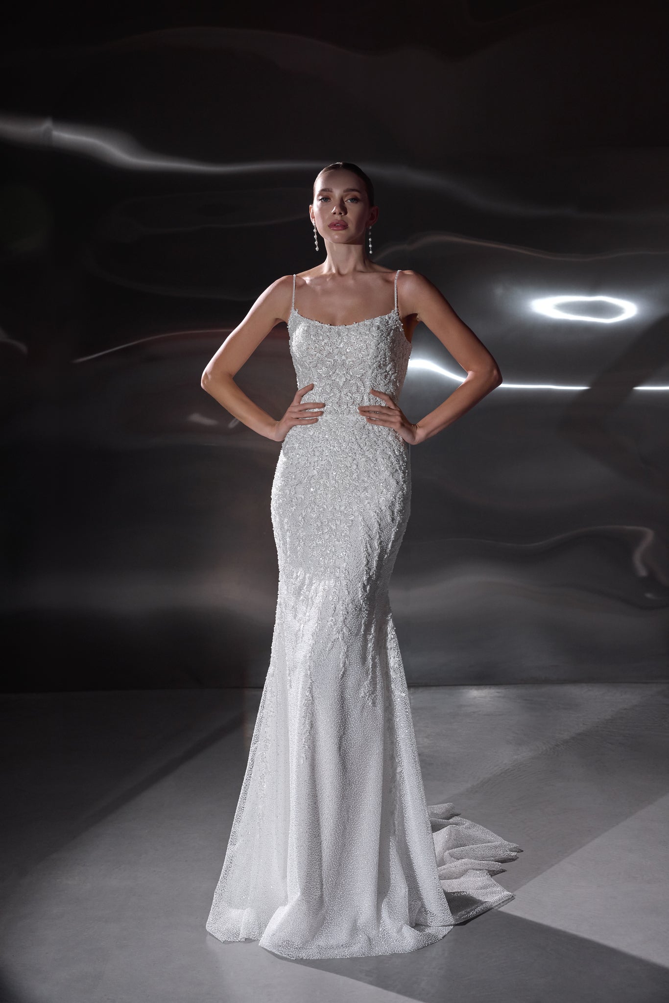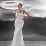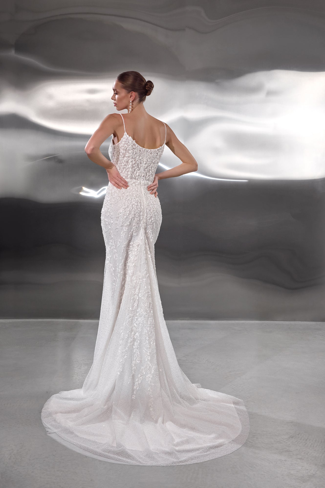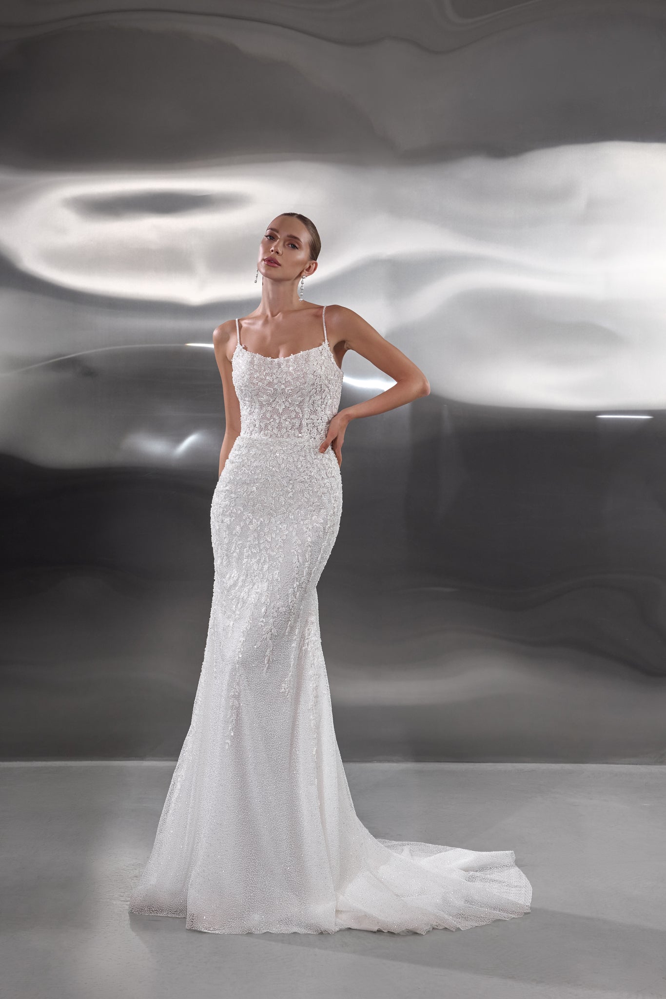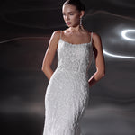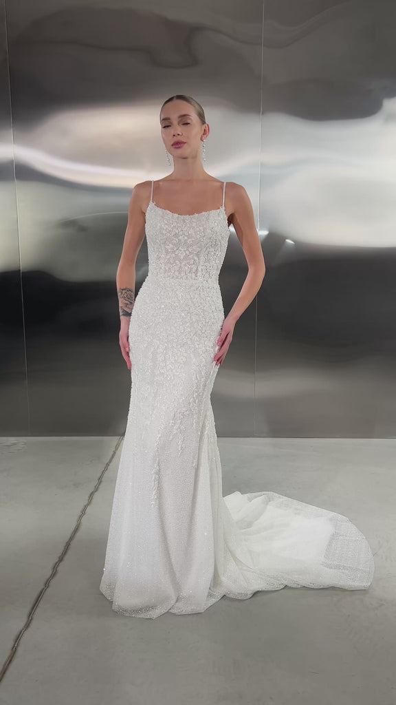 Radiating timeless elegance with a modern sparkle, this fitted wedding gown is adorned with all-over sequin and bead embellishments that shimmer beautifully with every step. The minimalist straight neckline, paired with delicate spaghetti straps, offers a refined and feminine frame. The figure-hugging silhouette highlights natural curves, while the low scoop back adds an alluring touch. Finished with a subtle sweep train, this gown is perfect for brides seeking understated glamour with a dazzling twist.