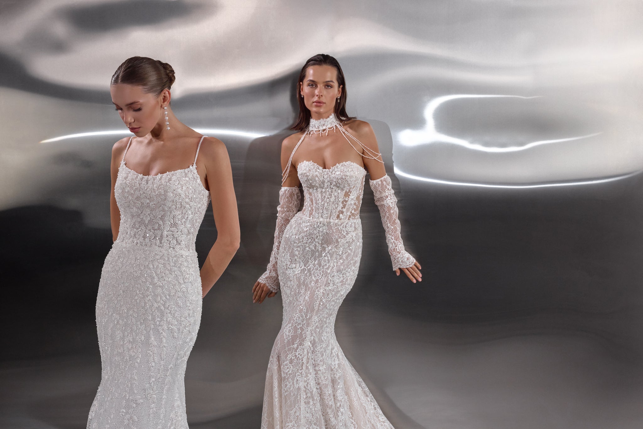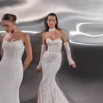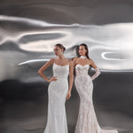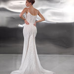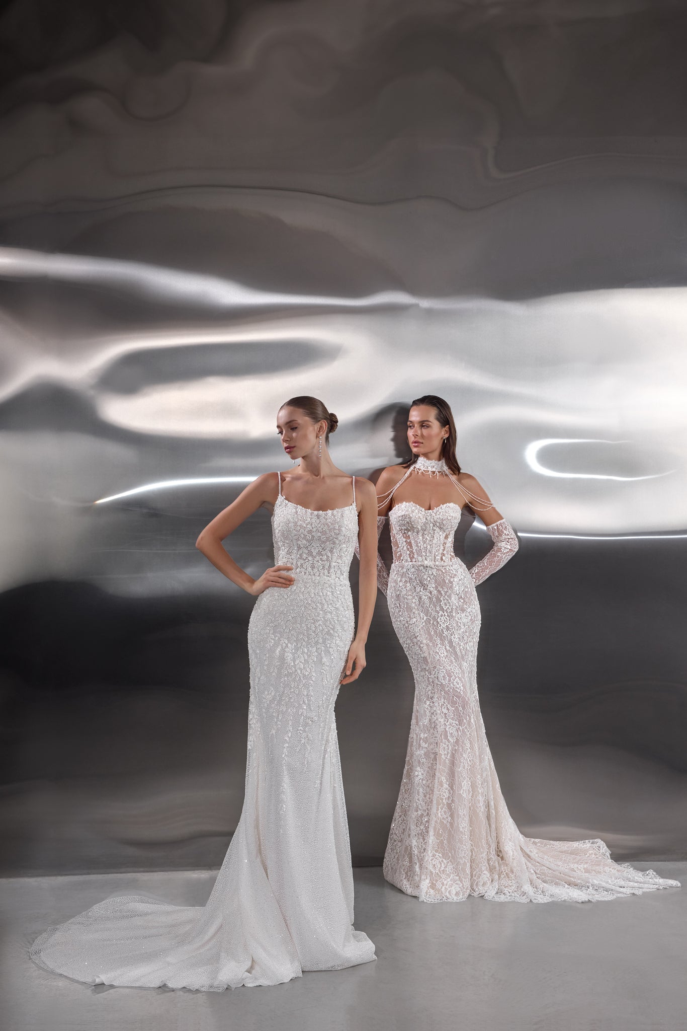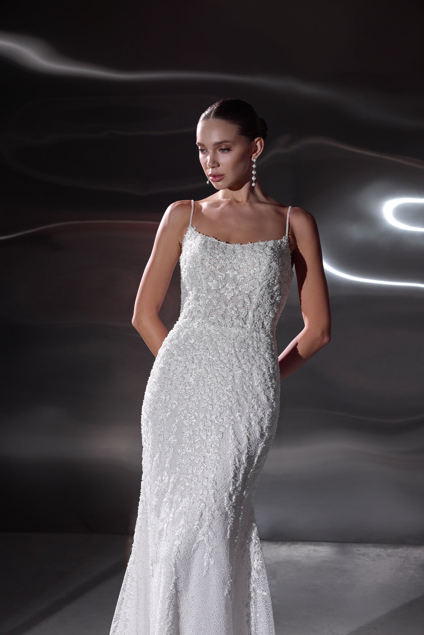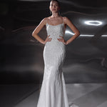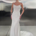 Radiating timeless elegance with a modern sparkle, this fitted wedding gown is adorned with all-over sequin and bead embellishments that shimmer beautifully with every step. The minimalist straight neckline, paired with delicate spaghetti straps, offers a refined and feminine frame. The figure-hugging silhouette highlights natural curves, while the low scoop back adds an alluring touch. Finished with a subtle sweep train, this gown is perfect for brides seeking understated glamour with a dazzling twist.