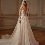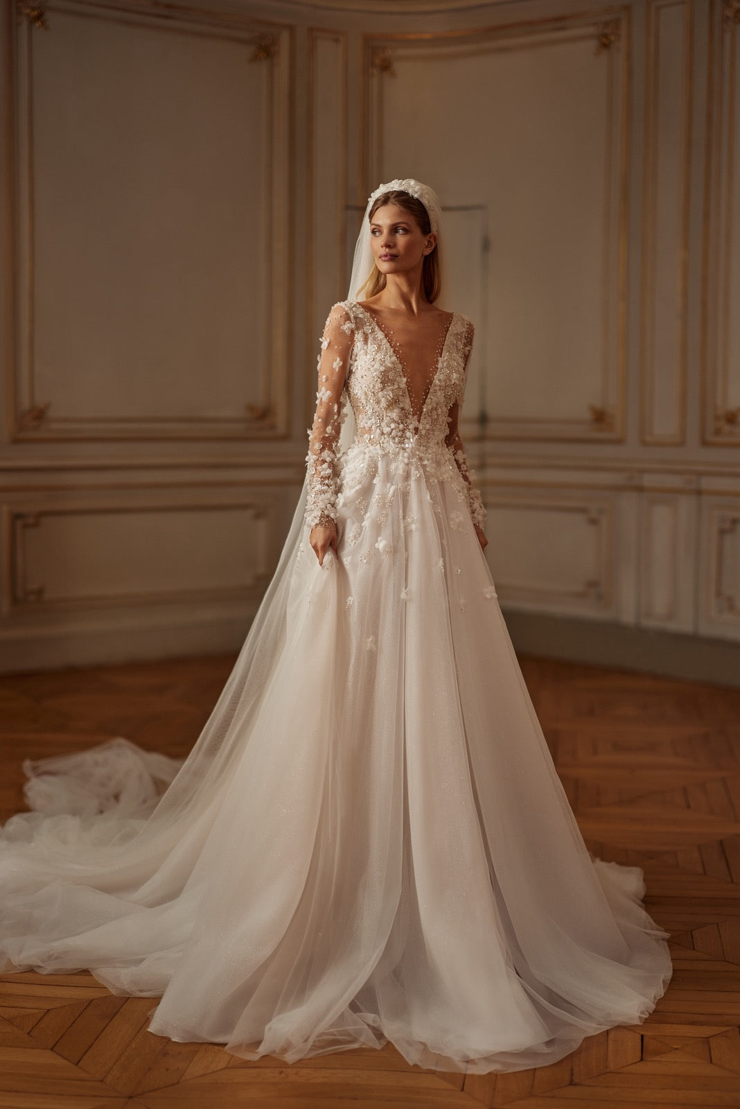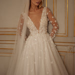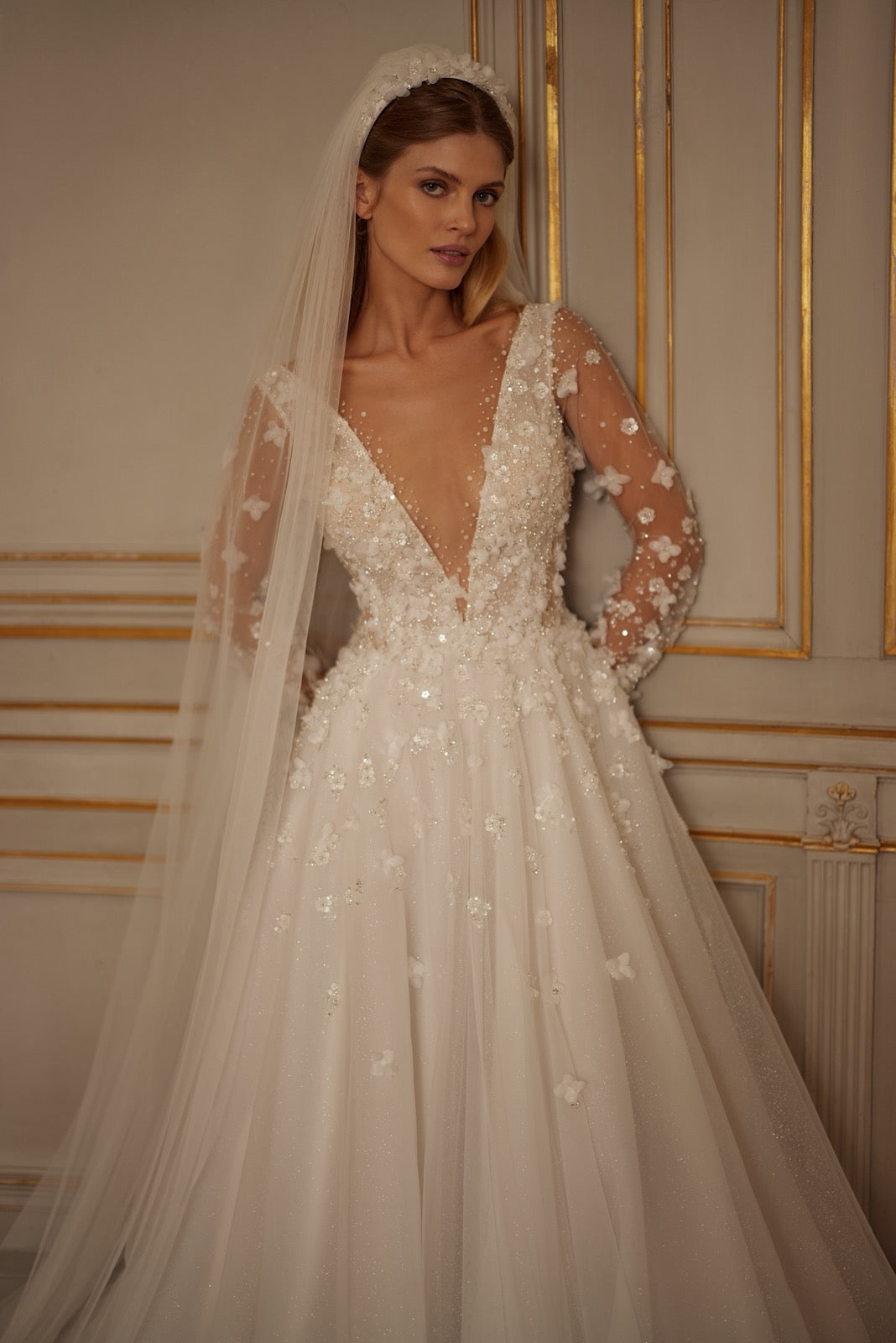 This enchanting veil is the embodiment of Romantic Grandeur. Crafted from soft tulle, it features delicately placed 3D flowers and pearls that echo the embellishments of the gown beneath. The lightweight design drapes gracefully, creating a cohesive, couture look perfect for the bride who dreams of sparkle, texture, and timeless beauty.